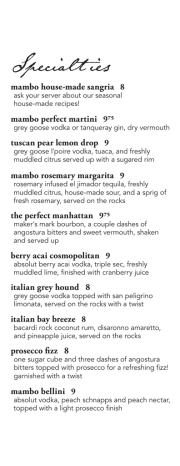 Specialt ies mambo house-made sangria 8 ask your server about our seasonal house-made recipes! mambo perfect martini 975 grey goose vodka or tanqueray gin, dry vermouth tuscan pear lemon drop 9 grey goose l'poire vodka, tuaca, and freshly muddled citrus served up with a sugared rim mambo rosemary margarita 9 rosemary infused el jimador tequila, freshly muddled citrus, house-made sour, and a sprig of fresh rosemary, served on the rocks the perfect manhattan 975 maker's mark bourbon, a couple dashes of angostura bitters and sweet vermouth, shaken and served up berry acai cosmopolitan 9 absolut berry acai vodka, triple sec, freshly muddled lime, finished with cranberry juice italian grey hound 8 grey goose vodka topped with san peligrino limonata, served on the rocks with a twist italian bay breeze 8 bacardi rock coconut rum, disaronno amaretto, and pineapple juice, served on the rocks prosecco fizz 8 one sugar cube and three dashes of angostura bitters topped with prosecco for a refreshing fizz! garnished with a twist mambo bellini 9 absolut vodka, peach schnapps and peach nectar, topped with a light prosecco finish Vino Rosso house wine 650 / 27 cabernet sauvignon, merlot, syrah, cab franc blend Columbia Valley, Washington piccini chianti 7 / 28 Tuscany, Italy il bastardo sangiovese 650 / 27 Abruzzo, Italy della scalla montepulciano 750 / 27 Abruzzo, Italy colosi rosso 650 / 25 Sicily, Italy damilano barbera d'asti 750 / 30 Piedmont, Italy foris pinot noir 850 / 33 Rogue Valley, Oregon cline syrah 7 / 27 Sonoma, California domaine bousquet organic malbec 850 / 33 Tupangato, Argentina gnarly head old vine zinfandel 7 / 28 Manteca, California bv coastal merlot 750 / 30 Sonoma, California sagelands cabernet sauvignon 750 / 30 Columbia Valley, Washington liberty school cabernet sauvignon 8 / 32 Paso Robles, California ruffino reserva ducale chianti classico 37 bottle Tuscany, Italy seven hills cabernet sauvignon 37 bottle Walla Walla, Washington Vino Bianco valdo prosecco brut 8 / 30 Veneto, Italy voga pinot grigio 7 / 28 Delle Venezie, Italy concannon sauvignon blanc 7 / 28 Central Coast, California duck pond pinot gris 750 / 30 Dundee, Oregon milbrandt riesling 750 / 30 Mattawa, Washington coastal vines chardonnay 650 / 25 Sonoma, California edna valley chardonnay 8 / 30 San Luis Obispo, California Draft Beer birra morreti italian lager 525/pint draft microbrews 475/pint Ask your server about our selection of local and imported draft beers beck's non-alcoholic 4/bottle Beverages pepsi, diet pepsi, dr. pepper, sierra mist, ginger ale 225 shirley temple, roy rogers, iced tea, lemonade, arnold palmer 250 italian soda 325 raspberry, strawberry, cherry, blackberry, vanilla, or orange, with half & half and whipped cream juice 250 cranberry, orange, grapefruit, tomato, pineapple san pellegrino 3 sparkling water, limonata, aranciata thomas kemper root beer 325 tea or coffee 250 hot chocolate or apple cider 3 Espresso single / double shot 2 / 250 extra flavor or shot .75