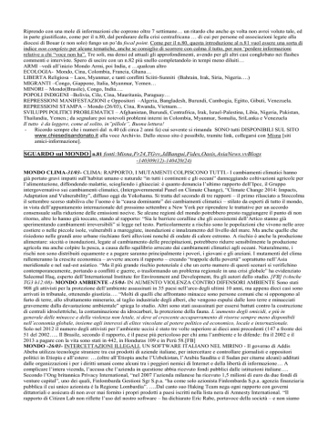 Riprendo con una mole di informazioni che coprono oltre 7 settimane… un ritardo che anche qs volta non avrei voluto tale, ed in parte giustificato, come per il n.80, dal perdurare della crisi centrafricana … di cui per persone ed associazioni legate alla diocesi di Bouar (e non solo) fungo un po’da focal point. Come per il n.80, questa introduzione al n.81 vuol essere una sorta di indice non completo per alcune tematiche, anche se consiglio di scorrere con calma il tutto, per non ‘perdere informazioni relative a chi “voce non ha”. Tre soli, ma densi ed attuali gli approfondimenti, avendo per gli altri casi conglobato nei flashes commenti e interviste. Spero di uscire con un n.82 più snello completandolo in tempi meno diluiti… ARMI –vedi all’inizio Mondo Armi, poi India, e …qualcun altro ECOLOGIA- Mondo, Cina, Colombia, Francia, Ghana… LIBERTA Religiosa – Laos, Myanmar, e tanti conflitti Sciiti-Sunniti (Bahrain, Irak, Siria, Nigeria….) MIGRANTI –Congo, Giappone, Italia, Myanmar, Yemen… MINORI – Mondo(Brasile), Congo, India…. POPOLI INDIGENI –Bolivia, Cile, Cina, Mauritania, Paraguay… REPRESSIONI MANIFESTAZIONI e Oppositori –Algeria, Bangladesh, Burundi, Cambogia, Egitto, Gibuti, Venezuela. REPRESSIONI STAMPA – Mondo (26/03), Cina, Rwanda, Vietnam… SVILUPPI POLITICI PROBLEMATICI – Afghanistan, Burundi, Centrafrica, Irak, Israel-Palestina, Libia, Nigeria, Pakistan, Thailandia, Yemen.; da segnalare poi notevoli problemi interni in Colombia, Myanmar, Somalia, SriLanka e Venezuela Il tutto è da leggere, come al solito, in”pillole”, Buona lettura! - Ricordo sempre che i numeri dal n.40 (di circa 2 anni fa) cui sovente si rimanda SONO tutti DISPONIBILI SUL SITO www.chiesedisandonato.it alla voce Archivio. Dallo stesso sito è possibile, tramite link, collegarsi con Misna [siti amici-informazione]. SGUARDO sul MONDO n.81 fonti:Misna,Fr24,TGvv,JdBangui,Fides,Oasis,AsiaNews.vvBlogs -140309(12)-140420(24) MONDO CLIMA-31/03- CLIMA: RAPPORTO, I MUTAMENTI COLPISCONO TUTTI.- I cambiamenti climatici hanno già portato gravi impatti sull’habitat umano e naturale “in tutti i continenti e gli oceani” danneggiando coltivazioni agricole per l’alimentazione, diffondendo malattie, sciogliendo i ghiacciai: è quanto denuncia l’ultimo rapporto dell’Ipcc, il Gruppo intergovernativo sui cambiamenti climatici, (Intergovernmental Panel on Climate Change), “Climate Change 2014: Impacts, Adaptation and Vulnerability”, diffuso oggi da Yokohama. Si tratta del secondo di tre rapporti – il primo rilasciato a Stoccolma il settembre scorso stabiliva che l’uomo è la “causa dominante” dei cambiamenti climatici – stilato da esperti di tutto il mondo, in vista dell’appuntamento internazionale del prossimo settembre a New York per riprendere le trattative per un accordo consensuale sulla riduzione delle emissioni nocive. Se alcune regioni del mondo potrebbero presto raggiungere il punto di non ritorno, altre lo hanno già toccato, stando al rapporto: “Sia le barriere coralline che gli ecosistemi dell’Artico stanno già sperimentando cambiamenti irreversibili” si legge nel testo. Particolarmente a rischio sono le popolazioni che vivono nelle aree costiere o nelle piccole isole, vulnerabili a mareggiate, inondazioni e innalzamento del livello del mare. Ma anche quelle che risiedono nelle grandi aree urbane rischiano forti alluvioni nonché di ondate di calore estremo. A rischio è anche la produzione alimentare: siccità o inondazioni, legate al cambiamento delle precipitazioni, potrebbero ridurre sensibilmente la produzione agricola ma anche colpire la pesca, a causa dello squilibrio arrecato dai cambiamenti climatici agli oceani. Naturalmente, i rischi non sono distribuiti equamente e a pagare saranno principalmente i poveri, i giovani e gli anziani. I mutamenti del clima rallenteranno la crescite economica – avverte ancora il rapporto – creando “trappole della povertà” soprattutto nell’Asia meridionale e nel sud-est asiatico. “Ma il più grande rischio potenziale è che un certo numero di questi scenari si verifichino contemporaneamente, portando a conflitti e guerre, o trasformando un problema regionale in una crisi globale” ha evidenziato Saleemul Haq, esperto dell’International Institute for Environment and Development, fra gli autori dello studio. [FB] (vAnche TG3 h12:08)- MONDO AMBIENTE -15/04- IN AUMENTO VIOLENZA CONTRO DIFENSORI AMBIENTE Sono stati 908 gli attivisti per la protezione dell’ambiente assassinati in 35 paesi nell’arco degli ultimi 10 anni, ma appena dieci casi sono arrivati in tribunale, ottenendo giustizia…. “Molti di quelli che affrontano minacce sono persone comuni che si oppongono al furto di terre, allo sfruttamento minerario, al taglio industriale degli alberi, che vengono espulsi dalle loro terre e minacciati gravemente dalla devastazione ambientale” spiega lo studio. Altri sono stati assassinati per essersi battuti contro la costruzione di centrali idroelettriche, la contaminazione da idrocarburi, la protezione della fauna. L’aumento degli omicidi, e più in generale delle minacce e della violenza non letale, si deve al crescente accaparramento di risorse sempre meno disponibili nell’economia globale, insieme agli interessi di elites vincolate al potere politico ed economico, locale e internazionale. Solo nel 2012 il numero degli attivisti per l’ambiente uccisi è stato tre volte superiore ai dieci anni precedenti (147 a fronte dei 51 del 2002….. Il Brasile, secondo il rapporto, è il paese più pericoloso per chi ama l’ambiente e lo difende: fra il 2002 e il 2013 a pagare con la vita sono stati in 442, in Honduras 109 e in Perù 58.[FB] MONDO -26/03- INTERCETTAZIONI ILLEGALI, UN SOFTWARE ITALIANO NEL MIRINO - Il governo di Addis Abeba utilizza tecnologie straniere tra cui prodotti di aziende italiane, per intercettare e controllare giornalisti e oppositori politici in Etiopia e 