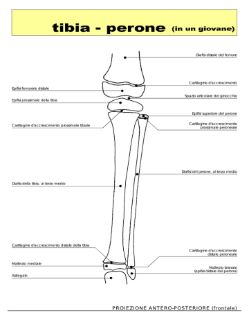 Diafisi distale del femore Cartilagine d'accrescimento Epifisi femorale distale Spazio articolare del ginocchio Epifisi prossimale della tibia Epifisi superiore del perone Cartilagine d'accrescimento prossimale tibiale Cartilagine d'accrescimento prossimale peroneale Diafisi del perone, al terzo medio Diafisi della tibia, al terzo medio Cartilagine d'accrescimento distale della tibia Cartilagine d'accrescimento distale peroneale Malleolo mediale Malleolo laterale (epifisi distale del perone) Astragalo PROIEZIONE ANTERO-POSTERIORE (frontale) Condilo mediale del femore Condilo esterno femorale Tuberosità, o condilo laterale della tibia Testa del perone Spazio articolare del ginocchio Tuberosità, o condilo interno della tibia Tuberosità tibiale anteriore Profilo corticale diafisario mediale tibiale Spazio interosseo Profilo corticale laterale diafisario tibiale Profilo corticale mediale diafisario del perone Profilo corticale laterale diafisario del perone Cosiddetto ‘terzo malleolo’ (tibiale) Estremità distale peroneale, o malleolo esterno Malleolo tibiale mediale Spazio articolare tibio-astragalico PROIEZIONE ANTERO-POSTERIORE Spazio articolare anteriore del ginocchio Condilo femorale Eminenze intercondiloidee, o spine tibiali, sovrapposte Tuberosità, o condili tibiali Profilo della metà posteriore del piatto tibiale Testa del perone Tuberosità anteriore della tibia Porzione corticale anteriore della diafisi tibiale Margine posteriore della diafisi fibulare Bordo anteriore della diafisi fibulare Porzione corticale posteriore delle diafisi tibiale Spazio interosseo Malleolo tibiale mediale Spazio articolare tibioastragalico Malleolo fibulare, o laterale Collo dell'astragalo PROIEZIONE LATERO-LATERALE