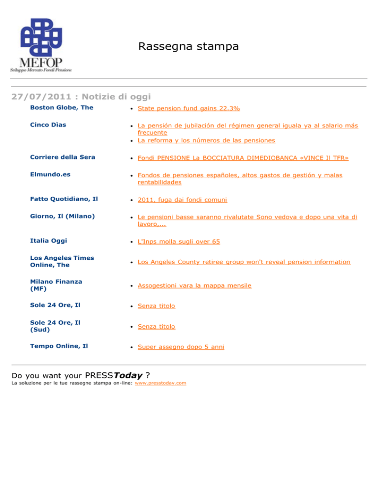 Rassegna stampa 27/07/2011 : Notizie di oggi Boston Globe, The State pension fund gains 22.3% Cinco Dìas La pensión de jubilación del régimen general iguala ya al salario más frecuente La reforma y los números de las pensiones Corriere della Sera Fondi PENSIONE La BOCCIATURA DIMEDIOBANCA «VINCE Il TFR» Elmundo.es Fondos de pensiones españoles, altos gastos de gestión y malas rentabilidades Fatto Quotidiano, Il 2011, fuga dai fondi comuni Giorno, Il (Milano) Le pensioni basse saranno rivalutate Sono vedova e dopo una vita di lavoro,... Italia Oggi L'Inps molla sugli over 65 Los Angeles Times Online, The Los Angeles County retiree group won't reveal pension information Milano Finanza (MF) Assogestioni vara la mappa mensile Sole 24 Ore, Il Senza titolo Sole 24 Ore, Il (Sud) Senza titolo Tempo Online, Il Super assegno dopo 5 anni Do you want your PRESSToday ? La soluzione per le tue rassegne stampa on-line: www.presstoday.com Rassegna stampa Boston Globe, The Data: 27/07/2011 "State pension fund gains 22.3%" Stampa Indietro State pension fund gains 22.3% Assets nearly back to precrisis level By Beth Healy Globe Staff / July 27, 2011 E-mail | Print | Reprints | Text size – + The Massachusetts state pension fund posted a 22.3 percent gain for the fiscal year ended June 30, its best return in 25 years, Treasurer Steven Grossman said yesterday. The fund closed the year with $50.3 billion in assets, adding $9 billion in value over the prior 12 months. The pension portfolio closed fiscal 2011 having nearly climbed back to where it was before the financial crisis. The strong returns came on the heels of one of the fund’s worst periods, as the global financial turmoil of 20082009 slashed its assets to $37.7 billion. Grossman, who is chairman of the pension fund’s board, said he and the staff were “pleased and gratified’’ with the performance for 2011. Still, he remained cautious amid worries over the national debt crisis and the economy. “We recognize that it’s a tough year and interest rates are doing what they’re doing, and the markets are volatile,’’ Grossman said. “Everybody’s got their head down, and they’re working hard.’’ Massachusetts outperformed the nation’s largest public pension fund, the California Public Employees’ Retirement System, which reported a preliminary 20.7 percent return for the 12 months ended June 30. Despite a falling market in May and early June, the Massachusetts pension fund regained ground in recent weeks and notched its second-best year. The fund’s best performance ever, in 1986, was a 28.1 percent return, according to pension officials. The latest year’s performance was led by a strong stock market, as the Standard & Poor’s 500 index rose 30.7 percent. For the pension fund, global equities led the way, following by private equity and real estate - areas that suffered during the downturn - and alternative investments such as timber. Last year was a transition period for the fund, with Grossman and executive director Michael Trotsky both in their first year on the job. It was a year in which officials reexamined the way the state invests in hedge funds and launched a program to invest in them directly, instead of through middleman funds. They also are taking measures to better manage risk and are looking harder at underperforming investment managers. Trotsky attributed the year’s gains to sticking to the board’s plan and not taking a knee-jerk reaction to losses in the financial crisis. “We just stuck to our knitting and took a long-term view and evaluated managers that were underperforming,’’ Trotsky said. “We did stabilize the organization and kept key employees. Stability is key.’’ Pension board member Alexander E. Aikens III said he is concerned about some employee departures over the past year. Turnover is a problem, he said, as seasoned pension officials can earn more in the private sector, taking experience with them. In addition, Aikens said that while many of the changes at the fund are positive, the board needs to be vigilant in monitoring them, from new consultants to the shift to investing directly in hedge funds. “It’s just different, and any time you start engaging in something different you’re taking a level of risk,’’ Aikens said. Similarly, he noted, if the board considers reducing some of its equity exposure, it should be careful how it diversifies. Beth Healy can be reached at [email protected]. Rassegna stampa Cinco Dìas Data: 27/07/2011 "La pensión de jubilación del régimen general iguala ya al salario más frecuente" Indietro Stampa José Antonio Vega - Madrid - 27/07/2011 La cuantía de la pensión media de jubilación de los 5,25 millones de jubilados españoles alcanza en julio los 916,19 euros al mes, contabilizando los perceptores de todos los regímenes de la Seguridad Social, tanto los trabajadores por cuenta ajena como aquellos que lo fueron por cuenta propia. Pero contabilizando únicamente aquellos pensionistas encuadrados en el régimen general de la Seguridad Social, el que engloba a todos los trabajadores asalariados por cuenta ajena (excepción de los minoritarios del régimen de la Minería, del Mar o del Agrario), la pensión media de jubilación llega ya a 1.137,09 euros mensuales. Contabilizada en términos anuales, la factura media es de 15.920 euros (las pensiones se abonan en catorce pagas), una cantidad similar al "sueldo más frecuente" identificado en España por Estadística, y que en la último informe sobre la estructura salarial de España lo situaba en 15.500 euros al mes. Esta cantidad se refiere al ejercicio de 2009, aunque los avances de los salarios desde entonces no ha sido muy abultados, y en muchos sectores se ha producido un retroceso significativo. El sueldo mediano (aquel que se encuentra en el punto de la escala que divide en dos colectivos iguales a todos los asalariados) era en ese año de 18.817 euros anuales, según Estad