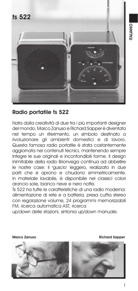 ITALIANO ts 522 Radio portatile ts 522 Nata dalla creatività di due tra i più importanti designer del mondo, Marco Zanuso e Richard Sapper è diventata nel tempo un riferimento, un simbolo destinato a rivoluzionare gli ambienti domestici e di lavoro. Questa famosa radio portatile è stata costantemente aggiornata nei contenuti tecnici, mantenendo sempre integre le sue originali e inconfondibili forme. Il design inimitabile della radio Brionvega continua ad abbellire le nostre case: il 'guscio' leggero, realizzato in due parti che si aprono e chiudono simmetricamente, in materiale lavabile, è disponibile nei classici colori arancio sole, bianco neve e nero notte. Ts 522 ha tutte le caratteristiche di una radio moderna: alimentazione di rete e a batteria, presa cuffia stereo con regolazione volume, 24 programmi memorizzabili FM, ricerca automatica AST, ricerca up/down delle stazioni, sintonia up/down manuale. Marco Zanuso Richard Sapper 1 ITALIANO Prima di mettere in funzione la vostra radio, leggete attentamente le raccomandazioni riportate nel paragrafo SICUREZZA. DEUTSCH Lesen Sie bitte vor dem Betrieb Ihres Radios aufmerksam die Hinweise im Abschnitt SICHERHEIT durch. ESPAÑOL Antes de poner en funcionamiento la radio deberán leerse atentamente las recomendaciones del apartado SEGURIDAD. FRANÇAIS Avant d’allumer votre radio, lisez attentivement les recommandations indiquées dans le paragraphe SÉCURITÉ. ENGLISH Read the precautions in the SAFETY section before using the radio. 2 Ruotare ITALIANO ATTENZIONE! I comandi [2] e [5] funzionano sia come manopole (da ruotare) che come tasti (da premere). Perciò, quando nelle istruzioni trovate la parola “manopola” dovete RUOTARE il comando e quando trovate invece la parola “tasto” dovete PREMERE il comando. Premere LEGENDA DEI TASTI, DELLE MANOPOLE E DELLE PRESE [1] [2] [3] [4] [5] [6] [7] [8] [9] [10] [11] [12] [13] [14] [15] [16] Manopola di accensione e regolazione del volume dell’altoparlante. Manopola di selezione programmi. Tasto di memorizzazione delle stazioni. Scala Programmi selezionati. Scala Frequenze di trasmissione. Manopola per la ricerca delle stazioni. Tasto per la ricerca semiautomatica delle stazioni. Tasto più Manopola per la regolazione del volume in cuffia. Tasto per la selezione della banda (AM/FM). Tasto per l’attivazione della sintonia automatica AST. Tasto che accentua la riproduzione dei toni acuti. Vano pile. Ganci tenuta coperchio vano pile. Coperchio vano pile. Antenna a stilo. Presa cuffia stereo. Spina a cui collegare il cavo rete [15] . Cavo di collegamento alla rete. Pulsante di apertura della radio. SICUREZZA Simboli di sicurezza presenti sul prodotto: L’apparecchio è in Classe 2. Pericolo di scossa elettrica, tensione pericolosa. Fare riferimento alla documentazione. 3 ITALIANO Norme di sicurezza: Non collegate la radio alla rete elettrica se la spina e/o il cavo [15] sono danneggiati, ma rivolgetevi al Centro di Assistenza Tecnica autorizzato della vostra zona. Non lasciate la radio collegata alla rete elettrica quando vi assentate per periodi lunghi. La radio dovrà essere posizionata in prossimità della presa di corrente elettrica ed il cavo di alimentazione [15] dovrà risultare facilmente accessibile per aggevolare un’eventuale sua disconnessione. Disponete il cavo di alimentazione [15] in modo che non sia di intralcio al passaggio delle persone. Inserite la spina e la presa del cavo di alimentazione [15] sempre a fondo. Non provate mai a ricaricare, a riscaldare o a buttare sul fuoco le pile perché potrebbero scoppiare. Non usate pile ricaricabili ma solamente il tipo consigliato R 14 A. Non permettete ai bambini di giocare con le pile. Non permettete ai bambini di introdurre oggetti all’interno della radio. Non permettete ai bambini di giocare con le parti dell’imballo. Le buste, i fogli di plastica, i cartoni ecc. possono essere causa di soffocamento e ferite. Non togliere la copertura posteriore della radio; all’interno c’è corrente ad “alta tensione” che può essere causa di scosse elettriche. Non posizionate la radio in zone umide, con presenza di vapori o possibili spruzzi d’acqua. Non collocate la radio vicino a fonti di calore come caloriferi, stufe o apparecchi che producono calore. Non collocate la radio in un posto angusto ma assicuratevi che ci sia spazio per l’areazione (minimo 5 cm.) tutt’intorno. Le fessure di areazione devono essere libere per permettere il raffreddamento dell’elettronica interna. Non ostruite le fessure di areazione con giornali, tovaglie, tende ecc. Non appoggiate sulla radio candele o altro con fiamma libera perchè, in caso di rovesciamento, la cera fusa o la fiamma possono causare gravi danni all'interno e all'esterno dell’apparecchio. Non fate eseguire controlli o riparazioni da personale non specializzato ma servitevi dei Centri di Assistenza autorizzati. 4 IMBALLI: i materiali utilizzati per l’imballo rispondono alle norme ecologiche vigenti. Se non avete problemi di spazio, vi consigliamo di conservare l’imballo del prodotto almeno per il periodo pssato dalla Garanzia. Se invece volete disfarvene, è bene farlo senza danneggiare l’ambiente. BATTERIE: le batterie che non sono del tipo ecologico, cioè ‘verdi’, vanno portate nei punti di raccolta e smaltimento previsti per i prodotti inquinanti. In ogni caso non devono essere disperse nell’ambiente e comunque, per la salvaguardia di questo, è bene usare sempre batterie prive di mercurio. ALIMENTARE LA RADIO Vedi anche dati sul coperchio del vano batterie. La radio può essere alimentata sia con la rete elettrica che con le batterie. Con l’alimentazione proveniente dalla rete elettrica, le batterie (se presenti) vengono escluse automaticamente dal sistema. Con la rete elettrica: 220 - 240 V ca ~ 50 Hz per Europa, Australia ecc. - Inserite la presa volante del cavo rete [15] nella spina [14] sul retro della radio. - Inserite la spina del cavo [15] 
