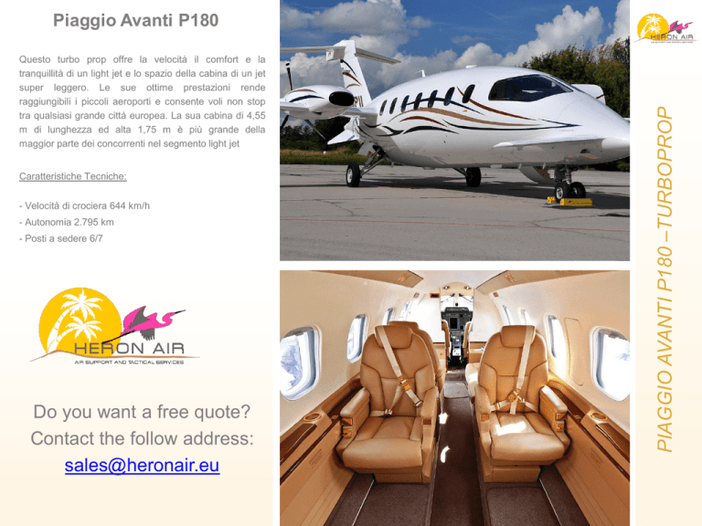 Questo turbo prop offre la velocità il comfort e la tranquillità di un light jet e lo spazio della cabina di un jet super leggero. Le sue ottime prestazioni rende raggiungibili i piccoli aeroporti e consente voli non stop tra qualsiasi grande città europea. La sua cabina di 4,55 m di lunghezza ed alta 1,75 m è più grande della maggior parte dei concorrenti nel segmento light jet Caratteristiche Tecniche: - Velocità di crociera 644 km/h - Autonomia 2.795 km - Posti a sedere 6/7 Do you want a free quote? Contact the follow address: [email protected] PIAGGIO AVANTI P180 –TURBOPROP Piaggio Avanti P180