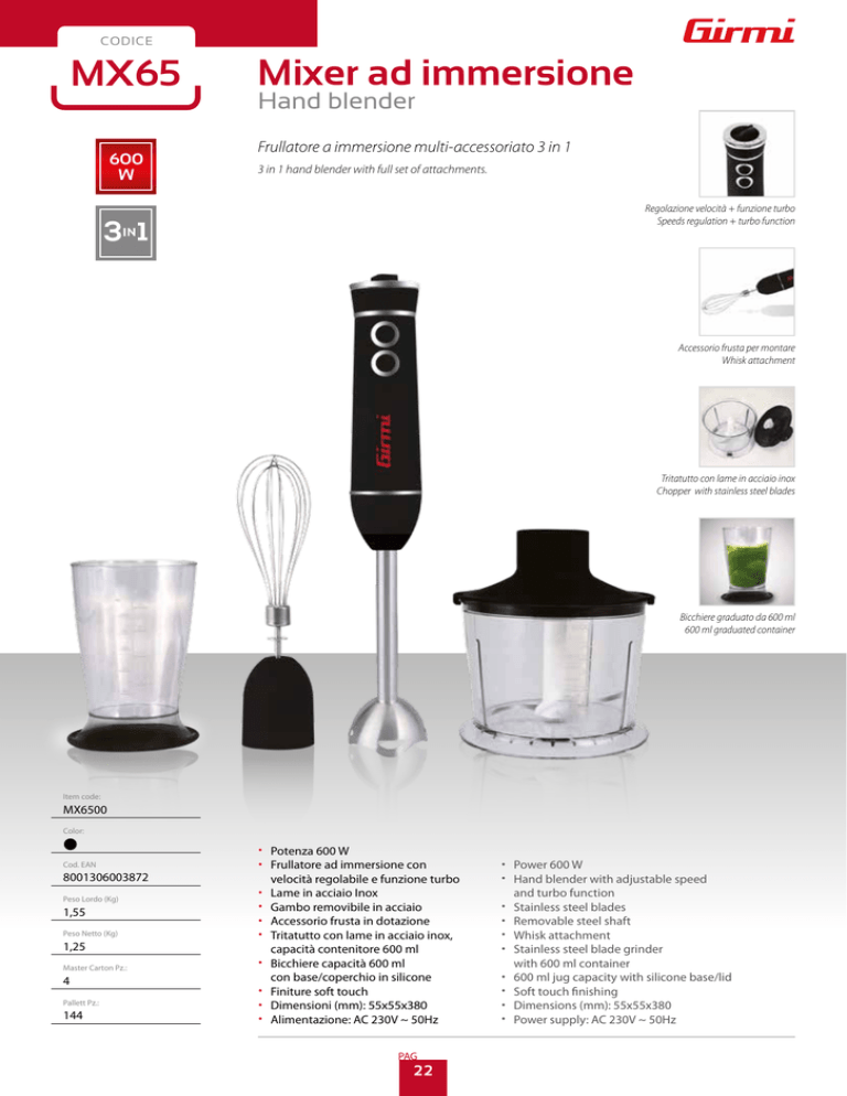 CODICE MX65 600 W Mixer ad immersione Hand blender Frullatore a immersione multi-accessoriato 3 in 1 3 in 1 hand blender with full set of attachments. Regolazione velocità + funzione turbo Speeds regulation + turbo function Accessorio frusta per montare Whisk attachment Tritatutto con lame in acciaio inox Chopper with stainless steel blades Bicchiere graduato da 600 ml 600 ml graduated container Item code: MX6500 Color: Cod. EAN 8001306003872 Peso Lordo (Kg) 1,55 Peso Netto (Kg) 1,25 Master Carton Pz.: 4 Pallett Pz.: 144 • • • • • • • • • • Potenza 600 W Frullatore ad immersione con velocità regolabile e funzione turbo Lame in acciaio Inox Gambo removibile in acciaio Accessorio frusta in dotazione Tritatutto con lame in acciaio inox, capacità contenitore 600 ml Bicchiere capacità 600 ml con base/coperchio in silicone Finiture soft touch Dimensioni (mm): 55x55x380 Alimentazione: AC 230V ~ 50Hz PAG 22 • • • • • • • • • • Power 600 W Hand blender with adjustable speed and turbo function Stainless steel blades Removable steel shaft Whisk attachment Stainless steel blade grinder with 600 ml container 600 ml jug capacity with silicone base/lid Soft touch finishing Dimensions (mm): 55x55x380 Power supply: AC 230V ~ 50Hz