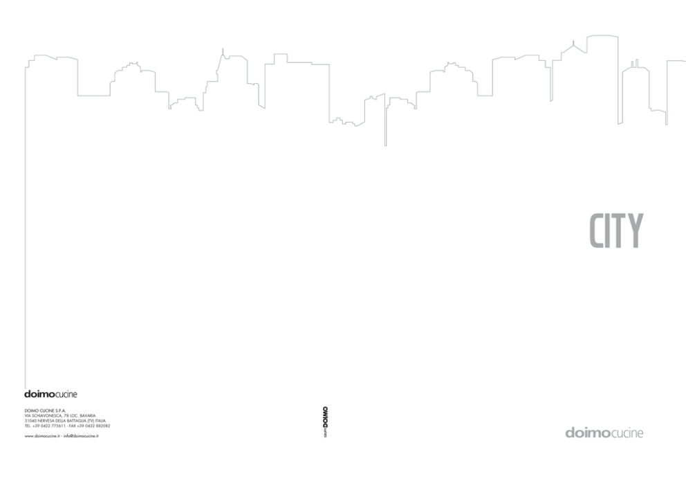 DOIMO CUCINE S.P.A. VIA SCHIAVONESCA, 78 LOC. BAVARIA 31040 NERVESA DELLA BATTAGLIA (TV) ITALIA TEL. +39 0422 775611 - FAX +39 0422 882082 www.doimocucine.it - [email protected] design: R&S doimocucine - imagodesign design: R&S doimocucine - imagodesign $JUZDVPSFEFMMBDBTB Progetto contemporaneo, proporzioni equilibrate e dettagli rigorosi creano un’atmosfera particolare ed unica. Una cucina dalle soluzioni tecnicamente evolute per interpretare ogni desiderio. City: at the heart of home. A contemporary project whose balanced proportions and refined details create an atmosphere of sober and unique elegance. A technologically advanced kitchen that will give shape to any desire. City: El corazón de casa. Es un proyecto contemporáneo, proporciones equilibradas y detalles rigurosos crean una atmósfera particular y única. Una cocina de soluciones tècnicamente evolucionadas para interpretar cada deseo. City: le cœur de la maison. Un projet contemporain, des proportions équilibrées et des détails rigoureux créent une atmosphère unique. City: das Herz des Hauses. Aktuelle Entwürfe, ausgeglichenes Verhältnis und streng beachtete Einzelheiten schaffen eine einzigartige Atmosphäre. Eine Küche mit technisch fortgeschrittenen Lösungen um alle ihre Wünsche zu interpretieren. City, spazi abitati $*5: Il modello City è un “sistema cucina” evoluto, linee essenziali e pure creano infinite soluzioni compositive, nuovi scenari in cucina. _ City, inhabited spaces City is an evolved kitchen system where pure and essential lines create countless arrangement solutions and new kitchen sets. _ El modelo City es un “sistema de cocina” evolucionado, líneas esenciales y puras crean infinitas soluciones compositivas, nuevos escenarios en cocina. _ City, des espaces habités. Le modèle City est un «système cuisine» évolué; des lignes essentielles et pures créent multiples compositions, des nouveaux scénarios dans la cuisine. _ City. Wird Wohnbereich Das Modell City ist ein fortschrittliches “Küchensystem“, wesentliche und reine Linien ermöglichen unendliche Kombinationen von Lösungen und neue Szenarien in der Küche. $*5: $*5: Un progetto versatile e contemporaneo: le colonne con forno integrato e l’isola hanno ante laccato lucido bianco, la boiserie e le colonne dispensa sono in rovere laccato tortora, il top è in corian bianco ghiaccio. _ A versatile and contemporary project. Tall units with integrated oven and island are in glossy white lacquer; backpanel and larder tall units in Tortora colour varnished oak, worktop in Ice White Corian. _ Un proyecto versátil y contemporáneo: Las columnas, con horno integral e isla, tienen puertas en laca brillo blanco, la boiserie y las columnas despensa son en roble laca tortora y el top es en corian blanco hielo. _ Un projet versatile et contemporain: les armoires four et l’îlot ont des façades en laque blanc brillant, la boiserie et les armoires rangement sont en chêne laqué tortora, le plan en corian ice white. _ Ein vielseitiges und zeitgenössisches Projekt. Hochschränke mit integriertem Backofen und Insel in glänzender weißer Lack, Paneele und Hochschränke in Tortora lackierter Eiche; Arbeitsplatte in Ice White Corian. $*5: $*5: Linee essenziali, innovazioni tecnologiche e design esclusivo per una cucina dei nostri tempi. _ Essential lines, technological innovations and an exclusive design for a contemporary kitchen. _ Lineas esenciales, inovaciones tecnológicas y diseño esclusivo para una cocina de nuestros tiempos. _ Des lignes essentielles, des innovations technologiques et un design exclusif pour une cuisine des nos jours. _ Wesentliche Linien, technologische Innovationen und exklusive design für eine zeitgenössische Küche. $*5: $*5: Caratteristica del modello City è la funzionalità e l’eleganza del comodo tavolo estraibile; ottimizza gli spazi e ne aumenta le funzioni. Composizione con ante e piano estraibile rovere laccato antracite; top zona operativa in laminato bianco con bordo rovere laccato antracite. _ One of City main features is the versatility and elegance of the pullout table: it optimises spaces and broadens their functions. Composition with doors and pullout table in Anthracite colour varnished oak; worktop in white laminate with Anthracite varnished oak edge. _ Una de las caracteristicas del modelo City es la funcionalidad y la elegancia de la cómoda mesa extraíble ahorrandonos espacio. Composición con puertas y mesa extraíble roble laca antracite. Encimera en laminado blanco con borde roble laca antracite. _ Une nouveauté du modèle City: la table télescopique fonctionnelle y élégante optimise les espaces y augmente la fonctionnalité de la cuisine. Cette composition présente façades et plan télescopique chêne laqué anthracite; le plan de travail de l’îlot est en stratifié blanc chant chêne laqué anthracite. _ Ein Merkmal von City ist die Brauchbarkeit und die Eleganz des ausziehbaren Tisches, das die Räume optimiert und die Funktionalitäten erweitert. Zusammenfassung mit Türe und ausziehbares Tisch in Anthrazit Eiche, Arbeitsplatte in weißem lackiertem Kunststoff mit Kante in Anthrazit Eiche. $*5: $*5: Gesti quotidiani in un ambiente esclusivo per bere un drink e dedicarsi al proprio hobby culinario in santa pace. _ An exclusive atmosphere for everyday gestures, to simply get a drink or to devote ourselves to culinary passion in complete peacefulness. _ Gestos cotidianos en un ambiente exclusivo para beber un drink y dedicarse al propio hobby culinario en santa paz. _ Des gestes quotidiens dans une ambiance exclusive pour boire un apéritif ou se dédier à faire de la cuisine en toute tranquillité. _ Ein exklusives Raum für tägliche Ritualien, um etwas zu trinken oder sich mit Kochen beschäftigen. $*5: $*5: Perfetta per lavorare e vivere. Isola e parete colonne con ante laccato bianco lucido, top e piano estraibile in unicolor bianco. La parete colonne compren