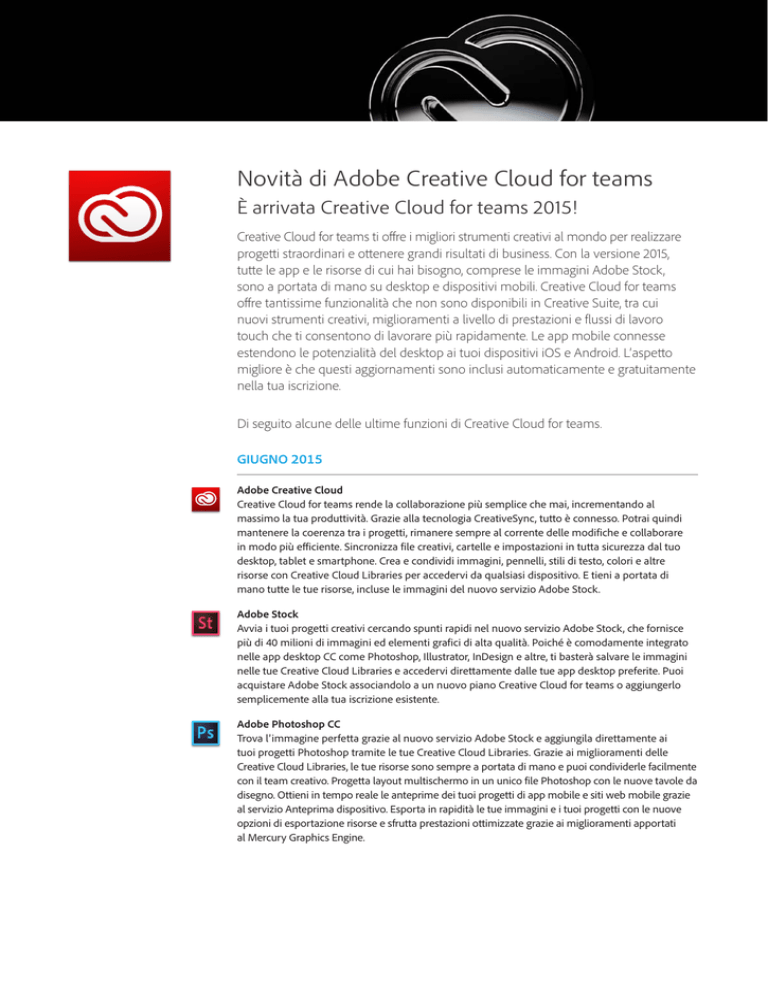 Novità di Adobe Creative Cloud for teams È arrivata Creative Cloud for teams 2015! Creative Cloud for teams ti offre i migliori strumenti creativi al mondo per realizzare progetti straordinari e ottenere grandi risultati di business. Con la versione 2015, tutte le app e le risorse di cui hai bisogno, comprese le immagini Adobe Stock, sono a portata di mano su desktop e dispositivi mobili. Creative Cloud for teams offre tantissime funzionalità che non sono disponibili in Creative Suite, tra cui nuovi strumenti creativi, miglioramenti a livello di prestazioni e flussi di lavoro touch che ti consentono di lavorare più rapidamente. Le app mobile connesse estendono le potenzialità del desktop ai tuoi dispositivi iOS e Android. L’aspetto migliore è che questi aggiornamenti sono inclusi automaticamente e gratuitamente nella tua iscrizione. Di seguito alcune delle ultime funzioni di Creative Cloud for teams. GIUGNO 2015 Adobe Creative Cloud Creative Cloud for teams rende la collaborazione più semplice che mai, incrementando al massimo la tua produttività. Grazie alla tecnologia CreativeSync, tutto è connesso. Potrai quindi mantenere la coerenza tra i progetti, rimanere sempre al corrente delle modifiche e collaborare in modo più efficiente. Sincronizza file creativi, cartelle e impostazioni in tutta sicurezza dal tuo desktop, tablet e smartphone. Crea e condividi immagini, pennelli, stili di testo, colori e altre risorse con Creative Cloud Libraries per accedervi da qualsiasi dispositivo. E tieni a portata di mano tutte le tue risorse, incluse le immagini del nuovo servizio Adobe Stock. Adobe Stock Avvia i tuoi progetti creativi cercando spunti rapidi nel nuovo servizio Adobe Stock, che fornisce più di 40 milioni di immagini ed elementi grafici di alta qualità. Poiché è comodamente integrato nelle app desktop CC come Photoshop, Illustrator, InDesign e altre, ti basterà salvare le immagini nelle tue Creative Cloud Libraries e accedervi direttamente dalle tue app desktop preferite. Puoi acquistare Adobe Stock associandolo a un nuovo piano Creative Cloud for teams o aggiungerlo semplicemente alla tua iscrizione esistente. Adobe Photoshop CC Trova l’immagine perfetta grazie al nuovo servizio Adobe Stock e aggiungila direttamente ai tuoi progetti Photoshop tramite le tue Creative Cloud Libraries. Grazie ai miglioramenti delle Creative Cloud Libraries, le tue risorse sono sempre a portata di mano e puoi condividerle facilmente con il team creativo. Progetta layout multischermo in un unico file Photoshop con le nuove tavole da disegno. Ottieni in tempo reale le anteprime dei tuoi progetti di app mobile e siti web mobile grazie al servizio Anteprima dispositivo. Esporta in rapidità le tue immagini e i tuoi progetti con le nuove opzioni di esportazione risorse e sfrutta prestazioni ottimizzate grazie ai miglioramenti apportati al Mercury Graphics Engine. Adobe Illustrator CC Aggiungi alla tua composizione un’immagine o un elemento grafico originale dal nuovo servizio Adobe Stock: fai tutto in un batter d’occhio e direttamente da Illustrator. Tieni a portata di mano le tue risorse preferite con le Creative Cloud Libraries migliorate. Le operazioni di zoom, panning e scorrimento sono 10 volte più veloci grazie ai nuovi miglioramenti in termini di prestazioni. Puoi visualizzare e perfezionare i dettagli più minuziosi negli elementi grafici più complessi grazie a un livello di ingrandimento dello zoom 10 volte più grande. Ora puoi anche recuperare il lavoro non salvato nel caso in cui Illustrator si blocchi, così non perderai mai più i tuoi file. Adobe InDesign CC Scopri immagini straordinarie con il nuovo servizio Adobe Stock e aggiungile rapidamente ai tuoi progetti salvandole in Creative Cloud Libraries e accedendovi direttamente da InDesign. I miglioramenti apportati alle Creative Cloud Libraries ti consentono di condividere immagini, colori, pennelli, stili di carattere e paragrafo e altre risorse tra InDesign e altre app desktop e mobile di Creative Cloud. Velocizza al massimo le attività quotidiane grazie alle nuove prestazioni di disegno offerte da Mercury. Puoi inserire immagini direttamente nelle celle delle tabelle per ottenere una combinazione di elementi grafici e testuali e aggiungere un colore o un’ombreggiatura ai paragrafi. Adobe Premiere Pro CC Usa il colore e la luce in modo completamente nuovo grazie al nuovo pannello Colore Lumetri. Crea interviste più professionali rendendo più fluidi i tagli tra clip audio mediante l’opzione Taglio morphing. Puoi acquisire e assemblare video ovunque ti colga l’ispirazione con Adobe Premiere Clip, per poi passare alle potenzialità creative complete di Adobe Premiere Pro. Distribuisci contenuti della giusta durata senza operazioni di micro-editing che ti fanno perdere tempo. Mentre regoli la lunghezza del video, la nuova opzione Regolazione tempo aggiunge o rimuove automaticamente fotogrammi in corrispondenza dei cambi di scena oppure in sezioni con fermi immagine o scarsa attività visiva. Adobe After Effects CC Traccia i volti con eccezionale precisione impostando il livello di dettaglio del tracciamento. Il semplice tracciamento delle maschere consente di applicare rapidamente gli effetti al solo volto, ad esempio la correzione colore selettiva o la sfocatura del volto. Puoi anche seguire punti specifici del volto come le pupille, la bocca e il naso. Inoltre, il nuovo After Effects ti consente di lavorare più rapidamente grazie alla funzionalità Anteprima ininterrotta. Puoi visualizzare le repliche dei progetti, regolare le proprietà e persino ridimensionare i pannelli senza interrompere la riproduzione delle composizioni. Adobe Dreamweaver CC Sviluppa e progetta rapidamente siti web pronti per la produzione che si adattano in modo dinamico a schermi di dimensioni diverse, integrando la progettazione dinamica nel tuo flusso di lavoro quotidiano. Visualizza in anteprima l’aspetto delle tue pagine o testa l