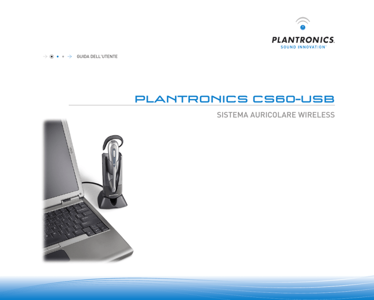 GUIDA DELL'UTENTE Plantronics CS60-USB Sistema AURICOLARE WIRELESS 0 0 0 SOMMARIO CONTENUTO DELLA CONFEZIONE Auricolare e modelli Contenuto della confezione 3 Caratteristiche 4 Configurazione 6 Ricarica 7 Posizionamento 7 Installazione del software PerSono® Suite 8 Configurazione e stato 9 Regolazione 10 Esecuzione/risposta/termine delle chiamate 11 Regolazione del volume e inizializzazione della funzione Flash 12 Esclusione del microfono durante una chiamata e inizializzazione del pulsante Smart 12 In viaggio con l'auricolare CS60-USB 13 Controlli dell'auricolare 14 Indicatori luminosi della base 15 Risoluzione dei problemi dell'auricolare CS60-USB 15 Collegamento 18 Ripristino del sistema 18 Sostituzione della batteria 19 Manutenzione 20 Assistenza tecnica 20 Archetto Auricolare Supporti per orecchio Base Caricabatterie CA Per informazioni sulla sicurezza del prodotto, fare riferimento al documento "Importanti istruzioni sulla sicurezza", fornito separatamente, prima dell'installazione e dell'uso. REGISTRAZIONE ONLINE DEL PRODOTTO Visitare il sito Web www.plantronics.com/productregistration per registrare online il prodotto CS60-USB acquistato e ricevere un servizio di assistenza e supporto tecnico ottimale. Software CD del software PerSono Suite 3 CARATTERISTICHE Base Retro e lato Selettore della suoneria (On = verso l'alto) (Off = verso il basso) Ganci del supporto Registrazione Foro di accesso al pulsante di collegamento (è necessario utilizzare una graffetta) Porta del caricabatterie CA Connettore USB Base - Bottom View Lato anteriore Indicatore luminoso di ricarica (rosso) r) Telephone Handset Jack Indicatore luminoso di stato (verde) Auricolari Handset Lifter Jack Lato anteriore: AC Charging Jack Pulsante volume di ascolto/ esclusione microfono Flash/Smart Telephone Cord Jack Contatti di ricarica Headset Pulsante di controllo chiamate Speaking Volume Major Adjust Base di alloggiamento per l'auricolare Indicatore luminoso di conversazione Lato posteriore: Front: Altoparlante Listening Volume/Mute Sportello del comparto batterie Microfono Call Control Button Talk Indicator Light Rear: Speaker 4 Battery Cover 0 Microphone 0 5 IMPOSTAZIONI RICARICA 1 ora = carica minima per completare la configurazione 3 ore = carica completa 1 1 2 Per installare la base, inserire il cavo USB nel foro situato nella parte inferiore della base in modo da posizionarlo nell'incavo situato sull'unità, quindi montare il supporto inserendo i ganci nei fori della parte inferiore della base. 1.Far scorrere l'auricolare nel supporto di ricarica. 2.Premere delicatamente l'auricolare per assicurarsi che sia nella posizione corretta. La spia rossa della ricarica situata sulla base si accende durante la ricarica e si spegne quando la batteria è completamente carica. Solo ricarica CA 2 Quando il computer è spento, la carica dell'auricolare CS60-USB viene sospesa e l'autonomia di stand-by dell'auricolare si riduce. Con l'adattatore CA opzionale, è possibile assicurare la ricarica dell'auricolare. Solo ricarica USB Collegare il connettore USB a una porta USB libera sul computer. Se si utilizza un hub USB, verificare che l'energia erogata (250 mA) sia sufficiente a caricare l'auricolare. In alternativa, è possibile utilizzare le strisce di velcro in dotazione per fissare la base al monitor di un PC. Tuttavia, se questa soluzione provoca rumori o interferenze, consultare la sezione "Posizionamento" a pagina 7. Quando il computer è acceso, l'auricolare CS60-USB viene caricato tramite il collegamento USB. POSIZIONAMENTO 30 cm 15 cm 3 Di seguito, viene indicata la distanza minima consigliata. È possibile utilizzare un caricabatterie CA opzionale. 6 IMPORTANTE: un posizionamento non corretto potrebbe provocare disturbi dovuti a rumori e interferenze. 7 INSTALLAZIONE DEL SOFTWARE PerSono Suite Uso della cuffia CS50/60-USB con Microsoft Office Communicator Il software Plantronics PerSono Suite fornisce il collegamento tra l'auricolare CS60-USB e le applicazioni softphone compatibili del computer. Il software PerSono Suite offre la capacità di rilevare e rispondere/terminare una chiamata in modalità remota dall'applicazione softphone tramite il pulsante di controllo chiamate. Inoltre, PerSono Suite fornisce alcune configurazioni di base e informazioni di stato del sistema. Verificare l'elenco di compatibilità per PerSono Suite all'indirizzowww.plantronics.com/ SoftphoneCompatibility per le ultime novità in termini di compatibilità dei softphone. Se il softphone in uso non è supportato da PerSono Suite, vedere pagina 11. 1. Dopo aver inserito il CD, passare alla schermata principale di PerSono Suite e fare clic su "Installa il software PerSono Suite". 2. Potrebbe essere necessario scegliere il dispositivo audio da utilizzare. Fare riferimento alla documentazione del softphone per i dettagli. NOTA: una volta installato, l'auricolare CS60-USB diventa il dispositivo audio predefinito sul computer. È possibile impostare manualmente le preferenze nel sistema operativo Windows® tramite l'opzione Suoni e periferiche audio nel Pannello di controllo nella scheda Audio. NOTA: dopo l'installazione, si consiglia di impostare l'esecuzione di PerSono Suite a ogni avvio di Windows®. Icone della barra delle applicazioni Dopo aver installato il software, una delle quattro icone della barra delle applicazioni viene visualizzata nella barra in fondo allo schermo per indicare lo stato della comunicazione tra l'auricolare e PerSono Suite. Oltre ai softphone e alle funzioni supportate mediante il software PerSono Suite, i modelli CS50/60-USB supportano le seguenti funzioni per MOC (Microsoft Office Communicator). Nota: le funzioni di MOC sono integrate nella cuffia CS50/60-USB e non è necessaria l'installazione del software PerSono Suite per il loro funzionamento. Caratteristica Azione/Descrizione Rilevare / rispondere a una chiamata - per le chiamate MOC in arrivo con auricolare posizionato sulla base • Se il selettore della s