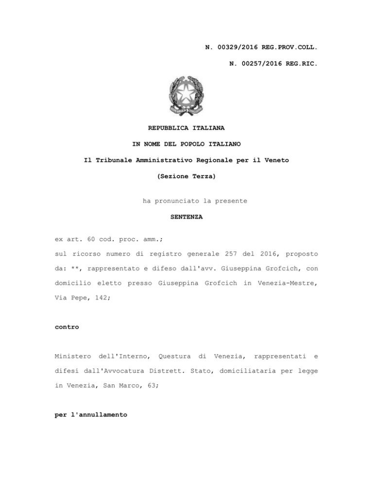 N. 00329/2016 REG.PROV.COLL. N. 00257/2016 REG.RIC