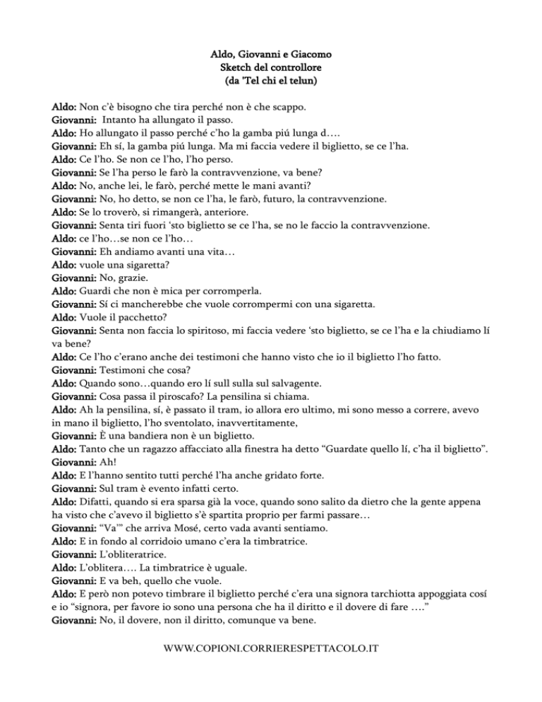 Aldo, Giovanni e Giacomo Sketch del controllore (da 'Tel chi el telun) Aldo: Non c’è bisogno che tira perché non è che scappo. Giovanni: Intanto ha allungato il passo. Aldo: Ho allungato il passo perché c’ho la gamba piú lunga d…. Giovanni: Eh sí, la gamba piú lunga. Ma mi faccia vedere il biglietto, se ce l’ha. Aldo: Ce l’ho. Se non ce l’ho, l’ho perso. Giovanni: Se l’ha perso le farò la contravvenzione, va bene? Aldo: No, anche lei, le farò, perché mette le mani avanti? Giovanni: No, ho detto, se non ce l’ha, le farò, futuro, la contravvenzione. Aldo: Se lo troverò, si rimangerà, anteriore. Giovanni: Senta tiri fuori ‘sto biglietto se ce l’ha, se no le faccio la contravvenzione. Aldo: ce l’ho…se non ce l’ho… Giovanni: Eh andiamo avanti una vita… Aldo: vuole una sigaretta? Giovanni: No, grazie. Aldo: Guardi che non è mica per corromperla. Giovanni: Sí ci mancherebbe che vuole corrompermi con una sigaretta. Aldo: Vuole il pacchetto? Giovanni: Senta non faccia lo spiritoso, mi faccia vedere ‘sto biglietto, se ce l’ha e la chiudiamo lí va bene? Aldo: Ce l’ho c’erano anche dei testimoni che hanno visto che io il biglietto l’ho fatto. Giovanni: Testimoni che cosa? Aldo: Quando sono…quando ero lí sull sulla sul salvagente. Giovanni: Cosa passa il piroscafo? La pensilina si chiama. Aldo: Ah la pensilina, sí, è passato il tram, io allora ero ultimo, mi sono messo a correre, avevo in mano il biglietto, l’ho sventolato, inavvertitamente, Giovanni: È una bandiera non è un biglietto. Aldo: Tanto che un ragazzo affacciato alla finestra ha detto “Guardate quello lí, c’ha il biglietto”. Giovanni: Ah! Aldo: E l’hanno sentito tutti perché l’ha anche gridato forte. Giovanni: Sul tram è evento infatti certo. Aldo: Difatti, quando si era sparsa già la voce, quando sono salito da dietro che la gente appena ha visto che c’avevo il biglietto s’è spartita proprio per farmi passare… Giovanni: “Va’” che arriva Mosé, certo vada avanti sentiamo. Aldo: E in fondo al corridoio umano c’era la timbratrice. Giovanni: L’obliteratrice. Aldo: L’oblitera…. La timbratrice è uguale. Giovanni: E va beh, quello che vuole. Aldo: E però non potevo timbrare il biglietto perché c’era una signora tarchiotta appoggiata cosí e io “signora, per favore io sono una persona che ha il diritto e il dovere di fare ….” Giovanni: No, il dovere, non il diritto, comunque va bene. WWW.COPIONI.CORRIERESPETTACOLO.IT Aldo: Il diritto e il dovere di fare il biglietto. Per cui se per favore si può discostare dalla macchinina “ma io di qua non mi levo questo posto l’ho visto prima io”. Signora nessuno gli vuole rubare il posto. Perché ho detto… cioè… cioè …voglio dire ma no guardi…facciamo una bella cosa, ora io la prendo di perso, la sposto di due o tre metri, poi torno indietro faccio il biglietto, poi la riprendo la rimetto sull’altro lato, perché a me non mi piace lasciare la roba in giro è proprio una cosa mia… Giovanni: Cosa sta dicendo? L’ha timbrato o non l’ha timbrato ‘sto biglietto? Aldo: Alché quando l’ho spostata la signora, la gente già diceva, ah ah, Giovanni: Uh, un’attesa s’era creata, la gente proprio…. Aldo: Un mormorio! Perché era stato proprio un evento! Alché ho timbrato, ho messo dentro la cosa… Giovanni: Sí. Aldo: Si è sentito “Spataclumpete!” Tanto che la gente finalmente snervata ha fatto un applauso. Hanno fatto fino la ola. Giovanni: Ma non dica stupidate. Aldo: C’erano 100 persone: testimoni che io il biglietto l’ho fatto. Giovanni: Sí uno timbra sul tram e gli fanno la ola. Allora se sale con l’abbonamento cosa fanno gli sparano i mortaretti gli sparano. Mi faccia vedere ‘sto biglietto se ce l’ha e chiudiamo lí è l’ultima volta, eh. Aldo: I testimoni non c’entrano niente. Giovanni: I Testimoni, il testimone è il biglietto timbrato, quello è il testimone. Aldo: Fai un incidente, “ce l’ha il biglietto?” “No”….Ci vuole il testimone. Giovanni: Cosa c’entra l’incidente? Ma pensa te. Allora c’è o non c’è? Aldo: C’è, come non c’è. Mi deve dare il tempo di… Giovanni: Vediamo nel portafoglio. Aldo: Questo qui è il bollo della macchina. Giovanni: E allora? Cosa mi interessa? Aldo: Per farle capire che io sono uno che paga le cose, non è che sono un defraudatore della società. C’è da pagare il bollo? Lo pago! Giovanni: Eh, va beh, bravo. Aldo: Se c’è da pagare la luce, la pago Giovanni: Va beh. Aldo: Il televisore, il canone della televisione, lo pago. Giovanni: E allora? Aldo; Non ho il televisore tanto per far capire… Giovanni: Ma non dica stupidaggini. Ho già capito. Il biglietto non ce l’ha. Le faccio la contravvenzione e la chiudiamo lí. Aldo: Può essere che sia questo? Questo! Giovanni: Venti minuti per farlo saltar fuori. Aldo: Tanto lei che doveva fare, doveva andare ad una festa? Giovanni: Comunque questo biglietto è pluritimbrato. Aldo: Eh? Giovanni: È stato timbrato piú volte questo biglietto. Aldo: Si vede che l’ho pagato di piú. WWW.COPIONI.CORRIERESPETTACOLO.IT Giovanni: Non dica stupidaggini! Questi biglietti costano tutti la stessa cifra, mi spiace, ma io devo fare la contravvenzione. Aldo: Me l’ha venduto un suo collega come un abbonamento. Giovanni: Non credo proprio che i colleghi… Aldo: Uno dice una cosa, l’altro dice tutto il contrario… Giovanni: Ma comunque se lei è ignorante non ci posso fare niente. Aldo: Oh ignorante glielo dici a un’altra persona non a me. Giovanni: “Ignorante” nel senso che ignora che quello è un biglietto singolo. Aldo: Allora lei è un imbecille nel senso che “imbelle”…. Giovanni: Basta per favore chiudiamola qua. Aldo: E chiudiamo qui. Giovanni: Mi dia le sue generalità. Aldo: In generale sto cosí cosí. Giovanni: Senta, non faccia lo spiritoso per favore. Giacomo: Cos’è successo? Giovanni: Niente, non c’ha il biglietto. Giacom
