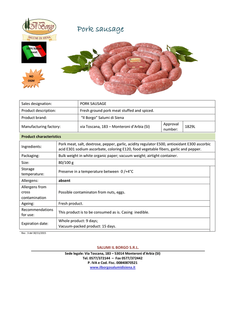 Pork sausage 100% Italian meat NO OGM Sales designation: PORK SAUSAGE Product description: Fresh ground pork meat stuffed and spiced. Product brand: “Il Borgo” Salumi di Siena Manufacturing factory: via Toscana, 183 – Monteroni d’Arbia (SI) Approval number: 1829L Product characteristics Ingredients: Pork meat, salt, dextrose, pepper, garlic, acidity regulator E500, antioxidant E300 ascorbic acid E301 sodium ascorbate, coloring E120, food vegetable fibers, garlic and pepper. Packaging: Bulk weight in white organic paper; vacuum weight; airtight container. Size: 80/100 g Storage temperature: Preserve in a temperature between 0 /+4°C Allergens: absent Allergens from cross contamination Ageing: Recommendations for use: Expiration date: Possible contaminaton from nuts, eggs. Fresh product. This product is to be consumed as is. Casing inedible. Whole product: 9 days; Vacuum-packed product: 15 days. Rev . 3 del 30/11/2015 SALUMI IL BORGO S.R.L. Sede legale: Via Toscana, 183 – 53014 Monteroni d’Arbia (SI) Tel. 0577/372144 – Fax 0577/372442 P. IVA e Cod. Fisc. 00840870521 www.ilborgosalumidisiena.it