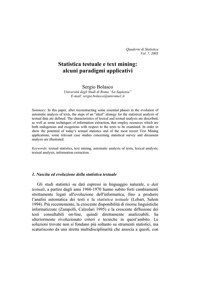 Quaderni di Statistica Vol. 7, 2005 Statistica testuale e text mining: alcuni paradigmi applicativi Sergio Bolasco Università degli Studi di Roma “La Sapienza” E-mail: [email protected] Summary: In this paper, after reconstructing some essential phases in the evolution of automatic analysis of texts, the steps of an “ideal” strategy for the statistical analysis of textual data are defined. The characteristics of lexical and textual analysis are described, as well as some techniques of information extraction, that employ resources which are both endogenous and exogenous with respect to the texts to be examined. In order to show the potential of today’s textual statistics and of the most recent Text Mining applications, some relevant case studies concerning statistical survey and document analysis are illustrated. Keywords: textual statistics, text mining, automatic analysis of texts, lexical analysis, textual analysis, information extraction. 1. Nascita ed evoluzione della statistica testuale Gli studi statistici su dati espressi in linguaggio naturale, o dati testuali, a partire dagli anni 1960-1970 hanno subìto forti cambiamenti strettamente legati all'evoluzione dell'informatica, fino a produrre l’analisi automatica dei testi e la statistica testuale (Lebart, Salem 1994). Più recentemente, la crescente disponibilità di risorse linguistiche informatizzate (Zampolli, Calzolari 1995) e la crescente diffusione dei testi consultabili on-line, quindi direttamente analizzabili, ha ulteriormente rivoluzionato criteri e tecniche in quest’ambito. Le soluzioni trovate non si fondano più soltanto su strumenti statistici, ma scaturiscono da una stretta multidisciplinarità che associa a questi, con 2 S. Bolasco uguale importanza, strumenti informatici e linguistici, soprattutto nell’area, nota oggi in letteratura, con il termine di Text Mining (TM) (Sullivan 2001, Zanasi 2005, Bolasco et al. 2005). Di fatto, nel corso del tempo, gli studi quantitativi intorno alla lingua 1 hanno cambiato progressivamente il loro obiettivo, spostandolo da una logica di tipo linguistico 2 (sviluppata fino agli anni sessanta del Novecento) ad una di tipo lessicale 3 (intorno agli anni Settanta del secolo scorso), per approdare negli anni Ottanta e Novanta ad analisi di tipo testuale 4 o infine lessico-testuale 5 . Parallelamente a questo progressivo cambiamento d’obiettivo, sono mutati tecniche e unità di analisi. Vengono sviluppati strumenti software e vengono proposte vere e proprie filiere per l’elaborazione dei dati testuali. Mutano anche i soggetti stessi, protagonisti di questi studi: non è infrequente infatti veder nascere contributi originali non solo in università o centri di ricerca, ma anche in aziende. Queste ultime, dovendo interagire con enormi masse di materiali testuali spesso disponibili in rete (l’80% delle informazioni in azienda, si dice che sia in forma di testi e solo il 20% in dati numerici), hanno il problema di selezionare, all'interno di fonti smisurate, i dati di loro interesse, per estrarne informazione capace di produrre valore. Si tratta di soluzioni di Text Mining orientate alla gestione della conoscenza e alla cosiddetta Business Intelligence. 1 Contributi significativi si trovano in riviste quali, fra le altre, Cahiers de Lexicologie, Computers and Humanities, ACM Computing Surveys, Journal of Quantitative Linguistics, Linguisticae Investigationes, Literary and Linguistic Computing, Mots, TAL. 2 Per i rapporti fra lingua e sue concrete possibilità d'analisi cfr. Guiraud (1954) ed Herdan (1964). La dimensione illimitata e sfuggente della lingua rende difficile associare alle parole una qualche "frequenza" in senso statistico-probabilistico. Quest'ultima è semmai misurabile su una raccolta di testi, intesi come spezzoni di lessici, ovvero come “campioni” particolari di un idioma. E' così che ci si limita a considerare le occorrenze delle parole in un testo come un'approssimazione delle frequenze in un lessico, a patto che il corpus sia sufficientemente ampio (almeno 50.000 occorrenze). 3 Cfr. ad esempio, Muller (1977) e Brunet (1981, 1988). 4 In questo approccio l’attenzione sulla testualità del contenuto privilegia l’analisi statistica in forme grafiche (Lebart, Salem 1988 e Lebart et al., 1998). 5 Recentemente si è visto che l’analisi dei dati testuali migliora con l’apporto di metainformazioni di carattere linguistico (dizionari elettronici, lessici di frequenza, grammatiche locali) e con interventi sul testo (normalizzazione, lemmatizzazione e lessicalizzazione), cioè attraverso un’analisi integrata statistico-linguistica di tipo lessico-testuale. Statistica testuale e text mining: alcuni paradigmi applicativi 3 Ripercorrendo rapidamente in modo schematico questa evoluzione, riconosciamo in G.K. Zipf 6 (1935), G.U. Yule (1944), alcuni fra i principali precursori della moderna analisi quantitativa in ambito linguistico, delle sue proprietà e applicazioni statistiche. Lo stesso J.P. Benzecri (1963) fonda sullo studio di dati linguistici (1981) le sue prime sperimentazioni di quella che sarà l'analyse des données (1973, 1982), contrapponendosi alle tesi di N. Chomsky 7 e inseguendo Z.S. Harris 8 , che rappresenta, quanto a formalizzazione di strutture linguistiche della scomposizione sintagmatica della frase, un riferimento assai vicino ad un approccio statistico sul trattamento del linguaggio naturale. Successivamente, Ch. Muller (1973) e P. Lafon (1984), sviluppano indici e misurazioni divenute classiche nella statistica linguistica, in cui fin dagli anni ‘30-’50 si studiano le proprietà della lingua, concentrando l’attenzione su lessemi, morfemi, n-grammi; o nella statistica lessicale, in cui l’analisi del linguaggio si fonda sullo studio dei lemmi (anni ’60’70). In parallelo, in Italia linguisti come A. Zampolli e T. De Mauro, attraverso il loro interesse per le misure di frequenza d'uso delle parole a livello di lemm