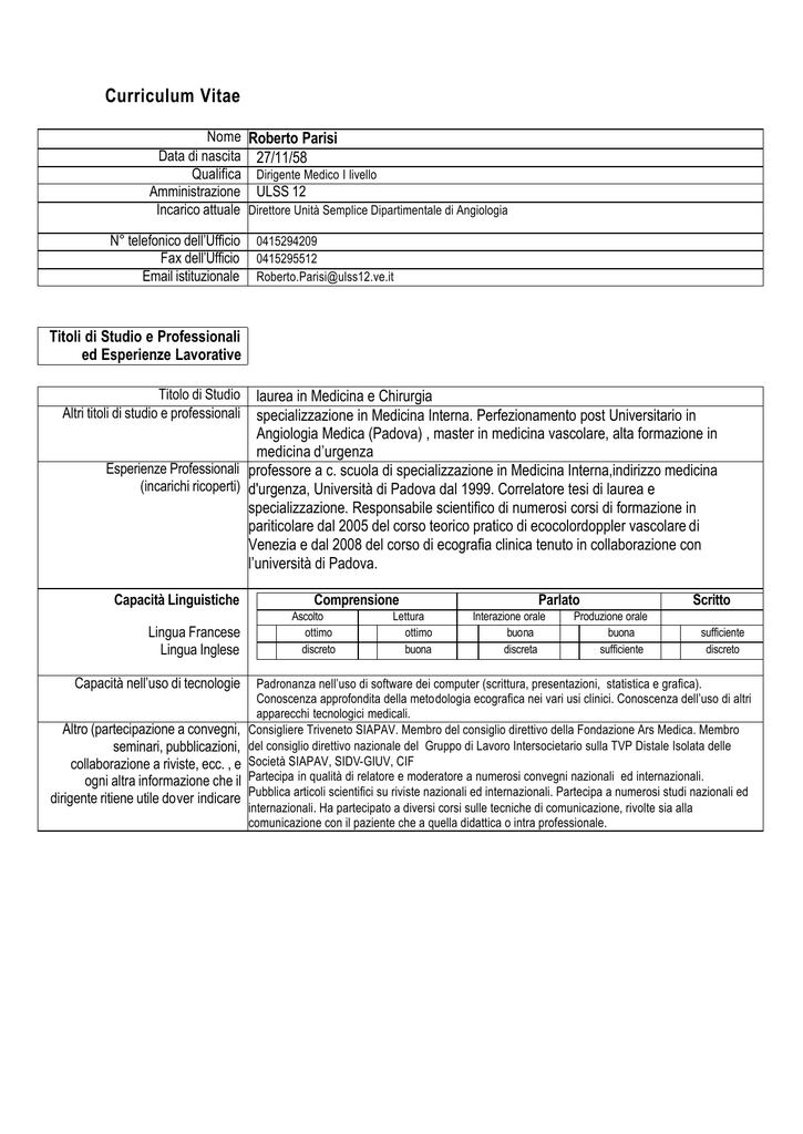 Curriculum Vitae Nome Roberto Parisi Data di nascita 27/11/58 Qualifica Dirigente Medico I livello Amministrazione ULSS 12 Incarico attuale Direttore Unità Semplice Dipartimentale di Angiologia N° telefonico dell’Ufficio Fax dell’Ufficio Email istituzionale 0415294209 0415295512 [email protected] Titoli di Studio e Professionali ed Esperienze Lavorative Titolo di Studio Altri titoli di studio e professionali laurea in Medicina e Chirurgia specializzazione in Medicina Interna. Perfezionamento post Universitario in Angiologia Medica (Padova) , master in medicina vascolare, alta formazione in medicina d’urgenza Esperienze Professionali professore a c. scuola di specializzazione in Medicina Interna,indirizzo medicina (incarichi ricoperti) d'urgenza, Università di Padova dal 1999. Correlatore tesi di laurea e specializzazione. Responsabile scientifico di numerosi corsi di formazione in pariticolare dal 2005 del corso teorico pratico di ecocolordoppler vascolare di Venezia e dal 2008 del corso di ecografia clinica tenuto in collaborazione con l’università di Padova. Capacità Linguistiche Lingua Francese Lingua Inglese Capacità nell’uso di tecnologie Altro (partecipazione a convegni, seminari, pubblicazioni, collaborazione a riviste, ecc. , e ogni altra informazione che il dirigente ritiene utile dover indicare Comprensione Ascolto ottimo discreto Lettura ottimo buona Parlato Interazione orale buona discreta Produzione orale buona sufficiente Scritto sufficiente discreto Padronanza nell’uso di software dei computer (scrittura, presentazioni, statistica e grafica). Conoscenza approfondita della metodologia ecografica nei vari usi clinici. Conoscenza dell’uso di altri apparecchi tecnologici medicali. Consigliere Triveneto SIAPAV. Membro del consiglio direttivo della Fondazione Ars Medica. Membro del consiglio direttivo nazionale del Gruppo di Lavoro Intersocietario sulla TVP Distale Isolata delle Società SIAPAV, SIDV-GIUV, CIF Partecipa in qualità di relatore e moderatore a numerosi convegni nazionali ed internazionali. Pubblica articoli scientifici su riviste nazionali ed internazionali. Partecipa a numerosi studi nazionali ed internazionali. Ha partecipato a diversi corsi sulle tecniche di comunicazione, rivolte sia alla comunicazione con il paziente che a quella didattica o intra professionale.