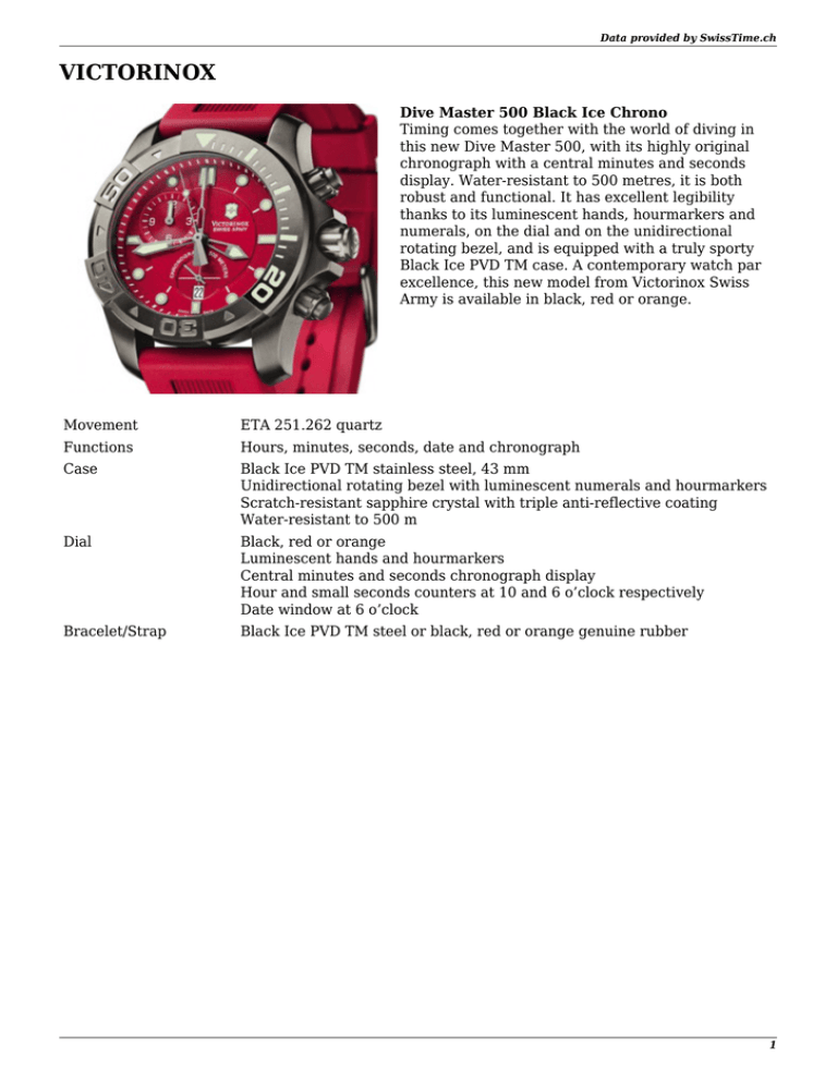 Data provided by SwissTime.ch VICTORINOX Dive Master 500 Black Ice Chrono Timing comes together with the world of diving in this new Dive Master 500, with its highly original chronograph with a central minutes and seconds display. Water-resistant to 500 metres, it is both robust and functional. It has excellent legibility thanks to its luminescent hands, hourmarkers and numerals, on the dial and on the unidirectional rotating bezel, and is equipped with a truly sporty Black Ice PVD TM case. A contemporary watch par excellence, this new model from Victorinox Swiss Army is available in black, red or orange. Movement ETA 251.262 quartz Functions Hours, minutes, seconds, date and chronograph Case Black Ice PVD TM stainless steel, 43 mm Unidirectional rotating bezel with luminescent numerals and hourmarkers Scratch-resistant sapphire crystal with triple anti-reflective coating Water-resistant to 500 m Dial Black, red or orange Luminescent hands and hourmarkers Central minutes and seconds chronograph display Hour and small seconds counters at 10 and 6 o’clock respectively Date window at 6 o’clock Bracelet/Strap Black Ice PVD TM steel or black, red or orange genuine rubber 1 Data provided by SwissTime.ch VICTORINOX Dive Master 500 Black Ice Chrono Le chronométrage rejoint le monde de la plongée avec cette nouvelle Dive Master 500 équipée d’un très original chronographe à affichage central des minutes et secondes mesurées. Etanche à 500 mètres, elle fait preuve d’une robustesse à la hauteur de sa fonctionnalité. D’une très grande lisibilité grâce à ses aiguilles, index et chiffres luminescents, sur le cadran comme sur la lunette tournante unidirectionnelle, elle est dotée d’une boîte traitée Black Ice PVD TM des plus sportives. Montre contemporaine par excellence, ce nouveau modèle signé Victorinox Swiss Army est proposé en noir, rouge ou orange. Mouvement Quartz ETA 251.262 Fonctions Heure, minute, seconde, date et chronographe Boîtier Acier inoxydable traité Black Ice PVD TM, 43 mm Lunette tournante unidirectionnelle avec chiffres et index luminescents Glace saphir inrayable à triple traitement antireflet Etanche à 500 m Cadran Noir, rouge ou orange Aiguilles et index luminescents Affichage central des minutes et des secondes du chrono Compteur des heures et petite seconde à 10 h et 6 h Guichet date à 6 h Bracelet Acier traité Black Ice PVD TM ou caoutchouc véritable noir, rouge ou orange 2 Data provided by SwissTime.ch VICTORINOX Dive Master 500 Black Ice Chrono Mit der neuen Dive Master 500 betritt der Chronograph die Welt der Taucheruhren, hier mit einer hoch originellen Anzeige der gestoppten Sekunden und Minuten aus der Mitte. Die Uhr ist wasserdicht bis 500 Meter, sie erweist sich als ebenso robust wie funktional. Zeiger, Index und Ziffern mit Leuchtmasse sorgen für eine hervorragende Ablesbarkeit, auf dem Zifferblatt wie auf der einseitig drehbaren Lünette. Und das alles in einem ungemein sportlichen Gehäuse mit Black Ice PVD TM-Finish. Dieses neue Modell von Victorinox Swiss Army ist eine zeitgenössische Uhr par excellence, es gibt sie in schwarz, rot und orange. Werk Quarz ETA 251.262 Funktionen Stunde, Minuten, Sekunden, Datum und Chronograph Gehäuse Edelstahl mit Beschichtung Black Ice PVD TM, 43 mm Lünette einseitig drehbar, Ziffern und Index mit Leuchtmasse Saphirglas unzerkratzbar, dreifach entspiegelt Wasserdicht bis 500 m Zifferblatt Schwarz, rot oder orange Zeiger und Index mit Leuchtmasse Chrono-Minutenzähler und Chronosekunde aus der Mitte Stundenzähler und kleine Sekunde bei der 10 bzw. der 6 Datumsfenster bei der 6 Armband Stahl mit Beschichtung Black Ice PVD TM oder echt Kautschuk schwarz, rot oder orange 3 Data provided by SwissTime.ch VICTORINOX Dive Master 500 Black Ice Chrono Il cronometraggio fa il suo ingresso nel mondo della subacquea con questo nuovo Dive Master 500 dotato di un originalissimo cronografo con indicazione centrale dei minuti e dei secondi rilevati. È impermeabile fino a 500 metri e dimostra una robustezza all'altezza della sua funzionalità. L'orologio è estremamente ben leggibile grazie alle lancette, agli indici e ai numeri luminescenti sul quadrante così come sulla lunetta rotante unidirezionale, ed è dotato di cassa trattata Black Ice PVD TM, di grande sportività. Orologio contemporaneo per eccellenza, questo nuovo modello firmato Victorinox Swiss Army è proposto in nero, rosso o arancio. Movimento Al quarzo ETA 251.262 Funzioni Ora, minuti, secondi, data e cronografo Cassa Acciaio inossidabile trattato Black Ice PVD TM, 43 mm Lunetta rotante unidirezionale con numeri e indici luminescenti Vetro zaffiro antigraffio con triplo trattamento antiriflesso Impermeabile fino a 500 m Quadrante Nero, rosso o arancio Lancette e indici luminescenti Indicazione centrale dei minuti e dei secondi del cronografo Contatori delle ore e dei piccoli secondi rispettivamente a ore 10 e a ore 6 Finestrella della data a ore 6 Cinturino/Bracciale Bracciale in acciaio trattato Black Ice PVD TM o cinturino in autentico caucciù nero, rosso o arancio 4 Data provided by SwissTime.ch VICTORINOX Dive Master 500 Black Ice Chrono El cronometraje se incorpora al mundo del buceo con este nuevo Dive Master 500, equipado con un cronógrafo muy original de visualización central de los minutos y segundos medidos. Sumergible hasta 500 metros, demuestra una robustez a la altura de su funcionalidad. De una gran legibilidad gracias a sus agujas, índices y cifras luminiscentes, tanto sobre la esfera como sobre la luneta giratoria unidireccional, está dotado de una caja con tratamiento de Black Ice PVD TM sumamente deportiva. Este reloj contemporáneo por excelencia, firmado por Victorinox Swiss Army, se ofrece en negro, rojo o naranja. Movimiento Cuarzo ETA 251.262 Functiones Horas, minutos, segundos, fecha y cronógrafo Caja Acero inoxidable tratado Black Ice PVD TM, 43 mm Luneta giratoria unidireccional con cifras e índices lum