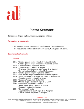 Pietro Sermonti Conoscenza lingue: inglese, francese, spagnolo (ottimo) Formazione professionale: - Ha studiato in America presso il “Lee Strasberg Theatre Institute” - Ha frequentato dei laboratori con F. De Sapio, M. Margotta e G.Baron. Esperienze Professionali: Cinema: 2016 “Smetto quando voglio reloaded” regia di S.Sibilia “Smetto quando voglio revolution” regia di S. Sibilia 2015 “Lasciati andare” regia di F. Amato 2014 “Confusi e felici” regia di M. Bruno “Cristian e Palletta contro tutti” regia di A. Manzini “Sei mai stata sulla luna” regia di P. Genovese 2013 “Smetto quando voglio” regia di S. Sibilia 2012 “Vino dentro” regia di Ferdinando Vicentini Orgnani 2010 “Boris” regia di G. Ciarrapico, M. Torre, L. Vendruscolo “Qualche nuvola” regia di S.Di Biagio 2008 “Sleepless” regia di M. De Panfiliis 2007 “Amore, bugie e calcetto” regia di L. Lucini 2006 “Solometro” regia di M. Cucurnia “Sweet sweet Marja” regia di A. Frezza “Roulette” regia di M. Soudani 2001 “Sei come sei” corto – “Appuntamento al buio” regia di S. Paragnani “Dentro o fuori” regia di G. Ciarrapico Helianto s.r.l Sede operativa: via Domodossola 29- 00183 Roma Sede legale: Via delle Vigne Nuove 36b 00139 Roma Tel. +39 06 70 47 57 63 - Fax +39 06 70 47 57 63 - Mobile +39 3398921997 [email protected] - www.almanagement.it “Le ore piccole” regia di M. Fago “Always” regia di K. Langenbach 1998 “Piccole anime” regia di G. Ciarrapico Televisione: 2016 2015 2012 2011 2009 2008 2006 2005 2004 2003 2002 “Tutto può succedere 2^” regia di L. Pellegrini “Tutto può succedere” regia di L. Pellegrini “Anna Karenina” regia di C. Duguay “Bentornato Nero Wolfe” regia di R. Donna “Boris 3” regia di D. Marengo “Un medico in famiglia 6” regia di T. Aristarco “Boris 2” regia di G. Ciarrapico, M. Torre, L. Vendruscolo “Vita da strega” regia di A. Longoni “Boris” regia di G. Ciarrapico, M. Torre, L. Vendruscolo “Radio Sex” sit-com per Fox “Julie Chevalier de Maupin” regia di C. Brandstrom “Un medico in famiglia 4” regia di C. Norza e I. Leoni “La moglie cinese” regia di A. Grimaldi “Un medico in famiglia 3” regia di C. Norza e I. Leoni “Un posto tranquillo” regia di L. Manfredi con L. Banfi e N. Manfredi “Super Senior” regia di A. Salvadore (Conduttore e autore) Teatro: 1995 “Re cervo”di C. Gozzi regia di V. Binasco “Lungo pranzo di Natale” di T. Wilder regia di C. Pezzoli “La scuola delle mogli” di Moliére regia C. Pezzoli 1999 “Natalia” di D. Macrì regia di V. Binasco 1998 “Piccole Anime” regia di G Ciarrapico 1997 “Tutto a posto” regia di G. Ciarrapico 1996 “Quel pasticciaccio brutto de via Merulana” regia di L. Ronconi 2001 “Il pergolato di tigli” regia di S. Bertelà “Il gabbiano” di A. Cechov regia di V. Binasco 2010 “Doña Flor e i suoi due mariti” regia E.Giordano 2012 “Full Monty” regia di M. Piparo Helianto s.r.l Sede operativa: via Domodossola 29- 00183 Roma Sede legale: Via delle Vigne Nuove 36b 00139 Roma Tel. +39 06 70 47 57 63 - Fax +39 06 70 47 57 63 - Mobile +39 3398921997 [email protected] - www.almanagement.it