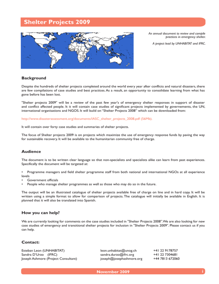 Shelter Projects 2009 An annual document to review and compile practices in emergency shelter. A project lead by UNHABITAT and IFRC. Background Despite the hundreds of shelter projects completed around the world every year after conflicts and natural disasters, there are few compilations of case studies and best practices. As a result, an opportunity to consolidate learning from what has gone before has been lost. "Shelter projects 2009" will be a review of the past few year's of emergency shelter responses in support of disaster and conflict affected people. It it will contain case studies of significant projects implemented by governements, the UN, international organisations and NGOS. It will build on “Shelter Projects 2008” which can be downloaded from: http://www.disasterassessment.org/documents/IASC_shelter_projects_2008.pdf (56Mb). It will contain over forty case studies and summaries of shelter projects. The focus of Shelter projects 2009 is on projects which maximize the use of emergency response funds by paving the way for sustainable recovery. It will be available to the humanitarian community free of charge. Audience The document is to be written clear language so that non-specialists and specialists alike can learn from past experiences. Specifically the document will be targeted at: • Programme managers and field shelter programme staff from both national and international NGOs at all experience levels • Government officials • People who manage shelter programmes as well as those who may do so in the future. The output will be an illustrated catalogue of shelter projects available free of charge on line and in hard copy. It will be written using a simple format to allow for comparison of projects. The catalogue will initially be available in English. It is planned that it will also be translated into Spanish. How you can help? We are currently looking for comments on the case studies included in "Shelter Projects 2008". We are also looking for new case studies of emergency and transitional shelter projects for inclusion in "Shelter Projects 2009". Please contact us if you can help. Contact: Esteban Leon (UNHABITAT) Sandra D’Urzo (IFRC) Joseph Ashmore (Project Consultant) [email protected] [email protected] [email protected] November 2009 +41 22 9178757 +41 22 7304681 +44 7813 672060 i