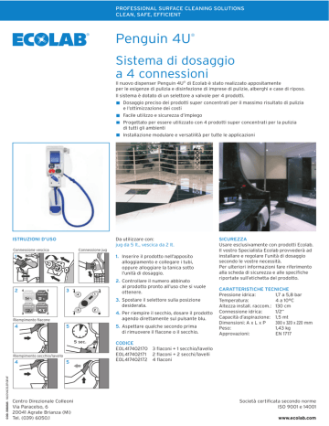 PROFESSIONAL SURFACE CLEANING SOLUTIONS CLEAN, SAFE, EFFICIENT ® Penguin 4U Sistema di dosaggio a 4 connessioni Il nuovo dispenser Penguin 4U® di Ecolab è stato realizzato appositamente per le esigenze di pulizia e disinfezione di imprese di pulizie, alberghi e case di riposo. Il sistema è dotato di un selettore a valvole per 4 prodotti. Dosaggio preciso dei prodotti super concentrati per il massimo risultato di pulizia e l’ottimizzazione dei costi Facile utilizzo e sicurezza d’impiego Progettato per essere utilizzato con 4 prodotti super concentrati per la pulizia di tutti gli ambienti Installazione modulare e versatilità per tutte le applicazioni ISTRUZIONI D’USO Da utilizzare con: jug da 5 lt., vescica da 2 lt. Connessione vescica Connessione jug 1 2 1. Inserire il prodotto nell’apposito alloggiamento e collegare i tubi, oppure alloggiare la tanica sotto l’unità di dosaggio. 2. Controllare il numero abbinato al prodotto pronto all’uso che si vuole ottenere. 3 3. Spostare il selettore sulla posizione desiderata. 4. Per riempire il secchio, dosare il prodotto agendo direttamente sul pulsante blu. Riempimento flacone 4 5 5. Aspettare qualche secondo prima di rimuovere il flacone o il secchio. 5 sec. Riempimento secchio/lavello COD. E058585 - NUOVACELERGRAF 4 5 Centro Direzionale Colleoni Via Paracelso, 6 20041 Agrate Brianza (Mi) Tel. (039) 6050.1 SICUREZZA Usare esclusivamente con prodotti Ecolab. Il vostro Specialista Ecolab provvederà ad installare e regolare l’unità di dosaggio secondo le vostre necessità. Per ulteriori informazioni fare riferimento alla scheda di sicurezza e alle specifiche riportate sull’etichetta del prodotto. CARATTERISTICHE TECNICHE Pressione idrica: 1,7 a 5,8 bar Temperatura: 4 a 10°C Altezza install. raccom.: 130 cm Connessione idrica: 1/2” Capacità d’aspirazione: 1,5 mt Dimensioni: A x L x P 300 x 320 x 220 mm Peso: 1,43 kg Approvazioni: EN 1717 CODICE E0L417402170 3 flaconi + 1 secchio/lavello E0L417402171 2 flaconi + 2 secchi/lavelli E0L417402172 4 flaconi Società certificata secondo norme ISO 9001 e 14001 www.ecolab.com