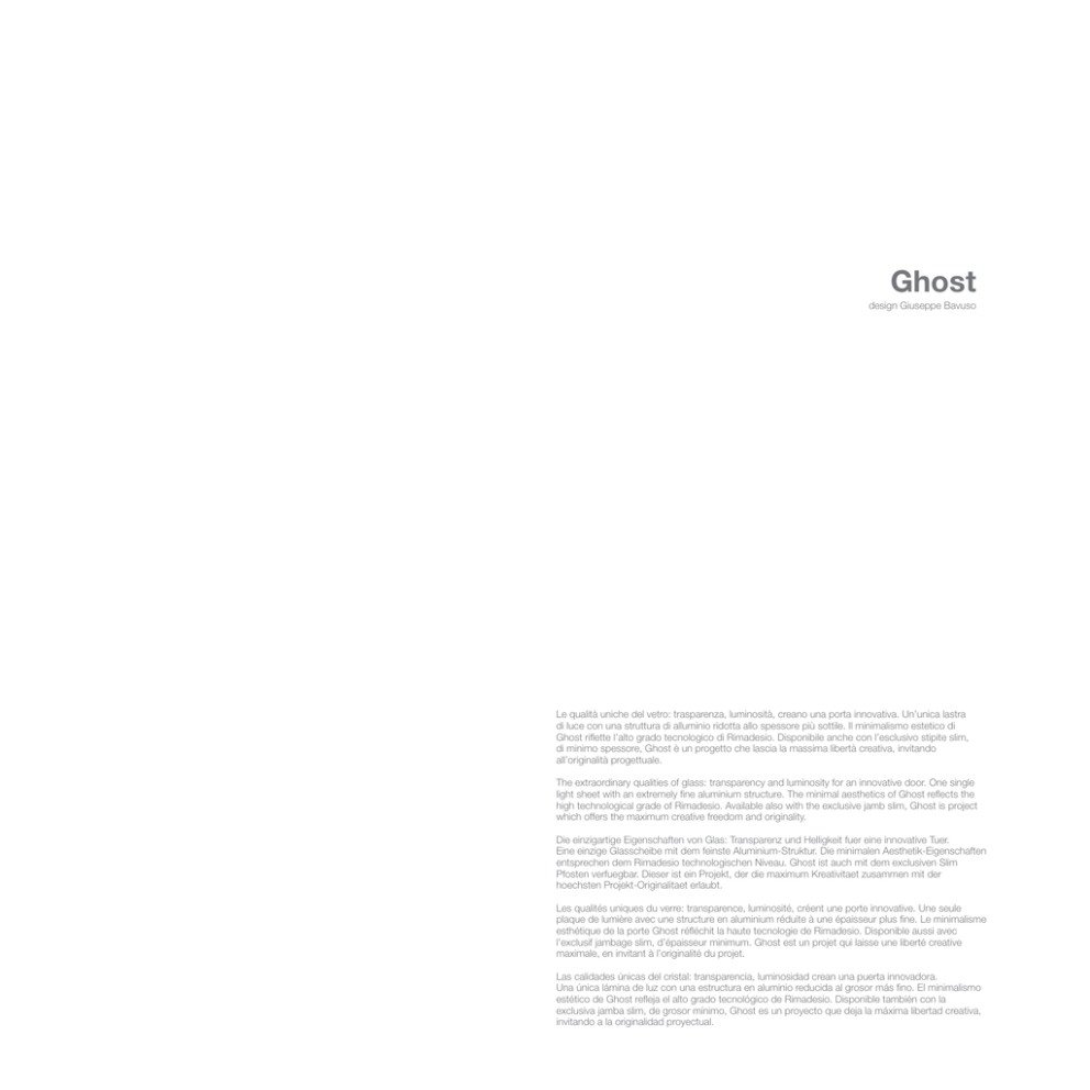 Ghost design Giuseppe Bavuso Le qualità uniche del vetro: trasparenza, luminosità, creano una porta innovativa. Un’unica lastra di luce con una struttura di alluminio ridotta allo spessore più sottile. Il minimalismo estetico di Ghost riflette l’alto grado tecnologico di Rimadesio. Disponibile anche con l’esclusivo stipite slim, di minimo spessore, Ghost è un progetto che lascia la massima libertà creativa, invitando all’originalità progettuale. The extraordinary qualities of glass: transparency and luminosity for an innovative door. One single light sheet with an extremely fine aluminium structure. The minimal aesthetics of Ghost reflects the high technological grade of Rimadesio. Available also with the exclusive jamb slim, Ghost is project which offers the maximum creative freedom and originality. Die einzigartige Eigenschaften von Glas: Transparenz und Helligkeit fuer eine innovative Tuer. Eine einzige Glasscheibe mit dem feinste Aluminium-Struktur. Die minimalen Aesthetik-Eigenschaften entsprechen dem Rimadesio technologischen Niveau. Ghost ist auch mit dem exclusiven Slim Pfosten verfuegbar. Dieser ist ein Projekt, der die maximum Kreativitaet zusammen mit der hoechsten Projekt-Originalitaet erlaubt. Les qualités uniques du verre: transparence, luminosité, créent une porte innovative. Une seule plaque de lumière avec une structure en aluminium réduite à une épaisseur plus fine. Le minimalisme esthétique de la porte Ghost réfléchit la haute tecnologie de Rimadesio. Disponible aussi avec l’exclusif jambage slim, d’épaisseur minimum. Ghost est un projet qui laisse une liberté creative maximale, en invitant à l’originalité du projet. Las calidades únicas del cristal: transparencia, luminosidad crean una puerta innovadora. Una única lámina de luz con una estructura en aluminio reducida al grosor más fino. El minimalismo estético de Ghost refleja el alto grado tecnológico de Rimadesio. Disponible también con la exclusiva jamba slim, de grosor mínimo, Ghost es un proyecto que deja la máxima libertad creativa, invitando a la originalidad proyectual. Ghost Porta battente Swing door L’ampiezza progettuale della collezione Rimadesio: la possibilità di realizzare spazi con le funzioni più diverse, caratterizzati da un design rigoroso e dalla massima versatilità. Ghost, come la maggior parte delle proposte Rimadesio, prevede la realizzazione su misura, per garantire la più totale libertà di collocazione. In questa pagina: porta Ghost battente a tutta altezza, struttura alluminio e vetro acidato grigio. The Rimadesio collection wide range design: space may be arranged according to the most diverse functions, characterized by rigorous design and the highest versatility. Ghost, as most of Rimadesio options, provides for customized manufacturing, in order to guarantee the greatest freedom in installation. On this page: Ghost, a full-length hinged door, aluminium frame and etched grey glass. Das internationale Angebot bei Rimadesio: die Möglichkeit, Räume mit den unterschiedlichsten Funktionen zu gestalten, die sich durch rigoroses Design und maximale Vielfalt auszeichnen. Ghost ermöglicht, wie auch der größte Teil der Rimadesio-Lösungen, eine Arbeit auf Maß und bietet somit größtmögliche Freiheit bei der Anordung. Auf dieser Seite: Türflügel Ghost über die gesamte Höhe, Aluminiumstruktur und grau geätztes Glas. L’ampleur conceptuelle de la collection Rimadesio: la possibilité de réaliser des espaces avec les fonctions les plus diverses, caractérisés par un design rigoureux et par une versatilité maximale. Comme la plupart des propositions Rimadesio, Ghost prévoit la réalisation sur mesure afin de garantir la liberté d’emplacement la plus totale. Sur cette page: porte Ghost battante sur toute la hauteur, structure en aluminium et verre acidé gris. La amplitud de diseño de la colección Rimadesio: la posibilidad de realizar espacios con las funciones más variadas, caracterizados por un diseño riguroso y por la máxima versatilidad. Ghost, como la mayoría de las propuestas Rimadesio, prevee la realización a medida, para garantizar la más absoluta libertad de colocación. En esta página: puerta Ghost batiente a toda altura, estructura de aluminio y cristal al ácido gris. 2 Ghost Porta battente Swing door 1 2 3 Copristipite telescopico in estruso d’alluminio Telaio perimetrale in estruso d’alluminio Pannello porta in vetro temperato laccato lucido grigio chiaro 1 2 3 Telescopic jamb in extruded aluminium Perimeter frame in extruded aluminium Door panel in tempered glass, glossy grigio chiaro lacquered 1 Teleskopzarge aus stranggepresstem Aluminium Rahmen aus stranggepresstem Aluminium Tür aus temperiertem hochglänzendem lackiertem Glas in Farbton Grigio Chiaro 2 2 3 1 2 3 1 2 3 Jambage télescopique en extrusion d’aluminium Cadre périmétral en extrusion d’aluminium Panneau porte en verre trempé laqué brillant grigio chiaro Cubrejamba telescópico en extrusión de aluminio Marco perimétrico en extrusión de aluminio Panel puerta en cristal templado lacado brillo grigio chiaro 1 3 4 Ghost Porta battente Swing door Ghost si caratterizza per essere la porta in cui il vetro diventa l’elemento strutturale, rifinito da un sottile telaio in estruso d’alluminio. Nella foto: porte Ghost con telaio alluminio e vetro laccato grigio chiaro. Ghost is characterised by the fact that with this door glass becomes a structural element, finished by a thin extruded aluminium frame. In the photo: Ghost doors with aluminium frame and grigio chiaro lacquered glass. Das Besondere bei der Tür Ghost ist, das hier das von einem schmalen Profil aus stranggepresstem Aluminium eingerahmte Glas zum tragenden Element wird. Auf dem Foto: Türen Ghost mit Aluminiumrahmen und glänzend lackiertem Glas in Farbton Grigio Chiaro. Ghost se distingue en étant la porte où le verre devient l’élément structurel, fini par un cadre fin en