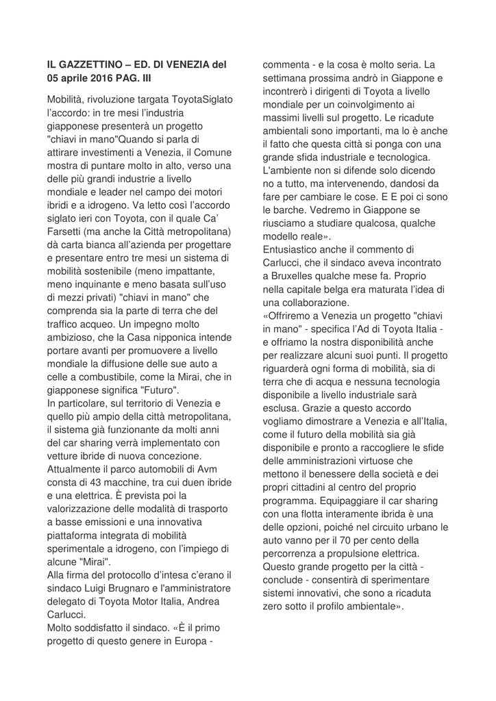 IL GAZZETTINO – ED. DI VENEZIA del 05 aprile 2016 PAG. III Mobilità, rivoluzione targata ToyotaSiglato l’accordo: in tre mesi l’industria giapponese presenterà un progetto "chiavi in mano"Quando si parla di attirare investimenti a Venezia, il Comune mostra di puntare molto in alto, verso una delle più grandi industrie a livello mondiale e leader nel campo dei motori ibridi e a idrogeno. Va letto così l’accordo siglato ieri con Toyota, con il quale Ca’ Farsetti (ma anche la Città metropolitana) dà carta bianca all’azienda per progettare e presentare entro tre mesi un sistema di mobilità sostenibile (meno impattante, meno inquinante e meno basata sull’uso di mezzi privati) "chiavi in mano" che comprenda sia la parte di terra che del traffico acqueo. Un impegno molto ambizioso, che la Casa nipponica intende portare avanti per promuovere a livello mondiale la diffusione delle sue auto a celle a combustibile, come la Mirai, che in giapponese significa "Futuro". In particolare, sul territorio di Venezia e quello più ampio della città metropolitana, il sistema già funzionante da molti anni del car sharing verrà implementato con vetture ibride di nuova concezione. Attualmente il parco automobili di Avm consta di 43 macchine, tra cui duen ibride e una elettrica. È prevista poi la valorizzazione delle modalità di trasporto a basse emissioni e una innovativa piattaforma integrata di mobilità sperimentale a idrogeno, con l’impiego di alcune "Mirai". Alla firma del protocollo d’intesa c’erano il sindaco Luigi Brugnaro e l'amministratore delegato di Toyota Motor Italia, Andrea Carlucci. Molto soddisfatto il sindaco. «È il primo progetto di questo genere in Europa - commenta - e la cosa è molto seria. La settimana prossima andrò in Giappone e incontrerò i dirigenti di Toyota a livello mondiale per un coinvolgimento ai massimi livelli sul progetto. Le ricadute ambientali sono importanti, ma lo è anche il fatto che questa città si ponga con una grande sfida industriale e tecnologica. L'ambiente non si difende solo dicendo no a tutto, ma intervenendo, dandosi da fare per cambiare le cose. E E poi ci sono le barche. Vedremo in Giappone se riusciamo a studiare qualcosa, qualche modello reale». Entusiastico anche il commento di Carlucci, che il sindaco aveva incontrato a Bruxelles qualche mese fa. Proprio nella capitale belga era maturata l’idea di una collaborazione. «Offriremo a Venezia un progetto "chiavi in mano" - specifica l’Ad di Toyota Italia e offriamo la nostra disponibilità anche per realizzare alcuni suoi punti. Il progetto riguarderà ogni forma di mobilità, sia di terra che di acqua e nessuna tecnologia disponibile a livello industriale sarà esclusa. Grazie a questo accordo vogliamo dimostrare a Venezia e all’Italia, come il futuro della mobilità sia già disponibile e pronto a raccogliere le sfide delle amministrazioni virtuose che mettono il benessere della società e dei propri cittadini al centro del proprio programma. Equipaggiare il car sharing con una flotta interamente ibrida è una delle opzioni, poiché nel circuito urbano le auto vanno per il 70 per cento della percorrenza a propulsione elettrica. Questo grande progetto per la città conclude - consentirà di sperimentare sistemi innovativi, che sono a ricaduta zero sotto il profilo ambientale».
