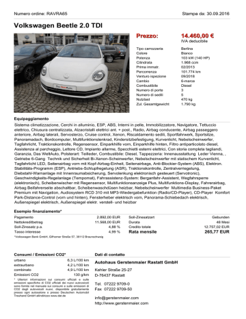 Numero ordine: RAVRA65 Stampa da: 30.09.2016 Volkswagen Beetle 2.0 TDI Prezzo: 14.460,00 € IVA deducibile Tipo carrozzeria Colore Potenza Cilindrata Prima immatr. Percorrenza Venturo ispezione Cambio Combustibile Numero di porte Numero di sedili Nutzlast Zul. Gesamtgewicht Berlina Bianco 103 kW (140 HP) 1.968 ccm 02/2013 101.774 km 09/2018 6-marce Diesel 3 5 470 kg 1.790 kg Equipaggiamento Sistema climatizzazione, Cerchi in alluminio, ESP, ABS, Interni in pelle, Immobilizzatore, Navigatore, Tettuccio elettrico, Chiusura centralizzata, Alzacristalli elettrici ant. + post., Radio, Airbag conducente, Airbag passeggero anteriore, Airbag laterali, Servosterzo, Cruise control, Xenon, Riscaldamento sedili, Sportfahrwerk, Sportsitze, Panoramadach, Bordcomputer, Multifunktionslenkrad, Kindersitzbefestigung, Kurvenlicht, Nebelscheinwerfer, Tagfahrlicht, Traktionskontrolle, Regensensor, Einparkhilfe vorn, Einparkhilfe hinten, Filtro antiparticolato diesel, Assistenza al parcheggio, Lettore CD, Impianto allarme, Specchietti esterni elettrici, Con storia completa tagliandi, Garanzia, Das WeltAuto, Polsterart: Teilleder, Combustibile: Diesel, Tappezzeria: Innenausstattung Leder Vienna, , Getriebe 6-Gang Technik und Sicherheit Bi-Xenon-Scheinwerfer, Nebelscheinwerfer mit statischem Kurvenlicht, Tagfahrlicht LED, Seitenairbag vorn mit Kopf-Airbag-Einheit, Seitenairbags, Anti-Blockier-System (ABS), Elektron. Stabilitäts-Programm (ESP), Antriebs-Schlupfregelung (ASR), Traktionskontrolle, Zentralverriegelung, Diebstahl-Warnanlage mit Innenraumabsicherung, Servolenkung elektronisch gesteuert (Servotronic), Geschwindigkeits-Regelanlage (Tempomat), Fahrassistenz-System: Berganfahr-Assistent, Wegfahrsperre (elektronisch), Scheibenwischer mit Regensensor, Multifunktionsanzeige Plus, Multifunktions-Display, Fahrerairbag, Airbag Beifahrerseite abschaltbar, Scheibenwaschdüsen heizbar, Nebelscheinwerfer Multimedia Business-Paket Premium mit Navigation, Audiosystem RCD 310 mit MP3-Wiedergabefunktion (Radio/CD-Player), CD-Player Komfort Park-Distance-Control (vorn und hinten), Fensterheber elektrisch vorn, Panorama-Schiebedach elektrisch, Außenspiegel elektrisch, Außenspiegel elektr. verstell- und heizbar Esempio finanziamento* Pagamento Nettokreditbetrag Soll-Zinssatz p.a. Tasso interesse 2.892,00 EUR 11.568,00 EUR 4,88 % 4,99 % Soll-Zinssatzart Durata Credito totale Gebunden 48 Mesi 12.757,02 EUR Rata mensile 265,77 EUR *Volkswagen Bank GmbH, Gifhorner Straße 57, 38112 Braunschweig Consumi / Emissioni CO2* urbano extraurbano combinato Emissioni CO2 Dati di contatto 6,3 L/100 km 4,2 L/100 km 4,9 L/100 km 130 g/km * Ulteriori informazioni sui consumi ufficiali e sulle emissioni specifiche di CO2 ufficiali dei nuovi autoveicoli sono fornite nel manuale sui consumi e sulle emissioni di CO2 degli autoveicoli nuovi, disponibile gratuitamente presso ogni autosalone o presso Deutschen Automobil Treuhand GmbH allindirizzo www.dat.de Autohaus Gerstenmaier Rastatt GmbH Kehler Straße 25-27 D-76437 Rastatt Tel. 07222 9709-0 Fax 07222 9709-50 [email protected] http://www.gerstenmaier.com Numero ordine: RAVRA65 Volkswagen Beetle 2.0 TDI Stampa da: 30.09.2016 Numero ordine: RAVRA65 Volkswagen Beetle 2.0 TDI Stampa da: 30.09.2016
