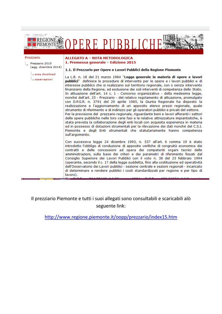 Il prezziario Piemonte e tutti i suoi allegati sono consultabili e scaricabili alò seguente link: http://www.regione.piemonte.it/oopp/prezzario/index15.htm __ ALLEGATO A – Nota metodologica ALLEGATO A – NOTA METODOLOGICA 2. IL DETTAGLIO DEL PREZZARIO REGIONALE – EDIZIONE 2015 2.1. Principi generali Il prezzario regionale costituisce guida e riferimento all'attività progettuale, fornendo un valido supporto all'attività del tecnico progettista, contemplando esclusivamente i requisiti e le caratteristiche minime attinenti alle singole forniture o lavorazioni; fornisce cioè, in generale, voci e prezzi applicabili a situazioni con caratteristiche medie che non sempre sono riscontrabili e direttamente applicabili ad ogni realtà; nel caso venissero adottati prezzi e voci diversi, gli stessi dovranno essere giustificati, così come previsto dalla normativa vigente (art.32 D.P.R. 207/2010 s.m.i.) dal progettista incaricato, con specifiche analisi prezzi1, che traducano precisamente l’intervento in esame, utilizzando, per queste, le voci elementari del prezzario nonché, in assenza di quest’ultime, prezzi elementari dedotti da listini ufficiali o da idonee indagini di mercato. Le responsabilità del progetto, delle scelte per la realizzazione delle opere e dei prezzi utilizzati, resta quindi di esclusiva competenza ed a totale carico del progettista. In nessun modo potrà essere modificata una qualsiasi voce del prezzario regionale, senza l’accompagnamento della relativa giustificazione dello scostamento realizzato attraverso la formulazione del relativo giustificativo di costo (analisi prezzi specifica). Ogni progetto è caratterizzato dalla sua “unicità” e “particolarità” ed è affidato alla responsabilità e professionalità del tecnico che lo predispone, avendo come obiettivo primario la definizione, quale risultato del computo metrico specifico relativo, del “prezzo congruo” ossia adeguato e sufficiente per l’opera in esame, in conformità a quanto previsto dagli art. 86 e 89 del D.Lgs. 163/2006. I prezzi si intendono riferiti ai lavori eseguiti con fornitura ed impiego di prodotti della migliore qualità e comprendono ogni prestazione di risorse umane occorrente per dare il lavoro compiuto “a regola d’arte2”, secondo le norme del buon costruire. Per quanto completo ed aggiornato annualmente, un prezzario non può contemplare tutte le soluzioni progettuali possibili ed immaginabili ma solo situazioni medie; da esse, per deduzione, è possibile ricavare l’applicazione per il caso specifico. E’ in quest’ottica che, indicativamente, per i lavori da realizzarsi in zone disagiate (collina, montagna ecc.), considerato anche l’incremento di costo della manodopera, così come previsto dal Contratto Collettivo Nazionale di Lavoro, in funzione della quota s.l.m. dei cantieri e delle oggettive difficoltà degli approvvigionamenti dei materiali, oltre che dei tempi di trasporto, per i prezzi riportati nelle sezioni, in base ad analisi e giustificazioni specifiche, si possono applicare incrementi percentuali medi variabili dal 15% al 20%. Inoltre con riferimento alla tipologia e all’estensione dei lavori previsti si ricorda la necessità di una corretta ed equa valutazione della procedura di affidamento scelta, al fine di garantite il giusto riconoscimento anche per l’esecuzione di lavorazioni di limitata e ridotta estensione (ad esempio la previsione di lavori in economia). Il Ministero delle Infrastrutture e dei Trasporti, Provveditorato Regionale per le Opere Pubbliche per il Piemonte e la Valle D'Aosta, in relazione alle specifiche attività d'istituto finalizzate alla demolizione delle opere abusive (L. 47/1985 e s.m.i.) nel territorio della 1 L’analisi dei prezzi delle singole voci consente di esplicitare analiticamente il costo della manodopera, dei noli, dei materiali, dei trasporti nonché delle spese generali e dell’utile di impresa; la disponibilità delle stesse consente di valutarne facilmente l’incidenza a seguito di revisione dei prezzi elementari rendendo agevole ed immediato l’aggiornamento relativo. La loro conoscenza è altresì utile per la verifica dell’anomalia delle offerte economiche in sede di gara d’appalto. 2 In una descrizione di opera compiuta si richiede sempre che una lavorazione venga realizzata “a regola d’arte” con riferimento al fatto che si prevede che l’opera verrà fatta seguendo tutte le precauzioni, le regole e, quindi, le tecniche del buon costruire relative a quel particolare manufatto. 6 __ ALLEGATO A – Nota metodologica Regione Piemonte, ha reso pubblico che si avvarrà di questo Prezzario Regionale, riportandolo a congruità, per le motivazioni espresse nel voto del proprio C.T.A. n. 1608 del 24.03.2004, mediante incremento dei prezzi del 25% per interventi di piccola portata di importo complessivo a base di appalto inferiore a Euro 10.000,00; con incremento del 15% per importo complessivo a base d'appalto compreso tra Euro 10.000,00 e Euro 50.000,00; senza alcun incremento nei casi in cui l'importo dei lavori sia superiore a Euro 50.000,00. Trattandosi, inoltre, di attività specifica da eseguirsi con particolari soggezioni, verrà riconosciuta all'Impresa la spesa, dalla stessa anticipata, per l'attivazione di una polizza assicurativa "tutti rischi" che tenga indenne l'Impresa e l'Ente appaltante per i rischi di responsabilità civile che l'intervento potrebbe causare. 2.2. La strutturazione ed i contenuti – L’utilizzo del prezzario La Regione Piemonte, dovendo procedere all'aggiornamento attinente l'anno 2014, valido per l'anno 2015, in attuazione dell'art. 133 comma 8 del D.Lgs. n. 163/2006 e s.m.i, nell'ottica di assicurare una sempre maggiore completezza dell'insieme, ha predisposto una nuova edizione denominata "Dicembre 2014", valevole per l'anno 2015. In generale il prezzario, quale strumento operativo di riferimento per tutti gli operatori pubblici e privati del settore, si p