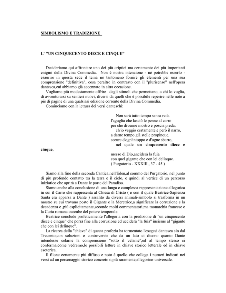 SIMBOLISMO E TRADIZIONE L' "UN CINQUECENTO DIECE E CINQUE” Desideriamo qui affrontare uno dei più criptici ma certamente dei più importanti enigmi della Divina Commedia. Non è nostra intenzione - nè potrebbe esserlo esaurire in questa sede il tema nè tantomeno fornire gli elementi per una sua comprensione "definitiva", cosa peraltro in contrasto con il "plurisenso" nell'opera dantesca,cui abbiamo già accennato in altra occasione. Vogliamo più modestamente offrire degli stimoli che permettano, a chi lo voglia, di avventurarsi su sentieri nuovi, diversi da quelli che è possibile reperire nelle note a piè di pagine di una qualsiasi edizione corrente della Divina Commedia. Cominciamo con la lettura dei versi danteschi: Non sarà tutto tempo sanza reda l'aguglia che lasciò le penne al carro per che divenne mostro e poscia preda; ch'io veggio certamente,e però il narro, a darne tempo già stelle propinque, secure d'ogn'intoppo e d'ogne sbarro, nel quale un cinquecento diece e cinque, messo di Dio,anciderà la fuia con quel gigante che con lei delinque. ( Purgatorio - XXXIII , 37 - 45 ) Siamo alla fine della seconda Cantica,nell'Eden,al sommo del Purgatorio, nel punto di più profondo contatto tra la terra e il cielo, e quindi al vertice di un percorso iniziatico che aprirà a Dante le porte del Paradiso. Siamo anche alla conclusione di una lunga e complessa rappresentazione allegorica in cui il Carro che rappresenta al Chiesa di Cristo ( e con il quale Beatrice-Sapienza Santa era apparsa a Dante ) assalito da diversi animali-simbolo si trasforma in un mostro su cui trovano posto il Gigante e la Meretrice,a significare la corruzione e la decadenza e ,più esplicitamente,secondo molti commentatori,ma monarchia francese e la Curia romana succube del potere temporale. Beatrice conclude profeticamente l'allegoria con la predizione di "un cinquecento diece e cinque" che porrà fine alla corruzione ed ucciderà "la fuia" insieme al "gigante che con lei delinque". La ricerca della "chiave" di questa profezia ha tormentato l'esegesi dantesca sin dal Trecento,con soluzioni e controversie che da un lato ci dicono quanto Dante intendesse celarne la comprensione "sotto il velame",ed al tempo stesso ci conferma,come vedremo,le possibili letture in chiave storico letterale ed in chiave esoterica. Il filone certamente più diffuso e noto è quello che collega i numeri indicati nei versi ad un personaggio storico concreto o,più raramente,allegorico-universale. Nella numerazione romana,unica conosciuta ed utilizzata ai tempi di Dante,il "cinquecento diece e cinque" diventa DXV e,con una semplice trasposizione,DVX,ossia duce,condottiero inviato da Dio. Questa tesi trova riscontro già nei primi commentatori,Pietro di Dante e Iacopo della Lana e,con i continui riferimenti alla profezia del Veltro nell'Inferno,si aggancia alle indicazioni del DVX personaggio storico ( più diffusamente l'Imperatore Enrico VII o Cangrande della Scala ),fino agli studiosi dei nostri giorni. Accanto a questa tesi,da qualcuno definita "ghibellina",c'è un fiorire di tesi "guelfe",che vedono nel DXV ad esempio un "Domini Xristi Vicarius e quindi un Pontefice ( per alcuni Benedetto XI) che trarrà la Curia romana fuori dalla corruzione e dal dominio del potere temporale. Meno storicamente connotabile la tesi del Rossetti che,utilizzando anche l"un" del verso profetico,indica I D X e V ( in sequenza un,cinquecento,dieci,e,cinque )ossia,con un anagramma, IUDEX,un giudice consacrato da Dio ed inviato a punire peccati e colpe del potere spirituale e temporale in terra. Più complessa ed articolata l'interpretazione della profezia con riferimento ad un'epoca. Diffusa l'interpretazione di una data storica: sommando al 515 ( cinquecento dieci e cinque ) l'anno 800 dell'incoronazione di Carlo Magno a imperatore del Sacro Romano Impero,si ottiene il 1315,anno di incoronazione di Ludovico di Baviera,ma anche anno in cui si compiranno molte profezie,secondo il "De semine scriptorum",libro profetico all'epoca molto diffuso,anno anche molto "vicino" al tempo in cui Dante componeva il divino poema ed in cui 'viveva" le sue speranze di riscatto. Alla tesi numerologica si collegano molte delle interpretazioni della "transizione" da un'epoca all'altra,che fanno riferimento agli influssi che esercitarono su Dante le profezie di Gioacchino da Fiore sul rinnovamento della Chiesa di Cristo: al termine dei cinquecento anni come quinta età e al sorgere della sesta età,era in cui verrà il nuovo redentore. Alla stessa stregua può essere ripreso il DXV come profezia dell'imminente fine del mondo,cui peraltro Dante fa riferimento anche nel Convivio,caratteristica di molte sette francescane e spiritualiste del tempo: il DXV sarebbe pertanto il Cristo che ritorna,alla fine del tempo,a risollevare le sorti della sua chiesa. C'è infine un terzo filone di interpreti,peraltro meno numeroso,che individua nel misterioso personaggio, evocato da Beatrice,Dante stesso. L'ipotesi che fa del Veltro e del DXV la persona del poeta si sviluppa soprattutto a fine '800 ed evolve sino ai giorni nostri. Da segnalare al riguardo l'interessante analisi del Mazzoleni secondo cui,numerando i versi della Commedia secondo una progressione numerica,al 515 verso troviamo la terzina in cui Dante parla si se stesso nel consesso dei sapienti: e più d'onore ancora assai mi fenno ch'è si mi fecer dello loro schiera sì ch'io fui sesto tra cotanto senno. ( Inferno - IV, 100 - 102 ) Fin qui le interpretazioni più note,per le quali,pur senza confutarne una validità in chiave storico-letteraria,occorre rilevare come le diverse epoche abbiano un poco messo in bocca a Dante ciò che volevano sentirgli dire. La più corrente,quella del DXV = DVX,su cui si fondano buona parte dei tentativi di dare una connotazione concreta al personaggio o all'epoca,appare la più superficiale e per certi versi un poco ingenua. E' abbastanza incredibile che Dante, maestro dell'allegoria e del simb