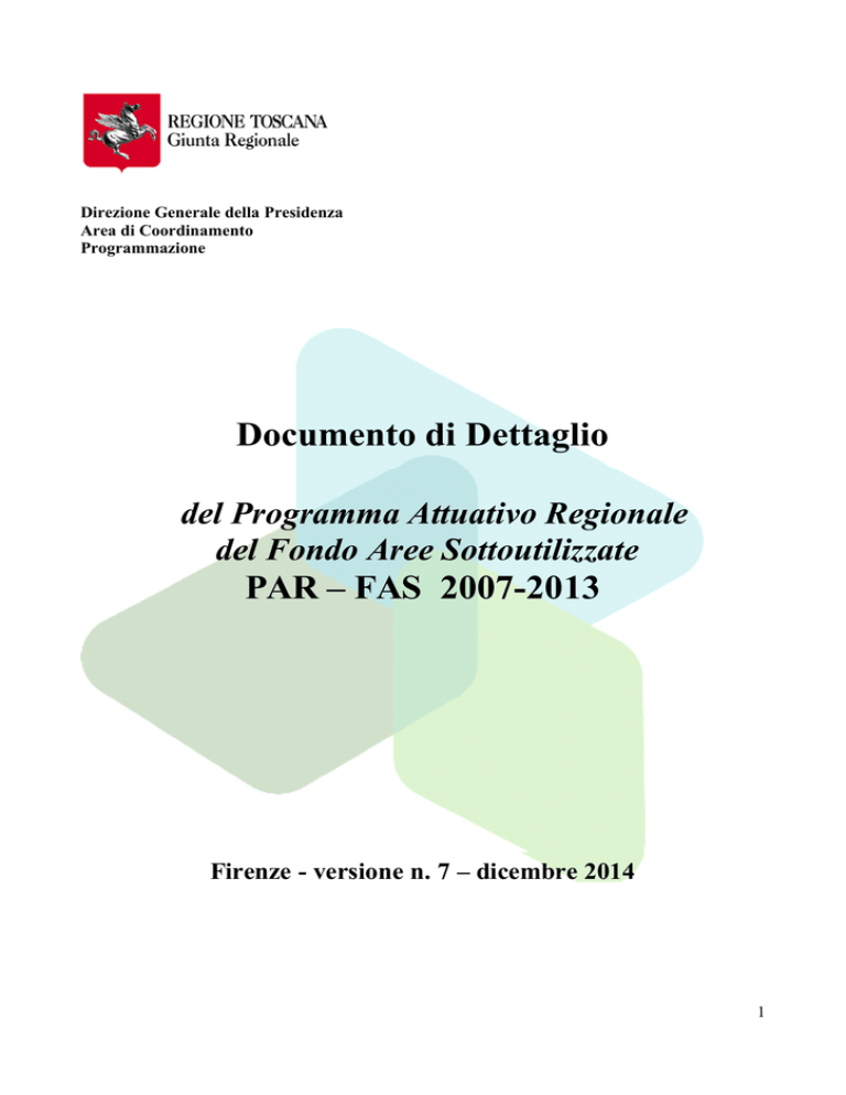 Direzione Generale della Presidenza Area di Coordinamento Programmazione Documento di Dettaglio del Programma Attuativo Regionale del Fondo Aree Sottoutilizzate PAR – FAS 2007-2013 Firenze - versione n. 7 – dicembre 2014 1 DOCUMENTO DI DETTAGLIO PAR FAS INDICE PARTE GENERALE ……………………………………………………………………….……......5 1 – ORGANIZZAZIONE.................................................................................................................. .5 2 – SELEZIONE DEGLI INTERVENTI............................................................................................6 2.1 Procedure di selezione………………………………………………………………….…...6 2.2 Criteri di selezione…………………………………………………………………...….…..7 2.3 Spese ammissibili …………………………………………………………………………..7 3 - CIRCUITO FINANZIARIO..........................................................................................................8 3.1 Infrastrutture………………………………………………………………………………...8 3.2 Regimi di aiuto………………………………………………………………………….....10 3.3 Interventi non configurabili come regime di aiuto o come infrastrutture…………...…….10 4 - OBBLIGHI DEI BENEFICIARI.................................................................................................11 5 - PIANO FINANZIARIO...............................................................................................................11 DETTAGLIO SCHEDE…………………………………………………………………………….13 ASSE 1 – Linea di Azione 1.1 (ex sottoprogetto 1.1.a) Sistema Pubblico della Ricerca………..14 Azione 1.1.1 (ex Linea di Azione 1.1.a.1) – Sostegno alla realizzazione di progetti di ricerca in materia di energia e ambiente, accessibilità, mobilità logistica e sicurezza, territorio e paesaggio.............................................................................................................15 Azione 1.1.2 (ex Linea di Azione 1.1.a.2) – Sostegno alla realizzazione di progetti di ricerca in materia di qualità della vita, salute dell’uomo, biomedicale, industria dei farmaci innovativi................................................................................................................................23 Azione 1.1.3 (ex Linea di Azione 1.1.a.3) – Scienze socio-economiche e umane ................................................................................................................................................30 ASSE 1 – Linea di Azione 1.2 (ex Linea di Azione 1.1.b.1) Ricerca Industriale e Sviluppo 2 Sperimentale……………………………………………………………………………….. 37 Azione 1.2.1 (ex Linea di Azione 1.1.b.1.1) – Potenziamento delle attività di ricerca industriale e sviluppo sperimentale: il Distretto Tecnologico…………………….…………… 38 Azione 1.2.2 (ex Linea di Azione 1.1.b.1.3) – Aiuti per il sostegno a programmi di investimento delle imprese per l’innovazione anche attraverso il sostegno alla domanda di servizi avanzati e qualificati............................................................................................. .44 ASSE 1 – Linea di Azione 1.3 (ex Linea di Azione 1.3.1) Infrastrutture per i Settori produttivi…………………………………………………….…………………………..….49 ASSE 1 – Linea di Azione 1.4 (ex Linea di Azione 1.3.2) Interventi di sostegno alle PMI….…56 ASSE 1 – Linea di Azione 1.5 (ex PIR 4.2) Società dell’Informazione…………………………63 Azione 1.5.1 (ex Linea di Azione 4.2.1) – Infrastrutturazione e logistica centrale della rete telematica regionale …………………………………………………..………….………………...64 Azione 1.5.2 (ex Linea di Azione 4.2.2) – Infrastrutturazione e servizi VOIP e multivideo conferenza..............................................................................................................................67 Azione 1.5.3 (ex Linea di Azione 4.2.3) – Infrastrutturazione e servizi , sviluppo di sistemi di interconnessione nell’offerta formativa..............................................................................72 Azione 1.5.4 (ex Linea di Azione 4.2.4) – Supporto al sistema regionale della giurisdizione penale, civile e amministrativa anche in relazione all’abbattimento dei costi e dei tempi relativi al contenzioso civile e penale con l’obiettivo di migliorare la competitività sul territorio e attrarre investimenti……………………………………………………….. ...............76 ASSE 1 – Linea di Azione 1.6 Riqualificazione e riconversione del polo industriale di piombino……………………………………………………………………………………………….79 Azione 1.6. A – Interventi di sostegno alle imprese Azione 1.6.B - Interventi infrastrutturali, nel rispetto delle normative in materia di aiuti di stato e di appalti, per la realizzazione, il recupero e la riqualificazione di aree da destinare a centri di competenza per il trasferimento tecnologico, l’innovazione e la creazione di nuove imprese, nonché a insediamenti produttivi finalizzati alla localizzazione di PMI ASSE 2 – Linea di Azione 2.1 (ex Linea di Azione 3.4.1) Difesa del suolo dal rischio idrogeologico……………………………………………………………………….……….97 ASSE 2 – Linea di Azione 2.2 (ex Linea di Azione 3.4.2) Tutela integrata delle risorse idriche……………………………………………………………………….……………..102 ASSE 3 – Linea di Azione 3.1 (ex Linea 