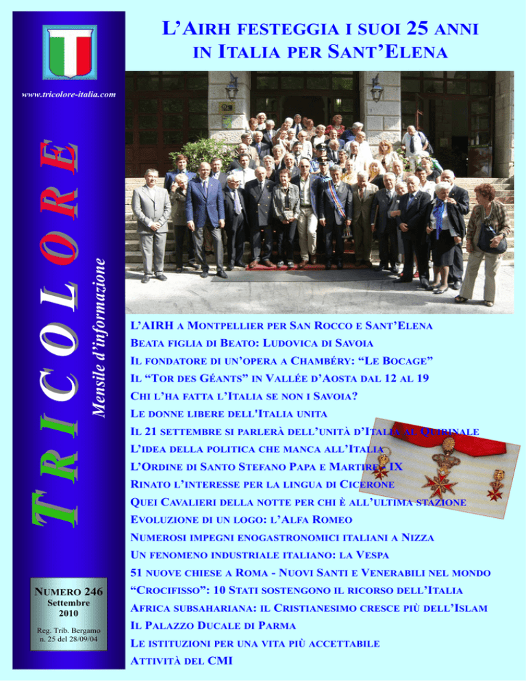 L’AIRH FESTEGGIA I SUOI 25 ANNI IN ITALIA PER SANT’ELENA Mensile d’informazione TRICOLORE www.tricolore-italia.com L’AIRH A MONTPELLIER PER SAN ROCCO E SANT’ELENA BEATA FIGLIA DI BEATO: LUDOVICA DI SAVOIA IL FONDATORE DI UN’OPERA A CHAMBÉRY: “LE BOCAGE” IL “TOR DES GÉANTS” IN VALLÉE D’AOSTA DAL 12 AL 19 CHI L’HA FATTA L’ITALIA SE NON I SAVOIA? LE DONNE LIBERE DELL'ITALIA UNITA IL 21 SETTEMBRE SI PARLERÀ DELL’UNITÀ D’ITALIA AL QUIRINALE L’IDEA DELLA POLITICA CHE MANCA ALL’ITALIA L’ORDINE DI SANTO STEFANO PAPA E MARTIRE - IX RINATO L’INTERESSE PER LA LINGUA DI CICERONE QUEI CAVALIERI DELLA NOTTE PER CHI È ALL’ULTIMA STAZIONE EVOLUZIONE DI UN LOGO: L’ALFA ROMEO NUMEROSI IMPEGNI ENOGASTRONOMICI ITALIANI A NIZZA UN FENOMENO INDUSTRIALE ITALIANO: LA VESPA 51 NUOVE CHIESE A ROMA - NUOVI SANTI E VENERABILI NEL MONDO NUMERO 246 Settembre 2010 Reg. Trib. Bergamo n. 25 del 28/09/04 “CROCIFISSO”: 10 STATI SOSTENGONO IL RICORSO DELL’ITALIA AFRICA SUBSAHARIANA: IL CRISTIANESIMO CRESCE PIÙ DELL’ISLAM IL PALAZZO DUCALE DI PARMA LE ISTITUZIONI PER UNA VITA PIÙ ACCETTABILE pagina 1 - numero 246, Settembre 2010 ATTIVITÀ DEL CMI TRICOLORE www.tricolore-italia.com AIRH: XXI FESTA DI SANT’ELENA A SANT’ANNA DI VALDIERI Come ogni anno, anche nel 2010 Sant’Anna di Valdieri è stata il teatro di una commovente e significativa celebrazione della festa liturgica di Sant'Elena, con un pensiero particolarmente rivolto alla seconda Regina d'Italia. Per la 21a volta, la cerimonia è stata organizzata dall'Associazione Internazionale Regina Elena, che il 24 agosto 1996 edificò un monumento alla "Regina della Carità" nella pineta della frazione di Sant'Anna della cittadina cuneese (a m. 1.011 d’altezza). Nel 2009, la festa ebbe luogo il 16 agosto, memoria liturgica di S. Rocco, patrono dell’Associazione. Naturalmente, anche nel 2010 Montpellier ha festeggiato questo apostolo della carità. Purtroppo, però, “le truppe” dell’Airh hanno dovuto dividersi, per ricordare anche nell’amata capitale del Linguadoca la “Regina della Carità”, che in quel luogo attende ancora la sepoltura nella Basilica del Pantheon di Roma con il consorte, il figlio e la nuora. A Valdieri S.A.R. il Principe Sergio di Jugoslavia era accompagnato dal Delegato Generale Internazionale e dal Gen. Ennio Reggiani, Presidente Nazionale, con l’intero Consiglio Direttivo e tanti delegati, fiduciari ed amici, tra i quali la cara Marta Bluotto, che hanno accolto con viva simpatia e calore le LL.AA.RR. la Principessa Reale Maria Pia di Savoia, il Principe Michele di Borbone di Parma ed il Principe Dimitri di Jugoslavia. Erano presenti il Comandante provinciale dei Carabinieri, Col. Francesco Laurenti, il Sindaco di Valdieri, Emanuel Parraco- pagina 2 - numero 246, Settembre 2010 Pri m apa gin a Il Presidente Onorario Internazionale della “Regina Elena” è accolto dal Presidente Nazionale Onorario ne (con fascia tricolore), il Consigliere Provinciale Piermarco Giordano (con fascia), l’Assessore di Entracque Avv. Massimiliano Fantino, il Presidente della Comunità Montana delle Valli Gesso e Vermenagna Ugo Boccacci, il Conte Gianmarco Custoza, la Contessa Anna Custoza, il Conte Guglielmo Guidobono Cavalchini con la Contessa ed il Marchese Alessandro Perrone di San Martino con il figlio Ettore. I membri dell'AIRH provenivano da tutta l’Italia settentrionale, dalla Toscana, dal Lazio, dalla Marche, dalla Campania e dalla Francia. Nella suggestiva pineta più di 300 fedeli hanno assistito alla S. Messa al campo, presieduta dal Vicario Generale della Diocesi di Cuneo, Padre Giovanni Battista Riberi, che ha portato il saluto di S.E.R. Mons. Giuseppe Cavalletto, Vescovo di Cuneo e Fossano, e ricordato i dirigenti dell’AIRH richiamati a Dio, in particolare S.E. il Cavaliere Duca Gianni La commovente celebrazione, di Santaseverina e S.E. il Principe don presieduta dal Vicario Generale Paolo Boncompagni Ludovisi, già Presidenti nazionali onorari; il primo Presidente nazionale, Amm. Sq. Antonio Cocco e suo nipote Umberto; il Presidente internazionale emerito Barone Roberto Ventura e la consorte Pia; Guy Molina e Giampiero Rellini; Eduardo Bove, il Gen. Luigi Cardarelli, Luca Carrano, Raimondo Civalleri, Giorgio Machnich, Mai Liss Matossian, Franco Mattavelli, Marco Mazzola, Ada Miale, Alcide Muratore, Gianfranco Novarese, la Nob. Maria Antonietta de Portis, Renato Riparbelli, Don Giuseppe Sempio e Vincenzo Testa. Sono stati ricordati anche Mauro Rabbia, Dante Cuselli, Angioletta Re, la Contessa Guidobono Cavalchini e S.A.R. il Duca di Parma Carlo Ugo, recentemente chiamati a Dio. La commovente celebrazione è stata animata dal coro della parrocchia di Sant’Anna. TRICOLORE www.tricolore-italia.com PRIMAPAGINA I PRIMI 25 ANNI DI SERVIZIO NELLA FEDELTÀ ALLA TRADIZIONE Dopo la S. Comunione, ha preso la parola il Presidente Nazionale Onorario, Nob. Dr. Francesco Carlo Griccioli della Grigia, venuto appositamente da Siena per questa giornata: “Reverendo Padre Vicario Generale, Signor Sindaco, Egregie Autorità, Signore e Signori, nella veste di Presidente Nazionale Onorario è un onore ed un piacere poter accogliere a questa 21^ Festa di Sant'Elena, organizzata dall'Associazione Internazionale Regina Elena, le LL.AA.RR. la Principessa Reale Maria Pia di Savoia ed il Principe Michele di Borbone di Parma assieme a S.A.R. il Principe Dimitri di Jugoslavia ed a S.A.R. il Principe Sergio di Jugoslavia, il nostro Presidente Internazionale, che assai spesso è stato presente a questa giornata annuale così significativa. Non siamo qui riuniti con nostalgia di un passato al quale tuttavia non possiamo non essere profondamente attaccati, ma soprattutto per una convinta fedeltà ad una tradizione che per decenni ha permesso una simbiosi tra Casa Savoia e la gente della Valle Gesso e particolarmente di Valdieri. Proprio nel ricordo della Regina Elena, che nel Cuneese, così come ovunque, e