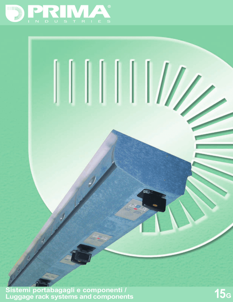 Sistemi portabagagli e componenti / Luggage rack systems and components G 2 Cappelliere personalizzate Custom-made Luggage Racks PRIMA, forte di anni d’esperienza in componenti e soluzioni per veicoli urbani, pone come top di gamma un prodotto dove innovazione, ricerca e tecnologia trovano la loro massima espressione: le cappelliere, sintesi perfetta tra tradizione, design e funzionalità. Thanks to years of experience on components and solutions for urban vehicles, PRIMA can launch, at the top of its range of products, luggage racks which express the highest level of innovation, research and technology , a perfect synthesis of tradition, design and functionality. La ricerca di PRIMA per offrire soluzioni altamente personalizzate non finisce mai, dalle finiture dei tessuti alla scelta dei rivestimenti, fino alla massima tecnologia adattabile in piccoli spazi, fanno delle nostre cappelliere un prodotto unico, di facile e veloce installazione su qualsiasi modello di veicolo. La modularità, abbinata ad un vastissimo assortimento di accessori di propria produzione, dalle luci, alle postazioni multimediali, fino all’impianto di areazione, fanno delle cappelliere PRIMA, la soluzione unica per gli addetti ai lavori del settore trasporto passeggeri su gomma e rotaia. Our never-ending research is meant to offer highly personalized solutions which range from material refinements and choice of covering to the highest technology for small spaces which make PRIMA’s luggage racks a unique product with its easy and quick installation on any vehicle model. PRIMA offers a composition of modular units with a vast assortment of selfmanufactured accessories: lighting, multimedia seating, air conditioning. The best solution for those who work in the road and railway passenger transport field and want to choose a one and only supplier to refer to. Certified ISO 9001:2000 I n d i c e i n d e x Cappelliere per bus turistici - Luggage racks for de luxe coaches 4 P.1000 Planet pag.8 P.1350 Venus pag.12 P.1400 EasyRACK pag.14 I n d i c e i n d e x Cappelliere per bus urbani-interurbani - Luggage racks for city-intercity buses P.1050 Delta pag.16 P.1150 Moon pag.18 P.1150 Moon intercity pag.18 P.1200 Sun pag.20 5 I n d i c e i n d e x Multiset - Multiset 6 P.389 pag.22 P.121 pag.29 P.340 pag.23 P.75 pag.30 P.158 pag.24 P.172 pag.31 P.148 pag.26 P.78 / 78R pag.32 P.140 pag.27 P.390 pag.33 P.166 pag.28 P.160 pag.34 I n d i c e i n d e x P.159 pag.35 P.71 pag.39 P.234 / 248 pag.36 P.72 pag.40 P.171 pag.37 P.235 pag.41 P.77 pag.38 7 Legenda Contents materiale - material colore - colour n° pezzi confezione - package items volume imballo - package volume peso confezione - package weight ricambi - spare parts vedi sezione tecnica - see technical section accessori - accessories versioni a richiesta: contattare l’ufficio commerciale version available on request: please contact our sales department materiale disponibile a stock - material available on stock materiale non disponibile a stock - material not available on stock lotto minimo d’acquisto - minimum purchasing lot bus urbano - city bus descrizione e impiego description and use sezione utile passaggio aria - open air flow section temperatura di esercizio - working temperature comportamento alla fiamma - behaviour under flame spia luminosa rossa - red pilot light pulsante di richiesta fermata “STOP” - “STOP” request push button altoparlante - loudspeaker interruttore luci - light switch chiamata hostess - hostess call lampadina - bulb luce blu notturna - blue night light cablaggio - wiring multiset aria luce - air light multiset reglette - light assembly tessuto - fabric diffusione aria centralizzata - centralized air diffusion mancorrenti - handrails P.1000 PLANET Caratteristiche Features Bus turistico / Deluxe Coach Canali in ABS o alluminio (secondo codice), accessori in compound ABS or Aluminium profiles (according to item code) accessories in compound. Sistemi comfort passeggeri Passenger’s comfort systems Secondo codice - According to item code 5 pezzi / pieces Secondo codice - According to item code Secondo codice - According to item code Imballo in cartone e/o cassa in legno Carton box or wooden case 19-20-23 pag. 43 Sezione tecnica - Technical section pag. 46-47 sezione/section Versione in ABS - ABS Version sezione/section X Y 590 544 Versione in Alluminio - Aluminium version 610 563 434 155 257 114 143 155 291 360 sezione/section Versione in Alluminio - Aluminium Version Z sezione/section W 438 392 Versione ABS/alluminio - ABS/ Aluminium Version 682 636 286 8 290 155 141 155 258 137 432 Cappelliere assemblate / Assembled luggage racks PLANET P.1000 Cod. Tipo/Type A) 4782 B) 4782 A) 6x2 seats B) 6x2 seats Type: P158 - cod.61601 Q.ty:6 Type: P158 - cod.61611 Q.ty:8 Q.ty: 10 (24V - 13W) ABS (sez.X) Int. / Inner: SKY Est. / Outer: BALTIC A) 6090 B) 6090 A) 7x2 seats B) 8x2 seats Type: P340 - cod.62329 Q.ty:8 Type: P340 - cod.62819 Q.ty:7 Q.ty: 10 (24V - 13W) ALU (sez.Y) Int. / Inner: SKY Est. / Outer: BALTIC A) 3995 B) 3995 A) 6x2 seats B) 6x2 seats Type: P158 - cod.61601 Q.ty:4 Type: P158 - cod.61611 Q.ty:8 Q.ty: 8 (24V - 13W) ABS (sez.X) Int. / Inner: SKY Est. / Outer: BALTIC A) 4300 B) 4300 A) 5x2 seats B) 5x2 seats Type: P340 - cod.65659 Q.ty:6 Type: P340 - cod.65599 Q.ty:4 Q.ty: 6 (12V - 13W) ABS (sez.X) Int. / Inner: SKY Est. / Outer: TX 25 A) 4360 B) 4880 A) 6x2 seats B) 7x2 seats Type: P158 - cod.61601 Q.ty:1 Type: P158 - cod.61611 Q.ty:12 Q.ty: 9 (24V - 13W) ABS (sez.X) Int. / Inner: SKY Est. / Outer: NO 64709 A) 3695 B) 4105 A) 5x2 seats B) 6x2 seats Type: P158 - cod.61601 Q.ty:3 Type: P158 - cod.61611 Q.ty:8 Q.ty: 9 (24V - 13W) ABS (sez.X) Int. / Inner: SKY Est. / Outer: NO 67099 A) 4750 B) 4750 A) 6x2 seats B) 7x2 seats Type: P158 - cod.61601 Q.ty:5 Type: P158 - cod.61611 Q.ty:8 Q.ty: 10 (24V - 13W) ABS (sez.X) Int. / Inner: SKY Est. / Outer: BALTIC 62291 A) 5503 B) 6333 A) 7x2 seats B) 7x1 seats Type: P158 - cod.62351 Q.ty:6 Typ