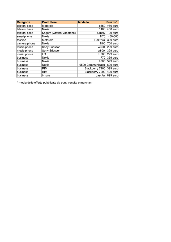 Categoria telefoni base telefoni base telefoni base smartphone fashion camera phone music phone music phone music phone business business business business business business Produttore Modello Motorola c350 Nokia 1100 Sagem (Offerta Vodafone) Simply Nokia N70 Motorola Razr V3i Nokia N90 Sony Ericsson w600i Sony Ericsson w800i LG U880 Nokia 770 Nokia 9300 Nokia 9500 Communicator RIM Blackberry 7100 RIM Blackberry 7290 i-mate Jas-Jar * media delle offerte pubblicate da punti vendita e merchant Prezzo* >50 euro >50 euro 99 euro 450-500 399 euro 700 euro 299 euro 399 euro 299 euro 359 euro 599 euro 699 euro 399 euro 429 euro 899 euro