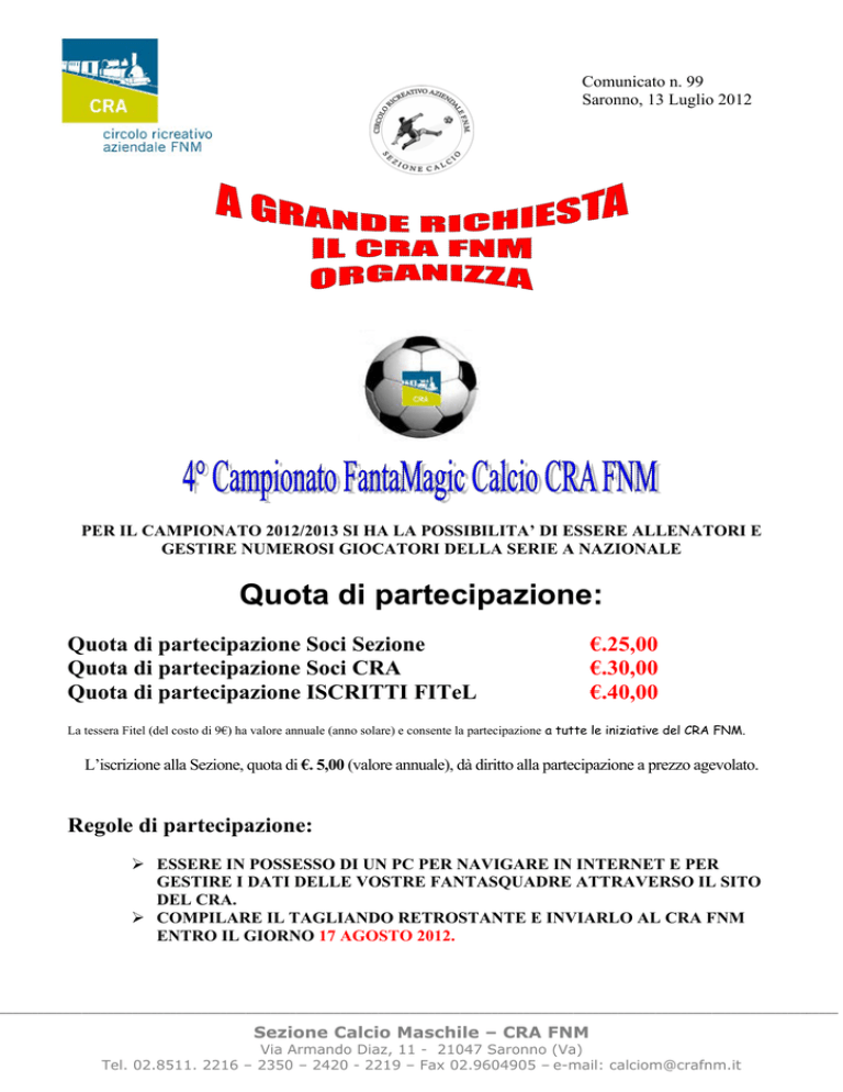 Comunicato n. 99 Saronno, 13 Luglio 2012 PER IL CAMPIONATO 2012/2013 SI HA LA POSSIBILITA’ DI ESSERE ALLENATORI E GESTIRE NUMEROSI GIOCATORI DELLA SERIE A NAZIONALE Quota di partecipazione: Quota di partecipazione Soci Sezione Quota di partecipazione Soci CRA Quota di partecipazione ISCRITTI FITeL €.25,00 €.30,00 €.40,00 La tessera Fitel (del costo di 9€) ha valore annuale (anno solare) e consente la partecipazione a tutte le iniziative del CRA FNM. L’iscrizione alla Sezione, quota di €. 5,00 (valore annuale), dà diritto alla partecipazione a prezzo agevolato. Regole di partecipazione: ESSERE IN POSSESSO DI UN PC PER NAVIGARE IN INTERNET E PER GESTIRE I DATI DELLE VOSTRE FANTASQUADRE ATTRAVERSO IL SITO DEL CRA. COMPILARE IL TAGLIANDO RETROSTANTE E INVIARLO AL CRA FNM ENTRO IL GIORNO 17 AGOSTO 2012. _____________________________________________________________________________________________________________________________________ Sezione Calcio Maschile – CRA FNM Via Armando Diaz, 11 - 21047 Saronno (Va) Tel. 02.8511. 2216 – 2350 – 2420 - 2219 – Fax 02.9604905 – e-mail: [email protected] IL RESPONSABILE DELLA SEZIONE CALCIO SUCCESSIVAMENTE CONTATTERA’ I PARTECIPANTI PER ILLUSTRARE I DETTAGLI DI GIOCO E IL REGOLAMENTO. TALE REGOLAMENTO PUO’ ESSERE VISIONATO SUL SITO www.fantaclub.it . Il Responsabile di sezione (Lieggi Mimmo) Il Segretario (Giampaolo Lattuada) Il Presidente ( Alessandro Viscanti ) Alla Segreteria del CRA_FNM – Comunicato n. 99/2012 – 4°FantaMagic Calcio CRA FNM Cognome ………………….………. Nome …………………….…….…….…… CID ……………..…..… Recapiti telefonici .. ………………………… e-mail (anche privata)……………………..… ……..……….. (riportare nominativi di tutti i partecipanti) n.__ Soci Sezione: Cognome e Nome ………………………………………… ………………………………………………………………… n.__ Soci CRA: Cognome e Nome ………………………………………… ………………………………………………………………… n.__ Iscritti FITeL: Pagamento: Cognome e Nome Contanti ………………………………………… Ruolo paga (da versare al momento della prenotazione) Data ____________________ Firma _____________________________ ----------------------------------------------------------------------------------------------------------------------------------PER UNA MIGLIORE RIUSCITA DEL GIOCO SI CHIEDE DI RISPONDERE AI SEGUENTI QUESITI: 1. SEI FAVOREVOLE ALLA FORMAZIONE DI UNA COPPA TIPO COPPA ITALIA (OLTRE AL CAMPIONATO) DURANTE LA PROSSIMA STAGIONE PRECISAMENTE ALLA FINE DEL GIRONE D’ ANDATA ? SI NO 2. SEI FAVOREVOLE ALLA FORMAZIONE DI UNA COPPA TIPO CHAMPIONS LEAGUE (OLTRE AL CAMPIONATO) DURANTE LA PROSSIMA STAGIONE? SI NO 3. SEI FAVOREVOLE ALLA DIVISIONE DEL TORNEO IN DUE CAMPIONATI SERIE A E SERIE B SUCCESSIVAMENTE AL CAMPIONATO 2011/2012? SI NO 4. CONSIGLIACI PER LA DISPOSIZIONE DEI CAMBI DURANTE IL CAMPIONATO: A- CAMBI ILLIMITATI. B- 4 CAMBI OGNI 4 GIORNATE. C- 25 CAMBI (AD ESAURIMENTO) FINO ALLA FINE DEL CAMPIONATO. + 5 CAMBI FINE GIRONE D’ANDATA (PER CALCIOMERCATO SERIE A) D- 2 CAMBI OGNI GIORNATA. A- ALTRE ED EVENTUALI ________________________________ _____________________________________________________________________________________________________________________________________ Sezione Calcio Maschile – CRA FNM Via Armando Diaz, 11 - 21047 Saronno (Va) Tel. 02.8511. 2216 – 2350 – 2420 - 2219 – Fax 02.9604905 – e-mail: [email protected]