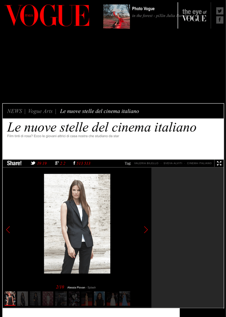 Photo Vogue in the forest - piXin Julia Buruleva NEWS | Vogue Arts | Le nuove stelle del cinema italiano Le nuove stelle del cinema italiano Film tinti di rosa? Ecco le giovani attrici di casa nostra che studiano da star 19 19 22 2/10 513 513 Alessia Piovan - Splash Tag VALERIA BILELLO - SVEVA ALVITI - CINEMA ITALIANO Sono giovani, belle, talentuose e avvolte da una allure che le fa spiccare tra la folla di aspiranti famose. Attrici molto diverse tra di loro, ma ugualmente determinate a lasciare il segno. Ve le presentiamo. Greta Scarano Nata a Roma, 29 anni, da ragazzina decide di lasciare il nido e volare negli Stati Uniti dove scopre la sua passione per la recitazione. Tornata a casa, inizia ad assaporare la polvere e il legno dei palchi teatrali, prima di essere rapita da cinema e tv, che fanno di lei un'icona del nuovo VOGUE ARTS Cinema d’ottobre Dalla sopravvivenza su Marte by Ridley Scott alle Pecore in crime italiano: Romanzo Criminale, Squadra Antimafia, Senza Erba e il The Lobster nessuna pietà. Ora con Suburra (film di Stefano Sollina Cannes. Ecco tutti i film di acquistato da Netflix che ne farà una serie) potrebbe premiato al Festival di ottobre arrivare la consacrazione, anche fuori dai confini nazionali. Silvia D'Amico Romana, 28 anni, si diploma proprio alla prestigiosa Accademia nazionale d'arte drammatica Silvio D'Amico (con cui non avrebbe legami di parentela). Anche per lei tanto teatro, sudore e passione. Finché tre anni fa Giovanni Piccioni la fa esordire sul grande schermo con Il rosso e il blu. Poi l'incontro con altri registi, ma in particolare con Claudio Caligari che la vuole in Non essere cattivo: dopo il passaggio alla Mostra del Cinema di Venezia viene candidato per l'Italia ai prossimi Oscar. Simona Tabasco VOGUE ARTS Napoletana trapiantata a Roma, 21 anni, esordisce sul Bridget Jones 3: tutto quello che sappiamo piccolo schermo subito dopo essere entrata al Centro Sperimentale di Cinematografia. A portarle fortuna la serie Fuoriclasse, che le apre poi le porte del cinema: compare Dopo 14 anni, Bridget Jones torna nel terzo capitolo del infatti in Perez, presentato lo scorso anno alla Mostra del “diario” più famoso del Cinema di Venezia e il suo mix di talento e fascino fa sapere sulla nuova pellicola subito centro. Arrivano infatti numerosi premi tra cui il Biraghi come attrice rivelazione e un Nastro D'Argento Wella per l'immagine. Ora è di nuovo in tv con È arrivata la felicità, serie diventata un cult dopo una manciata di puntate. Sveva Alviti Romana cittadina del mondo, 31 anni, Sveva inizia la sua carriera come modella, a livello internazionale. Il suo legame con il mondo della moda è così stretto che fonda con la sorella Sara, stylist che vive nella “Grande Mela”, una linea chiamata Sis New York. Ben presto arriva però il richiamo del cinema, che la porta a iniziare una carriera parallela, a piccoli passi. Arrivano i cortometraggi, le particine e finalmente un ruolo di primo piano nel film Cam Girl di Mirca Viola. Però il bello deve ancora arrivare: Sveva infatti si è trasferita a Parigi, dove si prepara a cinema. Ecco cinque cose sa tornare sul set dove vestirà i panni della mitica cantante Dalida in una produzione internazionale. Alessia Piovan Vicentina di nascita e newyorkese d'adozione, 30 anni, anche lei si divide ormai tra moda e cinema. Modella di fama internazionale (ha posato per fotografi del calibro di Bruce Weber e Annie Leibovitz), esordisce al cinema nel 2007 con La ragazza del lago di Andrea Molaioli, prima di essere scritturata da Rob Marshall per Nine. Nel 2014 è tra le protagoniste di Cam Girl di Mirca Viola. Un secondo lavoro, quello dell'attrice, che Alessia ha preso seriamente, tanto che si è messa a studiare con profitto e qualcosa ci dice che presto saprà stupirci di nuovo. Valeria Bilello Siciliana, 33 anni, un cuore che batte per Milano (città della sua adolescenza) e un destino (amoroso e non solo) che l'ha portata al di là dell'Oceano. Valeria si fa conoscere come Vj di MTV prima di scoprire il sacro fuoco per la recitazione. Ad attenderla una splendida carriera tra cinema e serie tv, che ha anche dei risvolti internazionali: è infatti l'unica italiana scelta dal regista David Frankel (lo stesso de Il diavolo veste Prada) per il film One Chance. Con l'occasione compare anche su Vogue America, fotografa da Sebastian Kim: la direttrice Anna Wintour sceglie infatti di dedicarle la celebre rubrica Steal Of The Month. Testimonial per Armani, vince anche il Premio L'Oreal alla 72a Mostra del Cinema di Venezia. Maria Roveran Veneziana, 27 anni, studia recitazione a Roma (al Centro Sperimentale di Cinematografia) e a Shanghai (al Shanghai Theatre Academy). Debutta nel 2012 come protagonista di Piccola Patria di Alessandro Rossetto, di cui cura anche la colonna sonora (essendo lei cantante a musicista). Grazie a questo film si fa conoscere in tutto il mondo: dopo la partecipazione alla 70a Mostra del Cinema di Venezia passa, infatti, a Rotterdam, Copenaghen, Monaco e new York. Impegnata tra set e palcoscenici teatrali (oltre che musicali), Maria ora è sul set del nuovo film di Giuseppe Piccioni intitolato Questi giorni, che la vede tra le protagoniste. Angelique Cavallari Italo-francese dall'anima cosmopolita, 29 anni, esordisce come modella per poi innamorarsi del teatro e del cinema. La sua carriera la porta a lavorare per maestri come Daniele Luchetti (che la dirige in Anni Felici), ma anche ad abbracciare il cinema sperimentale di autori come Stefano Odoardi (che ne fa la protagonista della sua trilogia Mancanza, che arriva anche al Festival di Rotterdam). A novembre la vedremo nelle sale con Fantasticherie di un passeggiatore solitario di Paolo Gaudio (premiato al Fantafestival di Roma, ma anche negli Stati Uniti e in Francia) e, in contemporanea, debutterà a Toulouse con la versione francese dello spettacolo teatrale Maguy - la prigione delle sconosciute di Francesco Zarzana (acclamato in Italia