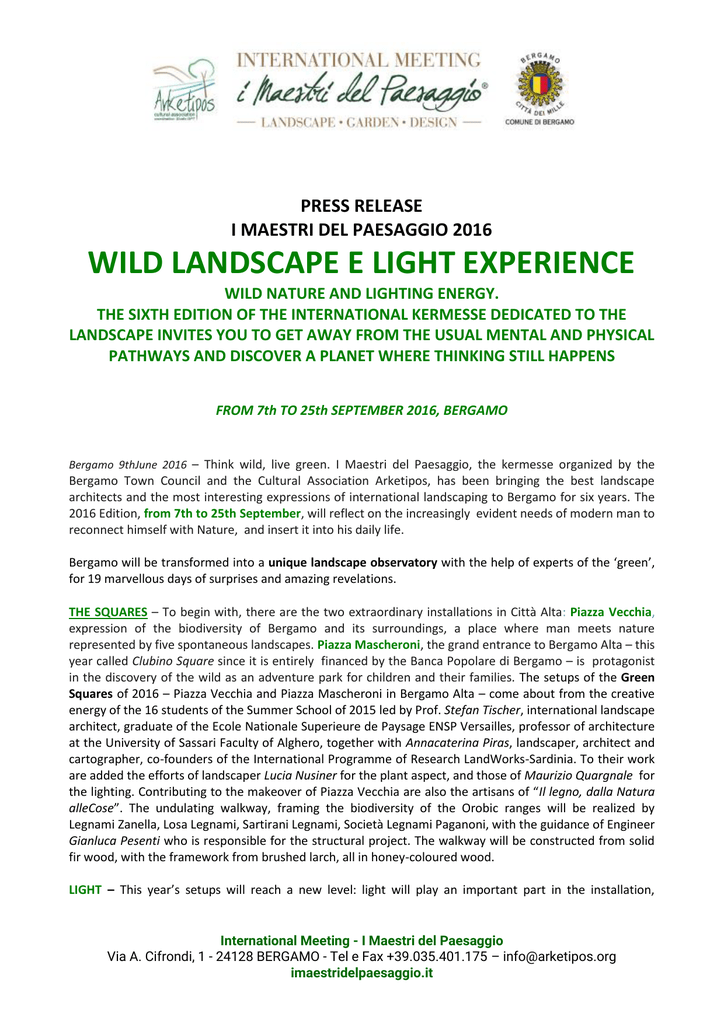PRESS RELEASE I MAESTRI DEL PAESAGGIO 2016 WILD LANDSCAPE E LIGHT EXPERIENCE WILD NATURE AND LIGHTING ENERGY. THE SIXTH EDITION OF THE INTERNATIONAL KERMESSE DEDICATED TO THE LANDSCAPE INVITES YOU TO GET AWAY FROM THE USUAL MENTAL AND PHYSICAL PATHWAYS AND DISCOVER A PLANET WHERE THINKING STILL HAPPENS FROM 7th TO 25th SEPTEMBER 2016, BERGAMO Bergamo 9thJune 2016 – Think wild, live green. I Maestri del Paesaggio, the kermesse organized by the Bergamo Town Council and the Cultural Association Arketipos, has been bringing the best landscape architects and the most interesting expressions of international landscaping to Bergamo for six years. The 2016 Edition, from 7th to 25th September, will reflect on the increasingly evident needs of modern man to reconnect himself with Nature, and insert it into his daily life. Bergamo will be transformed into a unique landscape observatory with the help of experts of the ‘green’, for 19 marvellous days of surprises and amazing revelations. THE SQUARES – To begin with, there are the two extraordinary installations in Città Alta: Piazza Vecchia, expression of the biodiversity of Bergamo and its surroundings, a place where man meets nature represented by five spontaneous landscapes. Piazza Mascheroni, the grand entrance to Bergamo Alta – this year called Clubino Square since it is entirely financed by the Banca Popolare di Bergamo – is protagonist in the discovery of the wild as an adventure park for children and their families. The setups of the Green Squares of 2016 – Piazza Vecchia and Piazza Mascheroni in Bergamo Alta – come about from the creative energy of the 16 students of the Summer School of 2015 led by Prof. Stefan Tischer, international landscape architect, graduate of the Ecole Nationale Superieure de Paysage ENSP Versailles, professor of architecture at the University of Sassari Faculty of Alghero, together with Annacaterina Piras, landscaper, architect and cartographer, co-founders of the International Programme of Research LandWorks-Sardinia. To their work are added the efforts of landscaper Lucia Nusiner for the plant aspect, and those of Maurizio Quargnale for the lighting. Contributing to the makeover of Piazza Vecchia are also the artisans of “Il legno, dalla Natura alleCose”. The undulating walkway, framing the biodiversity of the Orobic ranges will be realized by Legnami Zanella, Losa Legnami, Sartirani Legnami, Società Legnami Paganoni, with the guidance of Engineer Gianluca Pesenti who is responsible for the structural project. The walkway will be constructed from solid fir wood, with the framework from brushed larch, all in honey-coloured wood. LIGHT – This year’s setups will reach a new level: light will play an important part in the installation, International Meeting - I Maestri del Paesaggio Via A. Cifrondi, 1 - 24128 BERGAMO - Tel e Fax +39.035.401.175 – [email protected] imaestridelpaesaggio.it brought about by collaboration with experts of the sector. Bergamo’s Clay Paky, world leader in the production of automated projectors, with guidance from scenographer Sebastiano Romano, will give Bergamo a new look. The upper and lower towns of Bergamo will be united through the evocative power of light, to tell of the beauty of wild nature and enchant the spectators. Light becomes the font of emotions, glorifying the city’sarchitecture: Porta San Giacomo, Torre della Campanella, Piazza Vecchia, Torre del Gombito and Piazza Mercato delle Scarpe. BIODIVERSITY – Another outstanding inspiration for the 2016 Edition is the Orobic biodiversity, as testified by the Landscape Route, the circular itinerary that will start from and arrive at Piazza Vecchia via Parco deiColli, a true example of the coming together of the spontaneous original with the innovative, an expression of a city surrounded by greenery. After all, Bergamo is the perfect link between wild and smart, between agricultural activities and untainted landscapes, between production activities and the UNESCO heritage, between a prudent city and the adventurer’s horizon, the natural stage for I Maestri del Paesaggio. THE ARCHISTARS – The high point of the reflection on the theme of wild will be at the International Meeting of the Landscape and Garden, on the 23rd and 24th September at the Teatro Sociale, summit of the entire Event, exceptional showcase in which landscape-lovers and professionals can meet national and international speakers. A two-day intensive observatory of the best examples of landscape and garden culture with the extraordinary participation of: James and Helen Basson (FR), award-winning garden designers, Andrea Cochran (USA), the landscaper who ‘constructed’ gardens, as opposed to the wild, to help better understand the focus 2016, Lisa Delplace from Oheme Van Sweden Landscape Architecture Studios (USA) which was precursor to the wild style of conceiving green spaces, Laura Gatti (IT) who has collaborated, among other projects, with the realization of ‘Bosco Verticale’ with Stefano Boeri, Jenny B. Osuldsen from Snohetta Studios (NO) and Andy Sturgeon (UK), Best in Show at the Chelsea Flower Show 2016. The international standing that has always characterized the Event renews itself this year, with the most genial minds from the world of landscaping ready to compare and share ideas, suggestions and projects. The International Meeting has already paved the way for other seminars in the city: today Bergamo is headquarters of the International Congress of the National Council of the Order of Doctors of Agronomy and Forestry and of the World Association of Agronomists with the Portuguese lectio magistralis Prof. Joao Ferreira Nunes; the study day of the Universitéd’Eté is held here; students from all over Europe ask to participate in the Summer School, while on the Landscape Route Prof. Jan Erik Sørenstuen from Agder University in Norway, will create a land art installation with plant and auditory materials and will 