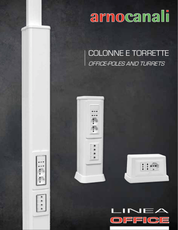 Colonne e torrette office-poles and turrets Linea OFFICE Catalogo / Catalogue 2013 OFFICE Indice - Index www.arnocanali.it TWIN Torrette e colonne bifacciali in Alluminio Aluminium bifacial turrets and office-poles Pagina - Page 4-13 TOWER Torrette e colonne monofacciali in Alluminio Aluminium Monofacial turrets and office-poles Pagina - Page 14-23 EVOMOD Moduli elettrificabili in Alluminio Aluminium electrifiable modules Pagina - Page 24-29 TORA Torrette bifacciali in Plastica Plastic bifacial turrets Pagina - Page 30-33 PAGINA 2 / 3 TWIN LINEA Colonne e torrette bifacciali Bifacial office-poles and turrets Catalogo / Catalogue 2013 OFFICE PAGINA 4 / 5 Combinazione dei colori - Colours combination Le torrette e le colonne della linea TWIN sono proposte in esecuzione standard nelle seguenti combinazioni di colori, ma possono essere variate e personalizzate in base alle specifiche ed al gusto personale del cliente. The turrets and office-poles of the line TWIN are supplied, in the standard execution, in the following colours combination, but we can personalize according the requirements and personal taste of the customer. Tutta ALLUMINIO All ALUMINIUM Tutta NERA All BLACK Tutta BIANCA All WHITE NERA e accessori ALLUMINIO BLACK and ALU accessories ALLUMINIO e accessori NERI ALUMINIUM and BLACK accessories ALLUMINIO e accessori BIANCHI ALUMINIUM and WHITE accessories Articoli extra-standard - Extra-standard items Le torrette e le colonne della linea TWIN sono proposte in esecuzione standard con accessori e dimensioni come riportato nelle pagine seguenti, ma possiamo produrre anche versioni personalizzate in base alle specifiche tecniche ed alle esigenze personali del cliente. Per comporre una torretta o una colonna extra-standard: 1) Vedere il catalogo generale 2012-13 alle pagine 71-80-81 e 88. 2) Navigare sul nostro sito web www.arnocanali.it: prodotti, sistemi di canalizzazione terziario, sezione TOWER, TWIN o EVOMOD. 3) Chiamare la arnocanali e parlare con un nostro tecnico che vi aiuterà a comporre la vostra colonna o torretta: numero verde 840 002001 oppure +39 055 8349181. The turrets and office-poles of the line TWIN are proposed in standard execution with accessories and dimensions as showed on the next pages, but we can produce also personalized versions according the technical specification and the personal requirement of the customer. To built an extra-standard turrett or office pole: 1) See the general catalogue 2012-13 on the pages 71-80-81 and to the 88. 2) Browsing our web site www.arnocanali.it: products, residential trunking system, section TOWER, TWIN or EVOMOD. Catalogo / Catalogue 2013 OFFICE Porta apparecchi disponibili - Available socket boxes Le torrette e le colonne standard della linea TWIN sono fornite con scatole portapparecchi 686 sulle quali possono essere montate le serie civili italiane di ogni marca a 3, 4 o 7 moduli. The standard turrets and office-poles of the line TWIN are supplied with socket boxes 686 for italian standard frames for 3 - 4 - 7 modules. Su richiesta, le torrette e le colonne della linea TWIN, possono essere fornite con scatole portapparecchi semi-incassate SP684, sulle quali possono essere montate le serie civili italiane di ogni marca a 4 moduli, oppure possono essere montate le mostrine autoportanti: SF540L per 4 moduli tipo Bticino Living - Light, SF502-45 per 2 moduli 45x45 standard FRANCESE. On request, the turrets and office-poles of the line TWIN, can be supplied with semi-embedded socket boxes SP684, for italian standard frames for 4 modules, or can be mounted the self-supporting frames: SF504L self-supporting frame for 4 modules type Bticino Living - Light, SF502-45 self-supporting frame for 2 modules 45x45 FRENCH standard . Su richiesta, le torrette e le colonne della linea TWIN, possono essere fornite con supporto per apparecchi mudulari 605-4, sul quale possono essere montati 2 moduli da 17,5 mm. On request, he turrets and office-poles of the line TWIN, could be supplied with support for modular switches 605-4, for 2 modular switches of 17,5 mm. PAGINA 6 / 7 INNOVAZIONE e DESIGN mini-Twin torrette BIFACCIALI bifacial turrets Dimensioni - Dimensions A B C H 12932 115 mm 80 mm 118 mm 30 cm 12954 115 mm 80 mm 118 mm 50 cm 12976 115 mm 80 mm 118 mm 70 cm C h A B Accessori inclusi - Included accessories Articolo - Item 686 Articolo - Item BS80-53 Scatola porta apparecchi 3 - 4 - 6 (7) moduli con interassi 83,5 - 108,5 - 100 mm Socket box 3 - 4 - 6 (7) modules with centres 83,5 - 108,5 - 100 mm Mostrina aperta per 3 moduli con pretranciatura per 4 e 6 (7) moduli Supporting frame open for 3 modules with precutting lines for 4 and 6 (7) modules Catalogo / Catalogue 2013 OFFICE Articolo - Item Scatola - Socket box Mostrina - Support frame Altezza - Height 12932AA 2 pezzi - pieces 686 2 pezzi - pieces BS80-53 30 cm 12932A3 2 pezzi - pieces 686 2 pezzi - pieces BS80-53 30 cm 12932VN 2 pezzi - pieces 686 2 pezzi - pieces BS80-53 30 cm 12932V3 2 pezzi - pieces 686 2 pezzi - pieces BS80-53 30 cm 12932VA 2 pezzi - pieces 686 2 pezzi - pieces BS80-53 30 cm 12932NA 2 pezzi - pieces 686 2 pezzi - pieces BS80-53 30 cm 12954AA 4 pezzi - pieces 686 4 pezzi - pieces BS80-53 50 cm 12954A3 4 pezzi - pieces 686 4 pezzi - pieces BS80-53 50 cm 12954VN 4 pezzi - pieces 686 4 pezzi - pieces BS80-53 50 cm 12954V3 4 pezzi - pieces 686 4 pezzi - pieces BS80-53 50 cm 12954VA 4 pezzi - pieces 686 4 pezzi - pieces BS80-53 50 cm 12954NA 4 pezzi - pieces 686 4 pezzi - pieces BS80-53 50 cm 12976AA 4 pezzi - pieces 686 4 pezzi - pieces BS80-53 70 cm 12976A3 4 pezzi - pieces 686 4 pezzi - pieces BS80-53 70 cm 12976VN 4 pezzi - pieces 686 4 pezzi - pieces BS80-53 70 cm 12976V3 4 pezzi - pieces 686 4 pezzi - pieces BS80-53 70 cm 12976VA 4 pezzi - pieces 686 4 pezzi - pieces BS80-53 70 cm 12976NA 4 pezzi - pieces 686 4 pezzi - pieces BS80-53 70 cm COLORI standard disponibili - Available standard COLOURS AA A3 VN V3 VA Tutta Alluminio All Aluminium Tutta Bianca All Whi