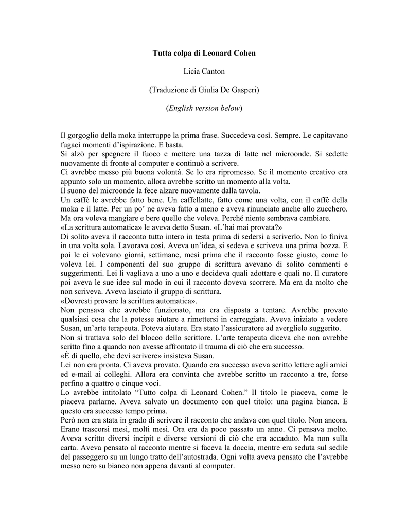 Tutta colpa di Leonard Cohen Licia Canton (Traduzione di Giulia De Gasperi) (English version below) Il gorgoglio della moka interruppe la prima frase. Succedeva così. Sempre. Le capitavano fugaci momenti d’ispirazione. E basta. Si alzò per spegnere il fuoco e mettere una tazza di latte nel microonde. Si sedette nuovamente di fronte al computer e continuò a scrivere. Ci avrebbe messo più buona volontà. Se lo era ripromesso. Se il momento creativo era appunto solo un momento, allora avrebbe scritto un momento alla volta. Il suono del microonde la fece alzare nuovamente dalla tavola. Un caffè le avrebbe fatto bene. Un caffellatte, fatto come una volta, con il caffè della moka e il latte. Per un po’ ne aveva fatto a meno e aveva rinunciato anche allo zucchero. Ma ora voleva mangiare e bere quello che voleva. Perché niente sembrava cambiare. «La scrittura automatica» le aveva detto Susan. «L’hai mai provata?» Di solito aveva il racconto tutto intero in testa prima di sedersi a scriverlo. Non lo finiva in una volta sola. Lavorava così. Aveva un’idea, si sedeva e scriveva una prima bozza. E poi le ci volevano giorni, settimane, mesi prima che il racconto fosse giusto, come lo voleva lei. I componenti del suo gruppo di scrittura avevano di solito commenti e suggerimenti. Lei li vagliava a uno a uno e decideva quali adottare e quali no. Il curatore poi aveva le sue idee sul modo in cui il racconto doveva scorrere. Ma era da molto che non scriveva. Aveva lasciato il gruppo di scrittura. «Dovresti provare la scrittura automatica». Non pensava che avrebbe funzionato, ma era disposta a tentare. Avrebbe provato qualsiasi cosa che la potesse aiutare a rimettersi in carreggiata. Aveva iniziato a vedere Susan, un’arte terapeuta. Poteva aiutare. Era stato l’assicuratore ad averglielo suggerito. Non si trattava solo del blocco dello scrittore. L’arte terapeuta diceva che non avrebbe scritto fino a quando non avesse affrontato il trauma di ciò che era successo. «È di quello, che devi scrivere» insisteva Susan. Lei non era pronta. Ci aveva provato. Quando era successo aveva scritto lettere agli amici ed e-mail ai colleghi. Allora era convinta che avrebbe scritto un racconto a tre, forse perfino a quattro o cinque voci. Lo avrebbe intitolato “Tutto colpa di Leonard Cohen.” Il titolo le piaceva, come le piaceva parlarne. Aveva salvato un documento con quel titolo: una pagina bianca. E questo era successo tempo prima. Però non era stata in grado di scrivere il racconto che andava con quel titolo. Non ancora. Erano trascorsi mesi, molti mesi. Ora era da poco passato un anno. Ci pensava molto. Aveva scritto diversi incipit e diverse versioni di ciò che era accaduto. Ma non sulla carta. Aveva pensato al racconto mentre si faceva la doccia, mentre era seduta sul sedile del passeggero su un lungo tratto dell’autostrada. Ogni volta aveva pensato che l’avrebbe messo nero su bianco non appena davanti al computer. Fuori dalla doccia, e non era successo nulla. Scesa dall’auto, e ancora niente. «Penso che tu debba lavorare su quello. Una volta che lo scriverai, la tua creatività ritornerà a scorrere e tutto sarà di nuovo come prima e non solo dal punto di vista creativo». Voleva credere all’arte terapeuta. Prima di iniziare a vedere Susan aveva cominciato a pensare di essere diventata pigra. «Penso di essere pigra». Le ci era voluto molto tempo per dar voce a questo pensiero. «Perché lo pensi?» «Non mi va di fare niente. Che lo possa essere davvero? Sono pigra?» Niente la entusiasmava. «Non sei pigra» le aveva detto Susan. Era sempre stata una persona che lavorava sodo: efficiente, diligente. Sapeva di non essere pigra. «Pensi che ci sia la possibilità che tu sia depressa?» aveva chiesto la terapeuta. L’aveva già sentita quella frase, ma non sotto forma di domanda. Suo marito l’aveva pronunciata come fosse un dato di fatto. «Il termine ‘pigra’ non rientra nel tuo vocabolario» le aveva detto quando era riuscita finalmente a dirgli quella parola. «Sei depressa, non pigra. Ecco perché non ti va di fare niente». Ma lei sapeva che cos’era la depressione. E sapeva di non esserlo. Anni prima quando aveva perso il bambino non era stata in grado di alzarsi dal letto, di mangiare, di sorridere. Quella, lo sapeva, era depressione. «Non penso di essere depressa. Mi sento contenta della maggior parte delle cose: delle persone che mi circondano, del cibo che mangio e dell’acqua che bevo. Faccio le cose che devo fare per andare avanti». Ecco che cosa aveva detto ad entrambi, alla terapeuta e a suo marito, in momenti diversi. «Sì, ma non stai facendo le cose creative e professionali che facevi prima. Che cosa ti emoziona?» le aveva chiesto il marito. Aveva esitato. Non sapeva cosa rispondere. «C’è niente che ti emoziona?» le aveva chiesto Susan sorridendo. Che cosa aspettava con impazienza? Che cosa aveva fatto di recente che l’aveva resa contenta? «È ridicolo, davvero». Era quasi imbarazzata a dirlo. «È una cosa talmente semplice che una delle mie amiche…» «Una delle tue amiche… cosa?» «Ha detto… che… se si tratta della cosa più bella della settimana allora ho davvero bisogno di farmi una vita migliore». «E cos’era la cosa più bella della tua settimana di cui parlava l’amica?» Era stata contenta di essere andata a pranzo all’Ikea. Lo poteva dire? «Mi è piaciuta quella volta che siamo andati all’Ikea e abbiamo pranzato al ristorante che c’è lì». Se la cosa più bella della settimana era andare all’Ikea e pranzare lì, allora doveva aver davvero toccato il fondo. La sua amica aveva ragione. «Non importa che cosa pensa la tua amica. Tu? Cosa pensi tu? Perché pranzare all’Ikea ti rende contenta?» Perché? Era sorprendente che fosse contenta di quello. Aveva sempre odiato andare all’Ikea a causa della marea di gente. Non importava il giorno. Quel posto era sempre pieno. E dovevano prendere l’autostrada