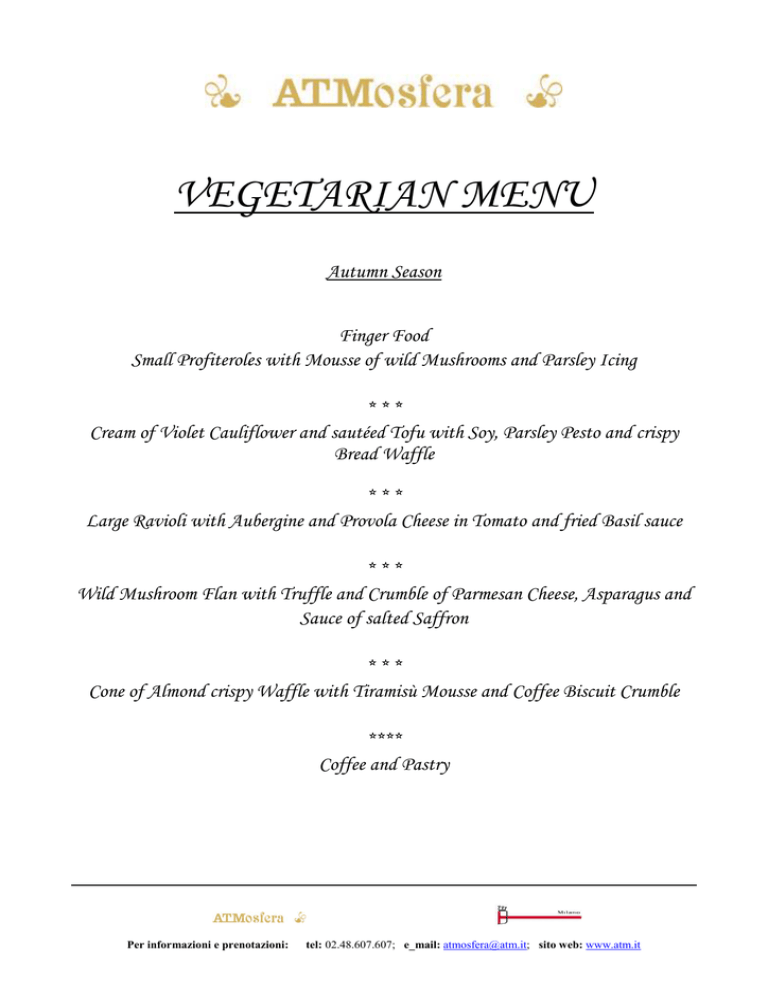 VEGETARIAN MENU Autumn Season Finger Food Small Profiteroles with Mousse of wild Mushrooms and Parsley Icing *** Cream of Violet Cauliflower and sautéed Tofu with Soy, Parsley Pesto and crispy Bread Waffle *** Large Ravioli with Aubergine and Provola Cheese in Tomato and fried Basil sauce *** Wild Mushroom Flan with Truffle and Crumble of Parmesan Cheese, Asparagus and Sauce of salted Saffron *** Cone of Almond crispy Waffle with Tiramisù Mousse and Coffee Biscuit Crumble **** Coffee and Pastry Per informazioni e prenotazioni: tel: 02.48.607.607; e_mail: [email protected]; sito web: www.atm.it