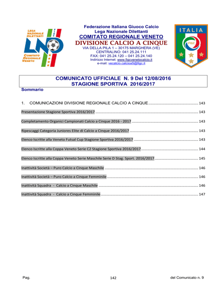 Federazione Italiana Giuoco Calcio Lega Nazionale Dilettanti COMITATO REGIONALE VENETO DIVISIONE CALCIO A CINQUE VIA DELLA PILA 1 – 30175 MARGHERA (VE) CENTRALINO: 041 25.24.111 FAX: 041 25.24.120 – 041 25.24.140 Indirizzo Internet: www.figcvenetocalcio.it e-mail: [email protected] COMUNICATO UFFICIALE N. 9 Del 12/08/2016 STAGIONE SPORTIVA 2016/2017 Sommario 1. COMUNICAZIONI DIVISIONE REGIONALE CALCIO A CINQUE ................................................ 143 Presentazione Stagione Sportiva 2016/2017 ................................................................................................... 143 Completamento Organici Campionati Calcio a Cinque 2016 - 2017 ................................................................ 143 Ripescaggi Categoria Juniores Elite di Calcio a Cinque 2016/2017 .................................................................. 143 Elenco Iscritte alla Veneto Futsal Cup Stagione Sportiva 2016/2017 .............................................................. 143 Elenco Iscritte alla Coppa Veneto Serie C2 Stagione Sportiva 2016/2017 ....................................................... 144 Elenco Iscritte alla Coppa Veneto Serie Maschile Serie D Stag. Sport. 2016/2017 .......................................... 145 Inattività Società – Puro Calcio a Cinque Maschile .......................................................................................... 146 Inattività Società – Puro Calcio a Cinque Femminile ........................................................................................ 146 Inattività Squadra - Calcio a Cinque Maschile ................................................................................................ 146 Inattività Squadra - Calcio a Cinque Femminile .............................................................................................. 147 Pag. 142 del Comunicato n. 9 1. COMUNICAZIONI DIVISIONE REGIONALE CALCIO A CINQUE Presentazione Stagione Sportiva 2016/2017 La Divisione Calcio a 5 , di concerto con il Consiglio Regionale Veneto, organizza per MARTEDI 23 AGOSTO 2016 una serata a cui sono invitate tutte le Società iscritte e partecipanti ai Campionati Maschili e Femminili. L'incontro si terrà presso la " BARCHESSA MONZA " di DUEVILLE (Vicenza) via Roma, con inizio alle ore 19,30 e servirà ad illustrare i programmi di tutta l'attività per la nuova Stagione Sportiva , per ogni serie e categoria. In tale occasione verranno resi noti i gironi e i calendari di tutte le serie Maschili e di quelli Femminili. Con nota che verrà inviata a parte sarà meglio indicato il programma della serata. Completamento Organici Campionati Calcio a Cinque 2016 - 2017 Le sottonotate Società, dopo aver provveduto al versamento dell’importo a conguaglio sono ufficialmente ammesse alla Categoria C2 di Calcio a Cinque nella Stagione Sportiva 2016/2017: U.S.FLAMINIA A.S.D. di Mestre (Ve) - A.S.D. FUTSAL GIORGIONE di Castelfranco Veneto (Tv) - A.S.D. FUTSAL GRANTORTO 2014 di Grantorto (Pd) - A.S.D. FUTSAL MARCO POLO di Marcon (Ve). La Società ASD LEONICENA CALCIO A 5 di Lonigo (Vi) dopo aver formalizzato la richiesta con una seconda comunicazione mail ha rinunciato alla precedente richiesta manifestando la volontà di continuare a svolgere attività nel Campionato Maschile di Calcio a Cinque Serie D. Ripescaggi Categoria Juniores Elite di Calcio a Cinque 2016/2017 Alla chiusura del periodo concesso per il completamento dell’organico del Campionato di Calcio a Cinque Juniores Elite la Società ASD FUTSAL MARCO POLO di Marcon (Ve) ha formalizzato regolare domanda totalizzando n. 58 punti. Come specificato nel precedente Comunicato Ufficiale essendoci un unico posto disponibile la Società ASD FUTSAL MARCO POLO potrà ufficialmente partecipare al Campionato di Calcio a Cinque Juniores Elite. Elenco Iscritte alla Veneto Futsal Cup Stagione Sportiva 2016/2017 Qui di seguito si pubblica l’elenco delle Società ufficialmente iscritte alla manifestazione in oggetto. Tale elencazione non verrà modificata oltre la data del 23 Agosto 2016: 934287 A.S.D. ACRAS MURAZZE 914380 A.S.D. ATLETICO BASSANO 932331 S.S.D. BADIESE CALCIO A 5 918996 A.S.D. CALCIO MONTEGROTTO T. 941099 CHIOGGIA CALCIO A 5 ASD 932299 A.S.D. COMPAGNIA C 5 917136 A.S.D. COSMOS NOVE 74057 A.S.D. CRESOLE 80 914547 A.S.D. EAGLES ROSA 940966 A.S.D. FUTSAL ADRIA 945549 A.S.D. FUTSAL FLAME 939914 A.S.D. FUTSAL GIORGIONE 919016 A.S.D. FUTSAL POSTIOMA 933943 A.S.D. GIFEMA DIAVOLI 914546 A.S.D. ISOLA 5 Pag. 143 del Comunicato n. 9 943488 ASD LEONICENA CALCIO A 5 938255 SSDARL MARENO GIALLOBLU 937868 A.S.D. MEDIATEC C5 943459 A.S.D. MERINGHES ROVIGO 80674 A.C. MIRANO AL POZZO C5 205525 MONIEGO CALCIO 69497 U.S.D. MONTE DI MALO 915785 A.S.D. NOVENTA CALCIO A5 780408 S.S.D. PETRARCA CALCIO A 5 SRL 943406 A.S.D. PROMOFUTSAL 940961 A.S.D. S.S.LONGOBARDA CALCIO A 5 66811 U.S.C. S.TOMIO A.S.D. 937782 A.S.D. SAN BONIFACIO CALCIO 5 941197 G.S. SAN BORTOLO A.S.D. 932156 A.S.D. SANVE MILLE 943135 A.S.D. SCHIO C5 919004 U.S.D. SOLESINOMONSELICE 1999 945172 A.S.D. SPORTING PADOVA 914040 A.C.5 TEAM VALPOLICELLA A.S.D. 81182 VERONA CALCIO A CINQUE 780742 A.S.D. VIGOREAL C5 940814 A.S.D. 1998 AUDACE C5 VERONA Elenco Iscritte alla Coppa Veneto Serie C2 Stagione Sportiva 2016/2017 Qui di seguito si pubblica l’elenco delle Società ufficialmente iscritte alla manifestazione in oggetto. Tale elencazione non verrà modificata oltre la data del 23 Agosto 2016: 940829 A.S.D. AICS PONTE C 5 780889 POL. ANNIA SERENISSIMA C 5 932331 S.S.D. BADIESE CALCIO A 5 918996 A.S.D. CALCIO MONTEGROTTO T. 941099 CHIOGGIA CALCIO A 5 ASD 917136 A.S.D. COSMOS NOVE 780391 U.S. CUORE E AVANZI 930107 A.S.D. EAGLES PEDEMONTANA 780713 FLAMINIA A.S.D. 940966 A.S.D. FUTSAL ADRIA 920811 A.S.D. FUTSAL ALL BLACKS 939914 A.S.D. FUTSAL GIORGIONE 941033 A.S.D. FUTSAL GRANTORTO 920811 A.S.D. FUTSAL MARCO POLO 77510 A.C. HELLAS VERONA 1903 914546 A.S.D. ISOLA 5 930226 A.S.D. MARTELLAGO CALCIO A 5 937868 A.S.D