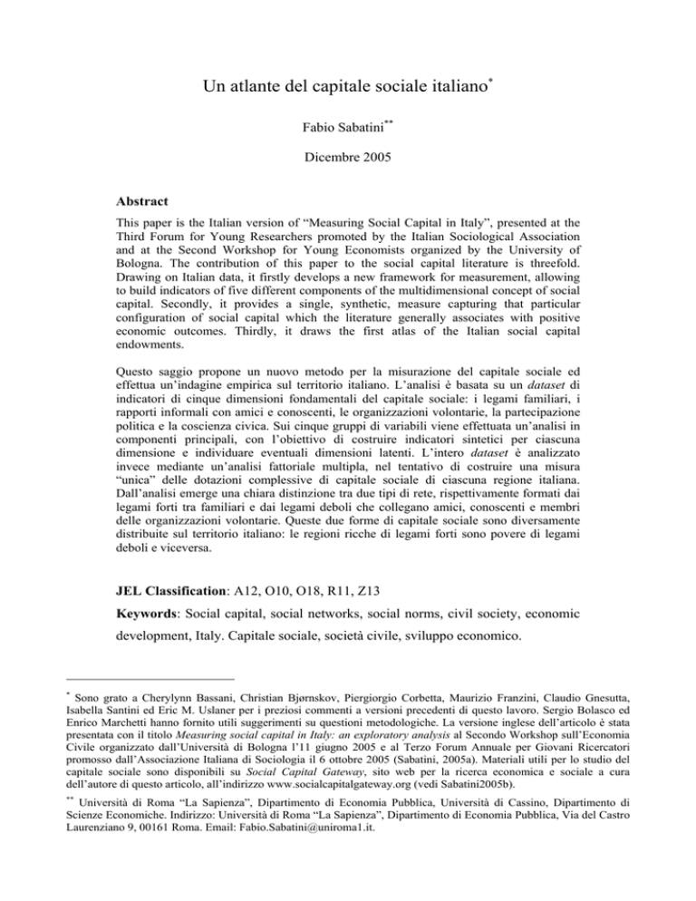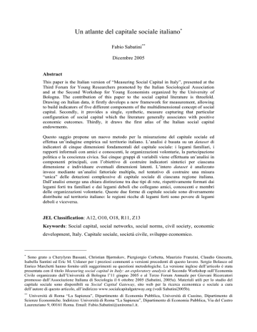 Un atlante del capitale sociale italiano* Fabio Sabatini** Dicembre 2005 Abstract This paper is the Italian version of “Measuring Social Capital in Italy”, presented at the Third Forum for Young Researchers promoted by the Italian Sociological Association and at the Second Workshop for Young Economists organized by the University of Bologna. The contribution of this paper to the social capital literature is threefold. Drawing on Italian data, it firstly develops a new framework for measurement, allowing to build indicators of five different components of the multidimensional concept of social capital. Secondly, it provides a single, synthetic, measure capturing that particular configuration of social capital which the literature generally associates with positive economic outcomes. Thirdly, it draws the first atlas of the Italian social capital endowments. Questo saggio propone un nuovo metodo per la misurazione del capitale sociale ed effettua un’indagine empirica sul territorio italiano. L’analisi è basata su un dataset di indicatori di cinque dimensioni fondamentali del capitale sociale: i legami familiari, i rapporti informali con amici e conoscenti, le organizzazioni volontarie, la partecipazione politica e la coscienza civica. Sui cinque gruppi di variabili viene effettuata un’analisi in componenti principali, con l’obiettivo di costruire indicatori sintetici per ciascuna dimensione e individuare eventuali dimensioni latenti. L’intero dataset è analizzato invece mediante un’analisi fattoriale multipla, nel tentativo di costruire una misura “unica” delle dotazioni complessive di capitale sociale di ciascuna regione italiana. Dall’analisi emerge una chiara distinzione tra due tipi di rete, rispettivamente formati dai legami forti tra familiari e dai legami deboli che collegano amici, conoscenti e membri delle organizzazioni volontarie. Queste due forme di capitale sociale sono diversamente distribuite sul territorio italiano: le regioni ricche di legami forti sono povere di legami deboli e viceversa. JEL Classification: A12, O10, O18, R11, Z13 Keywords: Social capital, social networks, social norms, civil society, economic development, Italy. Capitale sociale, società civile, sviluppo economico. * Sono grato a Cherylynn Bassani, Christian Bjørnskov, Piergiorgio Corbetta, Maurizio Franzini, Claudio Gnesutta, Isabella Santini ed Eric M. Uslaner per i preziosi commenti a versioni precedenti di questo lavoro. Sergio Bolasco ed Enrico Marchetti hanno fornito utili suggerimenti su questioni metodologiche. La versione inglese dell’articolo è stata presentata con il titolo Measuring social capital in Italy: an exploratory analysis al Secondo Workshop sull’Economia Civile organizzato dall’Università di Bologna l’11 giugno 2005 e al Terzo Forum Annuale per Giovani Ricercatori promosso dall’Associazione Italiana di Sociologia il 6 ottobre 2005 (Sabatini, 2005a). Materiali utili per lo studio del capitale sociale sono disponibili su Social Capital Gateway, sito web per la ricerca economica e sociale a cura dell’autore di questo articolo, all’indirizzo www.socialcapitalgateway.org (vedi Sabatini2005b). ** Università di Roma “La Sapienza”, Dipartimento di Economia Pubblica, Università di Cassino, Dipartimento di Scienze Economiche. Indirizzo: Università di Roma “La Sapienza”, Dipartimento di Economia Pubblica, Via del Castro Laurenziano 9, 00161 Roma. Email: [email protected]. 1. Introduzione Il concetto di capitale sociale è molto popolare nel dibattito economico contemporaneo. Tuttavia la sua definizione è ancora vaga e controversa, e nella letteratura non esiste un metodo di misurazione comunemente accettato. Gli studi empirici soffrono per la cronica mancanza di dati, e non hanno ancora dimostrato in modo convincente l’esistenza di una relazione positiva tra capitale sociale e sviluppo economico. Questo articolo propone un nuovo metodo per la misurazione e disegna il primo atlante del capitale sociale in Italia. L’analisi si concentra sugli aspetti “strutturali” del fenomeno, identificati con le reti di relazioni interpersonali, e si basa su un dataset formato da circa duecento indicatori di cinque dimensioni fondamentali del capitale sociale: i legami familiari, i rapporti informali con amici e conoscenti, le organizzazioni volontarie, la partecipazione politica attiva e la coscienza civica. I dati sono tratti dalle indagini multiscopo condotte dall’Istat su un campione di circa ventimila famiglie tra il 1998 e il 2002. Sui cinque gruppi di variabili viene eseguita un’analisi in componenti principali, con l’obiettivo di costruire indicatori sintetici per ciascuna dimensione e di individuare eventuali dimensioni latenti. L’intero dataset è analizzato invece mediante un’analisi fattoriale multipla, nel tentativo di costruire una misura “unica” delle dotazioni complessive di capitale sociale di ciascuna regione italiana. Dall’analisi emerge una chiara distinzione tra due tipi di rete, rispettivamente formati dai legami forti tra familiari e dai legami deboli che collegano amici, conoscenti e membri delle organizzazioni volontarie. Queste due forme di capitale sociale sono diversamente distribuite sul territorio italiano: le regioni ricche di legami forti sono povere di legami deboli e viceversa. La differenza è molto rilevante in termini di analisi dei processi di sviluppo. Anche se i legami familiari svolgono un ruolo fondamentale nel miglioramento del benessere delle persone, i legami deboli favoriscono la trasmissione della conoscenza e la diffusione delle informazioni, e sono considerati dalla letteratura sociologica una delle determinanti fondamentali dello sviluppo economico. Il contributo di questo saggio alla ricerca sul capitale sociale consiste nell’identificazione di una definizione operativa del fenomeno e nella proposta di un nuovo metodo di misurazione che permette di ottenere indicatori sintetici pe