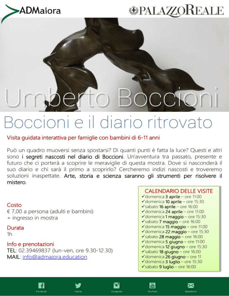 Umberto Boccioni Boccioni e il diario ritrovato Visita guidata interattiva per famiglie con bambini di 6-11 anni Può un quadro muoversi senza spostarsi? Di quanti punti è fatta la luce? Questi e altri sono i segreti nascosti nel diario di Boccioni. Un'avventura tra passato, presente e futuro che ci porterà a scoprire le meraviglie di questa mostra. Dove si nasconderà il suo diario e chi sarà il primo a scoprirlo? Cercheremo indizi nascosti e troveremo soluzioni inaspettate. Arte, storia e scienza saranno gli strumenti per risolvere il mistero. CALENDARIO DELLE VISITE Costo € 7,00 a persona (adulti e bambini) + ingresso in mostra Durata 1h Info e prenotazioni TEL: 02.39469837 (lun-ven, ore 9.30-12.30) MAIL: [email protected] domenica 3 aprile – ore 11:00 domenica 10 aprile – ore 15:30 sabato 16 aprile – ore 16:00 domenica 24 aprile – ore 11:00 domenica 1 maggio – ore 15:30 sabato 7 maggio – ore 16:00 domenica 15 maggio – ore 11:00 domenica 22 maggio – ore 15:30 sabato 28 maggio – ore 16:00 domenica 5 giugno – ore 11:00 domenica 12 giugno – ore 15:30 sabato 18 giugno – ore 16:00 domenica 26 giugno – ore 11 domenica 3 luglio – ore 15:30 sabato 9 luglio – ore 16:00