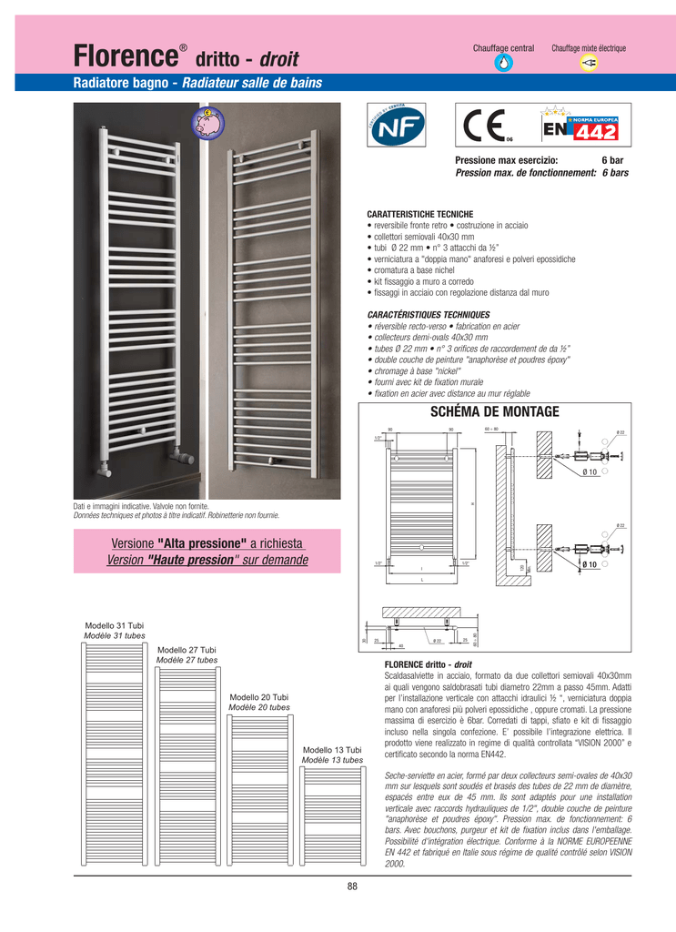 ® Florence Chauffage central dritto - droit Chauffage mixte électrique Radiatore bagno - Radiateur salle de bains Pressione max esercizio: 6 bar Pression max. de fonctionnement: 6 bars CARATTERISTICHE TECNICHE • reversibile fronte retro • costruzione in acciaio • collettori semiovali 40x30 mm • tubi Ø 22 mm • n° 3 attacchi da ½” • verniciatura a "doppia mano" anaforesi e polveri epossidiche • cromatura a base nichel • kit fissaggio a muro a corredo • fissaggi in acciaio con regolazione distanza dal muro CARACTÉRISTIQUES TECHNIQUES • réversible recto-verso • fabrication en acier • collecteurs demi-ovals 40x30 mm • tubes Ø 22 mm • n° 3 orifices de raccordement de da ½” • double couche de peinture "anaphorèse et poudres époxy" • chromage à base "nickel" • fourni avec kit de fixation murale • fixation en acier avec distance au mur réglable SCHÉMA DE MONTAGE 90 60 ÷ 80 90 Ø 22 1/2" H Ø 10 Dati e immagini indicative. Valvole non fornite. Données techniques et photos à titre indicatif. Robinetterie non fournie. 1/2" 1/2" 120 Versione "Alta pressione" a richiesta Version "Haute pression" sur demande I Min. Ø 22 Ø 10 30 Modello 31 Tubi Modèle 31 tubes 25 Ø 22 40 Modello 27 Tubi Modèle 27 tubes Modello 20 Tubi Modèle 20 tubes Modello 13 Tubi Modèle 13 tubes 25 60 ÷ 80 L FLORENCE dritto - droit Scaldasalviette in acciaio, formato da due collettori semiovali 40x30mm ai quali vengono saldobrasati tubi diametro 22mm a passo 45mm. Adatti per l’installazione verticale con attacchi idraulici ½ “, verniciatura doppia mano con anaforesi più polveri epossidiche , oppure cromati. La pressione massima di esercizio è 6bar. Corredati di tappi, sfiato e kit di fissaggio incluso nella singola confezione. E’ possibile l’integrazione elettrica. Il prodotto viene realizzato in regime di qualità controllata “VISION 2000” e certificato secondo la norma EN442. Seche-serviette en acier, formé par deux collecteurs semi-ovales de 40x30 mm sur lesquels sont soudés et brasés des tubes de 22 mm de diamètre, espacés entre eux de 45 mm. Ils sont adaptés pour une installation verticale avec raccords hydrauliques de 1/2", double couche de peinture "anaphorèse et poudres époxy". Pression max. de fonctionnement: 6 bars. Avec bouchons, purgeur et kit de fixation inclus dans l'emballage. Possibilité d'intégration électrique. Conforme à la NORME EUROPEENNE EN 442 et fabriqué en Italie sous régime de qualité contrôlé selon VISION 2000. 88 Resa termica in Watt - Puissance thermique en Watt ΔT 50K - ΔT 30K EN 442 (75/65 °C Ta 20 °C - 55/45 °C Ta 20 °C) Colore di serie: BIANCO RAL 9016 - Couleur standard: BLANC TONON (RAL 9016) Codice Modello Altezza Larghezza Profondità Interasse H L P I Peso Contenuto Potenza Potenza Potenza Esponente Kg acqua (watt Δt 50°C) (watt Δt 40°C) (watt Δt 30°C) n Code Modèle Hauteur mm Entraxe mm Poids kg RF1341000N 1345 795 410 30 360 4 2,8 298 228 153 1,19480 RF1345000N 1345 795 450 30 400 5 3,0 311 238 169 1,19480 RF1350000N 1350 795 500 30 450 5 3,3 338 259 184 1,19480 RF1360000N 1360 795 600 30 550 6 3,9 391 299 211 1,20460 RF2045000N 2045 1200 450 30 400 8 4,5 474 360 252 1,23530 RF2050000N 2050 • 1200 500 30 450 8 4,8 514 390 274 1,23330 RF2060000N 2060 1200 600 30 550 10 5,6 593 451 316 1,22930 RF2745000N 2745 1605 450 30 400 10 5,4 645 489 343 1,23760 RF2750000N 2750 • 1605 500 30 450 11 5,9 698 530 371 1,23760 RF2760000N 2760 1605 600 30 550 12 7,2 805 611 428 1,23450 RF3145000N 3145 1785 450 30 400 11 6,8 724 549 384 1,23950 RF3150000N 3150 1785 500 30 450 13 7,3 783 594 416 1,23950 RF3160000N 3160 • 1785 600 30 550 15 8,3 904 686 481 1,23680 • Largeur Profondeur mm mm Capacité Puissance Puissance Puissance Exposant d'eau (watt Δt 50°C) (watt Δt 40°C) (watt Δt 30°C) n Prezzo € Prix € • Disponibile a magazzino - Disponible en stock Versione Cromata - Chromed version Codice Modello Altezza Larghezza Profondità Interasse H L P I Peso Contenuto Potenza Potenza Potenza Esponente Kg acqua (watt Δt 50°C) (watt Δt 40°C) (watt Δt 30°C) n Code Modèle Hauteur mm Entraxe mm Poids kg RF1350NCN 1350 RF1360NCN • Largeur Profondeur mm mm Capacité Puissance Puissance Puissance Exposant d'eau (watt Δt 50°C) (watt Δt 40°C) (watt Δt 30°C) n 795 500 30 450 5 3,3 226 173 123 1,19480 1360 795 600 30 550 6 3,9 264 202 143 1,20460 RF2045NCN 2045 1200 450 30 400 8 4,5 318 241 169 1,23530 RF2050NCN 2050 • 1200 500 30 450 8 4,8 335 254 178 1,23330 RF2060NCN 2060 1200 600 30 550 10 5,6 392 298 209 1,22930 RF2745NCN 2745 1605 450 30 400 10 5,4 432 328 230 1,23760 RF2750NCN 2750 • 1605 500 30 450 11 5,9 452 343 240 1,23760 RF2760NCN 2760 1605 600 30 550 12 7,2 533 405 284 1,23450 RF3150NCN 3150 1785 500 30 450 13 7,3 506 384 269 1,23950 RF3160NCN 3160 • 1785 600 30 550 15 8,3 601 456 320 1,23680 Prezzo € Prix € • Disponibile a magazzino - Disponible en stock ACCESSORI - ACCESSOIRES • 137123770 137126270 Portasalviette BIANCO (L. da 300 a 600) pag. 90 Porte-serviettes BLANC (Long. de 300 à 600) page 90 • 137123774 137126274 Portasalviette CROMATO (L. da 300 a 600) pag. 90 Porte-serviettes CHROME (Long. de 300 à 600) page 90 NOTE / NOTES: VARIANTI COLORI / COULEURS DISPONIBLES: Kit di fissaggio incluso - Fourni avec kit de fixation Per funzionamento misto, vedere a pag. 91 - Pour fonctionnement mixte, voir page 91 Versione colorato RAL - Version en couleurs RAL Versione Colori speciali - Version couleurs spéciales 89