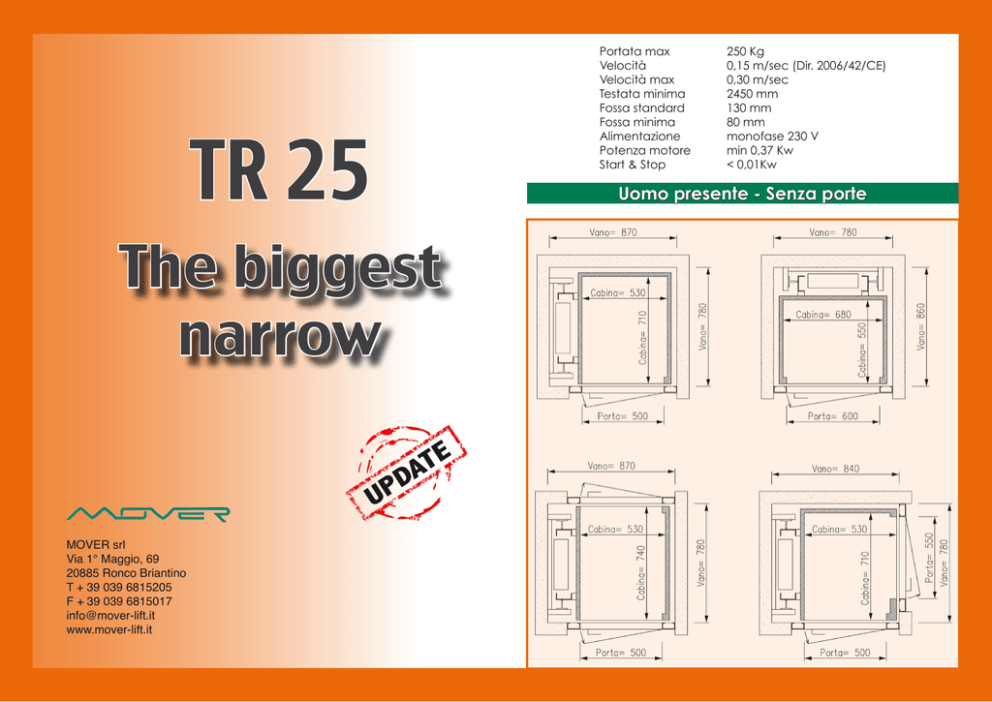 Portata max Velocità Velocità max Testata minima Fossa standard Fossa minima Alimentazione Potenza motore Start & Stop TR 25 Uomo presente - Senza porte The biggest narrow TE A PD U MOVER srl Via 1° Maggio, 69 20885 Ronco Briantino T + 39 039 6815205 F + 39 039 6815017 [email protected] www.mover-lift.it 250 Kg 0,15 m/sec (Dir. 2006/42/CE) 0,30 m/sec 2450 mm 130 mm 80 mm monofase 230 V min 0,37 Kw < 0,01Kw Portata max Velocità Velocità max Testata minima Fossa standard Fossa minima Alimentazione Potenza motore Start & Stop 250 Kg 0,15 m/sec (Dir. 2006/42/CE) 0,30 m/sec 2450 mm 130 mm 80 mm monofase 230 V min 0,37 Kw < 0,01Kw Automatica - Porte a soffietto Portata max Velocità Velocità max Testata minima Fossa standard Fossa minima Alimentazione Potenza motore Start & Stop 250 Kg 0,15 m/sec (Dir. 2006/42/CE) 0,30 m/sec 2450 mm 130 mm 80 mm monofase 230 V min 0,37 Kw < 0,01Kw Automatica - Porte scorrevoli