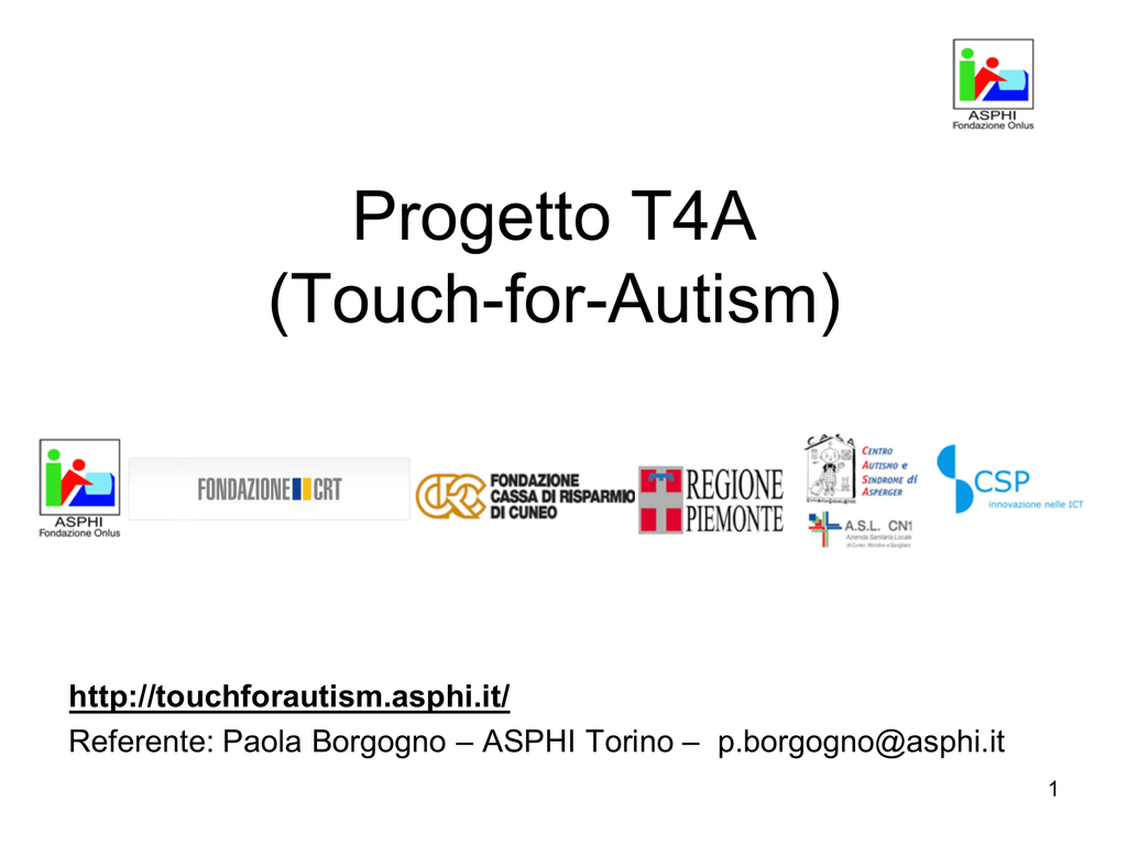 Progetto T4A (Touch-for-Autism) http://touchforautism.asphi.it/ Referente: Paola Borgogno – ASPHI Torino – [email protected] 1 Premesse • • • L’Autismo e gli altri Disturbi Pervasivi dello Sviluppo (DPS) rappresentano patologie complesse, la cui evoluzione dipende anche in maniera rilevante dal tipo di interventi abilitativi attivati nell’infanzia e dalla messa in atto di specifiche metodologie In Piemonte, nella fascia di età tra i 6 e i 10 anni, la prevalenza accertata è di circa 4 soggetti autistici su mille; le stime rilevate dalle varie Associazioni per l’autismo evidenziano in Italia la presenza di circa 360.000 famiglie coinvolte in questa problematica Sperimentazioni consolidate da clinici ed educatori hanno da anni verificato che l’ICT puo’ contribuire significativamente alla presa in carico del soggetto con autismo e DPS, ma attualmente non esiste uno strumento tecnologico che consenta di gestire insieme tutte le necessarie funzioni; supportare l’apprendimento, la comunicazione, le abilità personali e sociali, gestire programmi educativi ed abilitativi. 2 Obiettivi del progettoT4A • • Il progetto T4A si prefigge di progettare e realizzare supporti tecnologici a più livelli, in grado di gestire le diverse funzioni gia citate, prevedendo lo sviluppo e l’utilizzo di specifiche componenti HW e SW I supporti tecnologici dovranno tenere conto delle Linee Guida internazionali sull’Autismo: – gli interventi attivati a favore del bambino con autismo debbono essere condivisi con i suoi contesti di vita, in particolare la famiglia e la scuola (i supporti tecnologici debbono essere “portabili” da un contesto all’altro) – deve essere individuato un unico luogo di riferimento, in grado di coordinare il progetto di intervento attivato nei diversi contesti – la condivisione del progetto tra diversi contesti deve essere garantita dalla presenza di uno strumento “portatile” in grado di interagire con quello “madre”, per la messa in atto di attività didattiche ed educative mirate per la comunicazione, per il supporto alle abilità personali e sociali, per la gestione delle situazioni di emergenza (invio automatico di mail o telefonate in caso di emergenza, navigatore satellitare per consentire l’individuazione della persona, ecc) 3 Partner e ruoli ASPHI • Ideazione, coordinamento e rendicontazione • organizzazione eventi alla Giornata Mondile dell’Autismo (prossimo appuntamento il 2/4/2012) • messa a punto della fase conclusiva di comunicazione e diffusione del prodotto finale anche attraverso Handimatica C.A.S.A. (Centro per l’Autismo e Sindrome di Asperger – Mondovì) - Partner scientifico. • identificare le specifiche funzionali • identificare gli utenti sperimentatori • garantire la consulenza e la supervisione clinica e psicoeducativa di tutti i progetti individualizzati per ciascun paziente coinvolto nella sperimentazione • effettuare periodiche valutazioni funzionali degli stessi soggetti finalizzati all’individuazione degli obiettivi dell’intervento • fornire la consulenza necessaria per la messa a punto delle attività didattiche ed educative che dovranno poi essere tradotte in sistemi Hw e Sw • ospitare gli strumenti “madre” e “banco studio”, sperimentandone gli utilizzi e registrando, secondo un protocollo condiviso, identificando punti forti e criticità della sperimentazione • curare i rapporti con le famiglie dei soggetti utilizzatori e per la sperimentazione dello strumento “portatile” • garantire il coordinamento dell’attività tra CASA, abitazione e scuola degli utenti sperimentatori • individuare nella zona Mondovì/Cuneo due scuole pilota da coinvolgere nella fase di sperimentazione del progetto CSP - Innovazione nelle ICT - Partner tecnologico • Analisi delle tecnologie abilitanti in base ai requisiti funzionali • Progettazione della superficie interattiva e dell'architettura software • Sviluppo del prototipo • Partecipazione alla fase di test e validazione • Rilascio del prototipo (includendo le componenti hardware e software) con la relativa documentazione 4 Patrocini e Sponsor • • • • Regione Piemonte-Innovazione e Ricerca; Politiche Sociali, Sanità, Istruzione: Patrocinio con formale “dichiarazione di interesse” e copertura dei costi del personale interno CSP e CASA Comuni di Mondovì e Cuneo: Patrocinio e collaborazione con Regione Piemonte alla individuazione e coinvolgimento di due scuole pilota nel territorio. Fondazione Cassa di Risparmio di Torino (FCRT) Sponsor e finanziatore dei costi esterni e delle apparecchiature (HW e SW) gestite da CSP Fondazione Cassa di Risparmio di Cuneo (FCRC): Sponsor e finanziatore dei costi delle apparecchiature (HW) date in dotazione a CASA e dei costi esterni di stretta pertinenza 5 ARCHITETTURA del progetto Apparecchiature HW previste nel progetto T4A: – Livello base (“madre”) : 2, uno presso CASA ed uno per lo sviluppo presso CSP – Livello intermedio (“banco studio”): 4, uno in ognuna delle due scuole individuate oltre ad uno presso CASA ed uno presso CSP; l’acquisizione di questa componenete e’ rimandata alla fase-2 del progetto – Livello “portatile” (tablet), da affidare al soggetto autistico in maniera che gli interventi attivati a suo favore vengano condivisi con i suoi contesti di vita quotidiana, in particolare con la famiglia e le strutture scolastiche; previsto 1 per ogni soggetto autistico che sarà coinvolto nella fase sperimentale del progetto 6 Risultati attesi • Per CASA: Sperimentazione di una prassi operativa che consenta la messa in atto di interventi evidence based, rivolti a soggetti con Disturbi dello Spettro Autistico, supportati dall’uso delle nuove tecnologie • Per ASPHI: promozione del prototipo conclusivo attraverso un piano di annuncio (postazione HANDImatica 2012, partecipazione alla Giornata Mondiale dell’Autismo) e avvio di un piano di diffusione reg