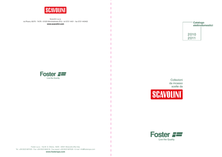 Scavolini s.p.a. via Risara, 60/70 - 74/78 - 61025 Montelabbate (PU) - tel 0721 4431 - fax 0721 443402 Catalogo elettrodomestici www.scavolini.com 2010 2011 Collezioni da incasso scelte da Foster s.p.a. - Via M. S. Ottone, 18/20 - 42041 Brescello (Re) Italy Tel. +39 0522 687425 - Fax +39 0522 684518 - Fax export +39 0522 687639 - E-mail: [email protected] www.fosterspa.com Foster è azienda certificata ISO 9001:2008 Foster management system is ISO 9001:2008 certified Registration number CH-36474 Garanzie Tutti i prodotti Foster sono conformi alle direttive CEE e sono coperti da garanzia Foster per 24 mesi. Distributori I nostri distributori sono altamente selezionati per dare un servizio professionale sulla nostra gamma di produzione. Consultate il sito internet www.fosterspa.com per conoscere l’elenco sempre aggiornato oppure contattateci direttamente al numero +39 0522 687425. Assistenza Desideriamo darvi un prodotto ed un servizio all’altezza della vostra scelta, per questo Foster è dotata di una capillare rete di Centri di Assistenza Tecnica, in Italia e all’estero. Servizio Post-vendita Italia Per conoscere l’elenco sempre aggiornato dei centri di assistenza tecnica Foster consultate il sito internet www.fosterspa.com, oppure contattate il servizio Customer Care al +39 0522 684450 - (Ufficio Ricambi +39 0522 684300). Europe After Sales Services AT – AUSTRIA Ph. +43 (1) 61016 GB – GRAN BRETAGNA Ph. +44 (0) 0845 0529010 SLO – SLOVENIA Ph. +386 (0) 15114716 BE – BELGIO Ph. +32 (0) 473 /585763 GR – GRECIA Ph. +302 104833477 SK – SLOVACCHIA Ph. +421 37 642 5974-5 BY – BIELORUSSIA Ph. +7 (495) 7450093 IE – IRLANDA (+NORD IRL) Ph. +44 (0) 2890826233 E – SPAGNA Ph. +34 902 154 058 HR – CROAZIA Ph. +385 1 4823672 LI – LIECTHEINSTEIN Ph. +41 916496050 S – SVEZIA Ph. +45 (0) 97217171 DK – DANIMARCA Ph. +45 (0) 97217171 L – LUSSEMBURGO Ph. +32 (0) 473 585763 CH – SVIZZERA Ph. +41 91 649 6050 FIN – FINLANDIA Ph. +358 (2) 272 1200 N – NORVEGIA Ph. +45 (0) 97217171 HU – UNGHERIA Ph. +36 14277383 FR – FRANCIA Ph. +33 (0) 327 31 88 64 NL – OLANDA Ph. +31 16 24 72 626 DE – GERMANIA Ph. +49 (0) 1805 251266 +49 (0) 2104 96400 RU – RUSSIA Ph. +7 (495) 745 0093 After Sales Services around the World CDN – CANADA Ph. +1 888 639 6001 RP – FILIPPINE Ph. +632 636 6950 IL – ISRAELE Ph. +972 524 281445 HK – HONG KONG Ph. +852 2572 9333 US – STATI UNITI Ph. +1 888 639 6001 SGP – SINGAPORE Ph. +65 62861819 THA – THAILANDIA Ph. +662 7915400 For information about Customer Care Service in other countries please call: +39 0522 687425 or visit www.fosterspa.com I prezzi del presente listino sono da considerarsi al netto di IVA e di eventuale Eco-contributo RAEE. Foster declina ogni responsabilità per eventuali inesattezze ed errori e si riserva il diritto di apportare modifiche e migliorie ai prodotti illustrati in qualsiasi momento senza preavviso. Ogni articolo del presente catalogo è prodotto in conformità alle normative vigenti e alle direttive CE. Foster è stata la prima azienda ad introdurre bruciatori ad alta efficienza energetica ed il 100% degli elettrodomestici Foster è di Classe A, perché crediamo nel rispetto dell’ambiente e del nostro futuro. L’organizzazione Foster sarà lieta di fornire ulteriori dettagli ed aggiornamenti sui nostri prodotti e servizi. Le illustrazioni comprendono ambienti d’arredo realizzati dai nostri clienti, che ringraziamo vivamente. Eleganza, prestazioni, affidabilità e rispetto per l’ambiente. Sono questi i quattro asset su cui potrete te contare acquistando un elettrodomestico o Foster. La forma e la sostanza trovano l’unicità in una collezione di elementi studiati per essere in armonia con il vostro stile. Per ogni lavello potrete trovare una soluzione cottura perfettamente abbinata nel design, nel materiale – sempre acciaio inox AISI 304 (18/10) – e nelle finiture. Ogni dettaglio, dalla cappa al forno, mette in luce la lunga esperienza di chi è abituato a progettare insieme ai più blasonati produttori europei di cucine. Infine la “Ricerca”, la capacità di tracciare ogni giorno delle strade nuove per migliorare la funzionalità dei propri prodotti e per elevare la qualità della vita in cucina. “LIVE THE QUALITY” è l’origine della nostra ispirazione. Indice degli argomenti Introduzione pag. 04 Lavelli pag. 08 Piani cottura a gas pag. 21 Piani cottura induzione pag. 35 Forni pag. 39 Le Collezioni Foster Chi ama la perfezione vuole raggiungerla in ogni dettaglio per creare un ambiente armonico. Mai come oggi, Foster offre la più ampia gamma di lavelli coordinati ai piani di cottura, cappe di aspirazione, forni e lavastoviglie. Innumerevoli possibilità per rendere la vostra cucina unica ed inconfondibile. Questa è la filosofia delle Collezioni Foster: un unico partner che insieme a voi è attento alla coerenza del progetto globale. Qui di seguito alcune collezioni per orientarsi nella scelta degli elettrodomestici coordinati, dallo stile minimal al design squadrato o curvilineo. Serie 4000 La Serie 4000 di Foster esprime un design rivolto all’essenzialità funzionale. Linee tese e pulite, tecnologia innovativa ed estrema attenzione al dettaglio sono lo stile di una gamma prodotti completa che arreda con stile minimal il proprio ambiente cucina. Serie Quadra LO STILE PRIMA DI TUTTO La Serie Quadra vi permette di comporre la cucina come volete. Grazie al nuovo abbinamento con i modelli Domino potete scegliere la posizione di ciascun fuoco e del lavello per realizzare un’unica area di lavoro. 4 Le Collezioni Foster Serie KE + KS ELEGANZA E PRATICITÀ Chi sceglie Foster sceglie qualità, design e tecnologia innovativa. Valori che non permettono compromessi e che sono espressi al meglio dalle nuove serie KE e KS. Lo scopo di tutti i componenti, sia tecnologici che estetici, è sempre lo stesso: creare un ambiente di lavoro elegante e funzionale. Big Bowl Veronika filotop FORME 