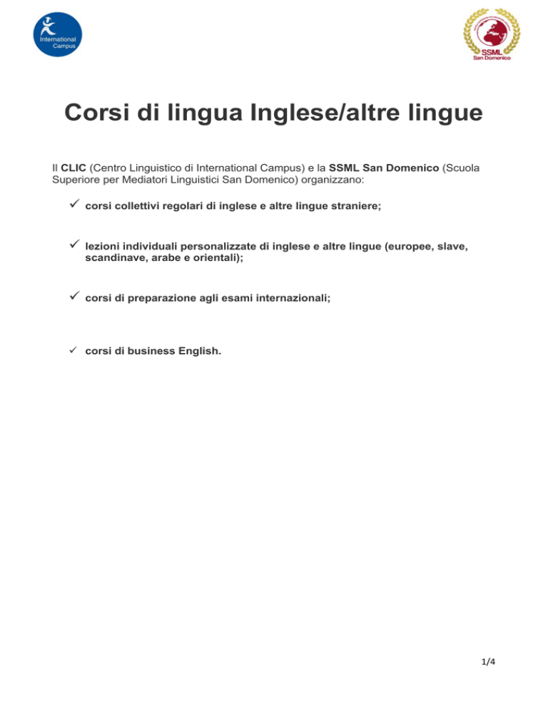 Corsi di lingua Inglese/altre lingue Il CLIC (Centro Linguistico di International Campus) e la SSML San Domenico (Scuola Superiore per Mediatori Linguistici San Domenico) organizzano: corsi collettivi regolari di inglese e altre lingue straniere; lezioni individuali personalizzate di inglese e altre lingue (europee, slave, scandinave, arabe e orientali); corsi di preparazione agli esami internazionali; corsi di business English. 1/4 Corsi in gruppo Inglese/Altre lingue Iscriviti ai corsi di Inglese collettivi La frequenza prevista per i corsi di inglese regolari è: di 2 lezioni settimanali, di 1 ora e 30 minuti ciascuna, per i corsi collettivi di lingua inglese per una durata di 4 e 8 mesi dal lunedì al venerdì e di 1 lezione alla settimana di 3 ore per i corsi di lingua della durata di 4 mesi che si svolgono solo il sabato. Possibilità di pagamento rateale. Quota di Iscrizione: € 50,00 - Materiale didattico di base € 40,00 Corsi Regolari TIPOLOGIA CORSO FREQUENZA DURATA PREZZO Corsi di 4 mesi 2 lezioni settimanali di 1 ora e 30 minuti cad. 50 ore in 4 mesi € 450,00 Corsi del sabato 1 lezione di 3 ore solo il sabato 50 ore in 4 mesi € 450,00 LIVELLI DI COMPETENZA LINGUISTICA IN BASE AL COMMON EUROPEAN FRAMEWORK DEL CONSIGLIO D'EUROPA: LIVELLO ELEMENTARE LIVELLO INTERMEDIO A1 Contatto A2 Sopravvivenza B1 Soglia B2 Progresso LIVELLO AVANZATO C1 Efficacia C2 Padronanza 2/4 Lezioni Individuali Inglese/Altre lingue Segui le lezioni di inglese individuali personalizzate organizzate dal CLIC Le lezioni di lingua personalizzate possono essere di tre tipologie: individuali, individuali specialistiche e semi-individuali (per 2 studenti). Il pacchetto minimo prenotabile è di 10 ore di lezione e la durata minima di una lezione è di almeno 1 ora. La frequenza delle lezioni può essere concordata liberamente dallo studente con la scuola. LEZIONI PERSONALIZZATE LINGUE EUROPEE FREQUENZA DURATA PREZZO/ORA Lezioni individuali Lezioni individuali specialistiche Lezioni semi-individuali 2 studenti da concordare da concordare minimo 1 ora a lezione minimo 1 ora a lezione da concordare minimo 1 ora a lezione € 25,00 € 30,00 € 20,00 a studente da concordare minimo 1 ora a lezione da concordare minimo 1 ora a lezione da concordare minimo 1 ora a lezione da concordare minimo 1 ora a lezione LINGUE SLAVE E SCANDINAVE Lezioni individuali Lezioni semi-individuali 2 studenti € 30,00 € 25,00 a studente LINGUE ARABE E ORIENTALI Lezioni individuali Lezioni semi-individuali 2 studenti € 30,00 € 25,00 a studente Quota d’iscrizione € 50,00 (Prenotazioni per minimo 10 ore). 3/4 Corsi Preparazione Esami Preparati agli esami internazionali con i corsi di preparazione organizzati dal CLIC International Campus cura con notevole successo la preparazione per sostenere esami internazionali. Durante lo svolgimento dei corsi di preparazione agli esami, l'insegnante segue regolarmente i progressi di ciascuno allievo - anche con il supporto della analisi dei test di esami precedenti informandolo su quanto ancora deve esercitarsi affinché la sua preparazione sia perfetta. - Tipologia corsi – TOEFL TOEIC GMAT GRE SAT LSAT IELTS Test of International Graduate Test of English of Graduate Scholastic Law School English as a English Aptude Admission International Management Record Foreing Language Admission Test Examination Test Test Communication Language Testing System Corsi di Preparazione agli Esami TOELF - TOEIC - GMAT - GRE - SAT - LSA - IELTS TIPOLOGIA CORSO Lezioni individuali Lezioni semi-individuali 2 studenti Corsi mini gruppo 3 - 5 studenti FREQUENZA A richiesta DURATA minimo 10 ore A richiesta minimo 10 ore 2 lezioni settimanali 30 ore in 3 mesi di 3 ore cad. 4/4