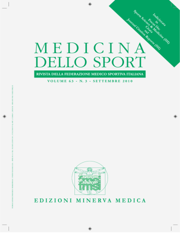 r ts rn al ta Ci ) SI a (I e at in zz ) ci n: ic SI di in O ed (I s In rts cu & M a Fo ce itat l epo e n ie C n on R Sc ti o Sp u Jo V O L U M E 6 3 - N. 3 - S E T T E M B R E 2 0 1 0 MEDICINA DELLO SPORT Rivista trimestrale della Federazione Medico-Sportiva Italiana. Continuazione di: Studi di Medicina e Chirurgia dello Sport, Medicina Sportiva Direttori G. SANTILLI - M. CASASCO Comitato Editoriale N. BACHL (Vienna) - F. BENAZZO (Pavia) - A. BIFFI (Roma) - M. BONIFAZI (Siena) - F. BOTRE’ (Roma) E. CASTELLACCI (Lucca) - P. CERRETELLI (Milano) - G. CERULLI (Perugia) - L. COIANA (Cagliari) - D. CORRADO (Padova) J. M. CUMMISKEY (Dublino) - A. DAL MONTE (Roma) - F. DE FERRARI (Brescia) - E. H. DE ROSE (Porto Alegre) H. H. DICKHUTH (Freiburg) - L. DI LUIGI (Roma) - P. E. DI PRAMPERO (Udine) - M. FAINA (Roma) - G. FANO’ (Chieti) C. FOTI (Roma) - S. GIANNINI (Roma) - C. G. GRIBAUDO (Torino) - G. LETIZIA MAURO (Palermo) L. MAGAUDDA (Messina) - P. P. MARIANI (Roma) - G. MASSAZZA (Torino) - L. MICHELI (Boston) - P. PARISI (Roma) S. PECORELLI (Brescia) - A. PELLICCIA (Roma) - F. PIGOZZI (Roma) - C. G. ROLF (Sheffield) - P. ROCHECONGARD (Renne) E. ROVELLI (Milano) - R. SALLIS ( Rancho Cucamonga, CA - USA) - F. SCHENA (Verona) - A. TODARO (Roma) G. C. TOPI (Roma) - C. TRANQUILLI (Roma) - A.G. UGAZIO (Roma) - A. VEICSTEINAS (Milano) - A. VIRU (Tartu) P. VOLPI (Milano) - P. ZEPPILLI (Roma) Comitato di Redazione A. BONETTI - E. DRAGO - S. DRAGONI - G. FRANCAVILLA Direttore Responsabile A. OLIARO This journal is PEER REVIEWED and is quoted in: Focus On: Sports Science & Medicine (ISI) - SPORT Database, SPORT Discus - BIOSIS La Rivista è citata nel Journal Citation Reports (ISI) con Impact Factor Direzione e Redazione: Federazione Medico-Sportiva Italiana - Viale Tiziano 70 - 00196 Roma. Ufficio grafico, ufficio pubblicità, fotocomposizione, amministrazione - Edizioni Minerva Medica - Corso Bramante 83-85 - 10126 Torino Tel. (011) 67.82.82 - Fax (011) 67.45.02 - E-mail: [email protected] Web Site: www.minervamedica.it Stampa - Edizioni Minerva Medica - Tipografia di Saluzzo - Corso IV Novembre 29-31 - 12037 Saluzzo (CN) - Tel. (0175) 249405 Fax (0175) 249407 Abbonamento annuo: Italia - Individuale: Cartaceo € 85,00, Cartaceo+Online € 90,00; Istituzionale: Cartaceo € 120,00, Online (Small € 230,00, Medium € 260,00, Large € 300,00, Extra Large € 315,00), Cartaceo+Online (Small € 240,00, Medium € 275,00, Large € 315,00, Extra Large € 330,00); il fascicolo € 35,00. Unione Europea - Individuale: Cartaceo € 145,00, Cartaceo+Online € 155,00; Istituzionale: Cartaceo € 225,00, Online (Small € 230,00, Medium € 260,00, Large € 300,00, Extra Large € 315,00), Cartaceo+Online (Small € 240,00, Medium € 275,00, Large € 315,00, Extra Large € 330,00); il fascicolo € 60,00. Paesi extraeuropei - Individuale: Cartaceo € 160,00, Cartaceo+Online € 170,00; Istituzionale: Cartaceo € 250,00, Online (Small € 255,00, Medium € 285,00, Large € 330,00, Extra Large € 345,00), Cartaceo+Online (Small € 265,00, Medium € 300,00, Large € 345,00, Extra Large € 360,00); il fascicolo € 70,00. Per il pagamento: 1) Gli abbonati possono utilizzare le seguenti forme di pagamento: a) assegno bancario; b) bonifico bancario a: Edizioni Minerva Medica, INTESA SANPAOLO Agenzia n. 18 Torino. IBAN: IT45 K030 6909 2191 0000 0002 917 c) conto corrente postale 00279109 intestato a Edizioni Minerva Medica, Corso Bramante 83-85, 10126 Torino; d) carte di credito Diners Club International, Master Card, VISA, American Express; 2) i soci devono contattare direttamente la Segreteria della Federazione I cambi di indirizzo di spedizione, e-mail o di qualsiasi altro dato di abbonamento vanno segnalati tempestivamente inviando i nuovi e vecchi dati per posta, fax, e-mail o direttamente sul sito www.minervamedica.it alla sezione “I tuoi abbonamenti - Contatta ufficio abbonamenti” I reclami per i fascicoli mancanti devono pervenire entro 6 mesi dalla data di pubblicazione del fascicolo - I prezzi dei fascicoli e delle annate arretrati sono disponibili su richiesta © Edizioni Minerva Medica - Torino 2010 Tutti i diritti sono riservati. Nessuna parte di questa pubblicazione può essere riprodotta, trasmessa e memorizzata in qualsiasi forma e con qualsiasi forma e con qualsiasi mezzo Pubblicazione trimestrale. Autorizzazione del Tribunale di Torino n. 1441 del 15-3-1961. Iscrizione nel registro nazionale della stampa di cui alla legge 5-8-1981 n. 416 art. 11 con il numero 00 148 vol. 2 foglio 377 in data 18-8-1982. Pubblicazione periodica trimestrale - Poste Italiane S.p.A. - Sped. in a.p. - D. L. 353/2003 (conv. in L. 27/02/2004 N° 46) art. 1, comma 1, DCB/CN FEDERAZIONE MEDICO-SPORTIVA ITALIANA Presidente Onorario: Giorgio SANTILLI CONSIGLIO DIRETTIVO Presidente Federale Maurizio CASASCO Vice Presidenti Luigi DI LUIGI Angelo GIGLIO Gabriele PETROLITO Consiglieri Federali Antonio FALCONIO - Luigi Maria FORMICA Vincenzo IERACITANO - Vincenzo LAMBERTI Clara MAURI - Aldo PASSELLI Prisco PETTI - Antonio PEZZANO Vincenzo RUSSO Segretario Generale f. f. Maurizio FORTIN COLLEGIO DEI REVISORI DEI CONTI Presidente Massimo CESSARI Componenti Delia GUERRERA - Eugenio CONTE Paola MILIZIA - Monica VECCHIATI NORME PER GLI AUTORI Norme generali Medicina dello Sport, rivista peer-reviewed della Federazione Medico Sportiva Italiana, pubblica articoli scientifici originali su argomenti di medicina dello sport. I manoscritti devono essere preparati seguendo rigorosamente le norme per gli Autori pubblicate in seguito, che sono conformi agli Uniform Requirements for Manuscripts Submitted to Biomedical Editors editi a cura dell’International Committee of Medical Journal Editors (Ann Int Med 1988;105:258-265). L’invio del dattiloscritto sottointende che il lavoro non sia già stato pubblicato e che, se accettato, non verrà pubblicato altrove né integralmente né in parte. Tutto il materiale iconografico de