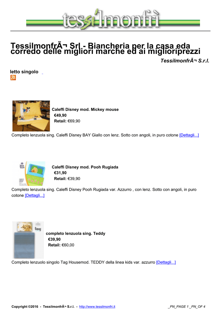 Tessilmonfrì Srl - Biancheria per la casa eda corredo delle migliori marche ed ai miglioriprezzi Tessilmonfrì S.r.l. letto singolo Caleffi Disney mod. Mickey mouse €49,90 Retail: €69,90 Completo lenzuola sing. Caleffi Disney BAY Giallo con lenz. Sotto con angoli, in puro cotone [Dettagli...] Caleffi Disney mod. Pooh Rugiada €31,90 Retail: €39,90 Completo lenzuola sing. Caleffi Disney Pooh Rugiada var. Azzurro , con lenz. Sotto con angoli, in puro cotone [Dettagli...] completo lenzuola sing. Teddy €39,90 Retail: €60,00 Completo lenzuolo singolo Tag Housemod. TEDDY della linea kids var. azzurro [Dettagli...] Copyright ©2016 - Tessilmonfrì S.r.l. - http://www.tessilmonfri.it _PN_PAGE 1 _PN_OF 4 Lenzuolo Anna Geddes mod. Cactus Pots €36,00 Retail: €45,00 Parure lenzuola sing. Happidea Anne geddes, Cactus pots 100% cotone italiano [Dettagli...] lenzuolo in flanella marmolada €27,00 Retail: €35,00 completo lenzuola Casamica in 100 % cotoneflanella mod. marmolada var giallo [Dettagli...] Lenzuolo sing. caleffi chromotherapy mod. Rubino €29,99 Retail: €50,50 completo lenzuola Caleffi coll. chrmotherapy var. rubino in puro cotone con sotto con angoli [Dettagli...] lenzuolo Zucchi Mod. SMART €39,90 Retail: €53,00 Completo lenzuola sing. zucchi clic clac mod. SMART con lenz. Sotto con angoli , in 100%cotone [Dettagli...] Lenzuolo Zucchi Mod. UNIT €29,90 Retail: €41,90 Parure lenzuola sing. zucchi tint unita rosa in 100%cotone [Dettagli...] Copyright ©2016 - Tessilmonfrì S.r.l. - http://www.tessilmonfri.it _PN_PAGE 2 _PN_OF 4 Missoni Mod. Mitchell in flanella €119,90 Retail: €132,00 completo lenzuola MIssoni mod. in flanella mod. Mitchell scozzese misura singolo [Dettagli...] Parure Zucchi Mod. SMART €29,90 Retail: €39,90 Parure lenzuola sing. zucchi clic clac mod. SMART con lenz. [Dettagli...] Tessitura Randi mod. FUEGO €76,90 Retail: €86,00 Completo lenzuola sing. Tessitura Randi, mod. FUego, con lenz. Sotto con angoli , in 100% cotone [Dettagli...] Zucchi Mod. Snoopy 7340 €44,90 Retail: €51,00 Completo lenzuola singolo zucchi mod. snoopy 7340con lenz. Sotto con angoli , in 100%cotone [Dettagli...] Copyright ©2016 - Tessilmonfrì S.r.l. - http://www.tessilmonfri.it _PN_PAGE 3 _PN_OF 4 • • • • • «« Inizio « Prec 1 Succ » Fine »» Risultati 1 - 12 di 12 Copyright ©2016 - Tessilmonfrì S.r.l. - http://www.tessilmonfri.it _PN_PAGE 4 _PN_OF 4