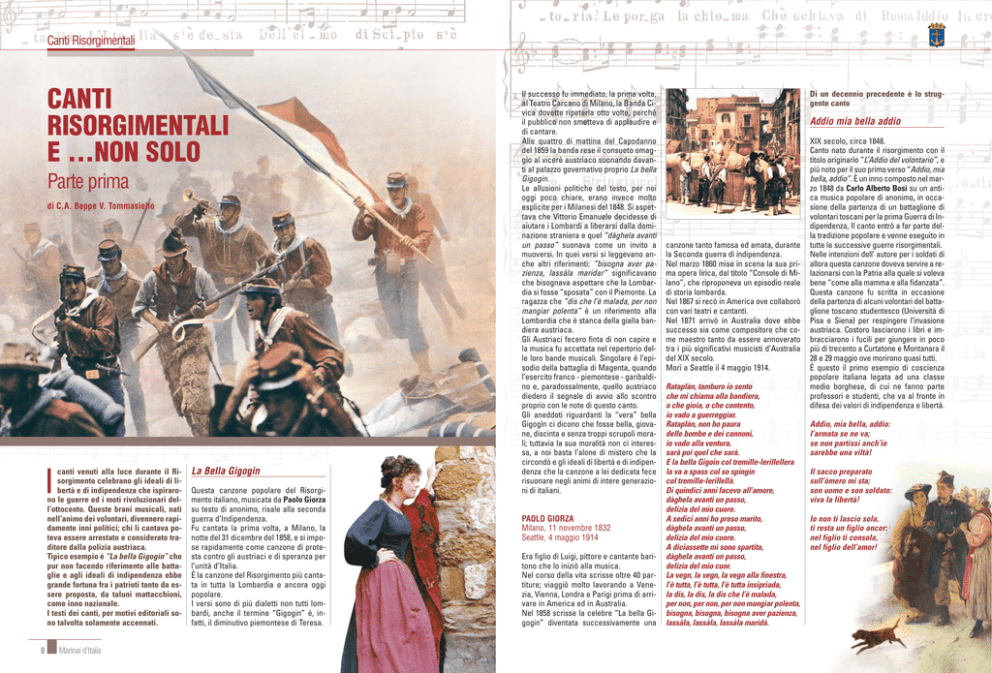 Canti Risorgimentali CANTI RISORGIMENTALI E …NON SOLO Parte prima di C.A. Beppe V. Tommasiello canti venuti alla luce durante il Risorgimento celebrano gli ideali di libertà e di indipendenza che ispirarono le guerre ed i moti rivoluzionari dell’ottocento. Queste brani musicali, nati nell’animo dei volontari, divennero rapidamente inni politici; chi li cantava poteva essere arrestato e considerato traditore dalla polizia austriaca. Tipico esempio è “La bella Gigogin” che pur non facendo riferimento alle battaglie e agli ideali di indipendenza ebbe grande fortuna fra i patrioti tanto da essere proposta, da taluni mattacchioni, come inno nazionale. I testi dei canti, per motivi editoriali sono talvolta solamente accennati. I 8 Marinai d’Italia La Bella Gigogìn Questa canzone popolare del Risorgimento italiano, musicata da Paolo Giorza su testo di anonimo, risale alla seconda guerra d’Indipendenza. Fu cantata la prima volta, a Milano, la notte del 31 dicembre del 1858, e si impose rapidamente come canzone di protesta contro gli austriaci e di speranza per l’unità d’Italia. È la canzone del Risorgimento più cantata in tutta la Lombardia e ancora oggi popolare. I versi sono di più dialetti non tutti lombardi, anche il termine “Gigogin” è, infatti, il diminutivo piemontese di Teresa. Il successo fu immediato, la prima volta, al Teatro Carcano di Milano, la Banda Civica dovette ripeterla otto volte, perché il pubblico non smetteva di applaudire e di cantare. Alle quattro di mattina del Capodanno del 1859 la banda rese il consueto omaggio al vicerè austriaco suonando davanti al palazzo governativo proprio La bella Gigogin. Le allusioni politiche del testo, per noi oggi poco chiare, erano invece molto esplicite per i Milanesi del 1848. Si aspettava che Vittorio Emanuele decidesse di aiutare i Lombardi a liberarsi dalla dominazione straniera e quel “dàghela avanti un passo” suonava come un invito a muoversi. In quei versi si leggevano anche altri riferimenti: “bisogna aver pazienza, lassàla maridar” significavano che bisognava aspettare che la Lombardia si fosse “sposata” con il Piemonte. La ragazza che “dis che l’è malada, per non mangiar polenta” è un riferimento alla Lombardia che è stanca della gialla bandiera austriaca. Gli Austriaci fecero finta di non capire e la musica fu accettata nel repertorio delle loro bande musicali. Singolare è l’episodio della battaglia di Magenta, quando l’esercito franco - piemontese - garibaldino e, paradossalmente, quello austriaco diedero il segnale di avvio allo scontro proprio con le note di questo canto. Gli aneddoti riguardanti la “vera” bella Gigogìn ci dicono che fosse bella, giovane, discinta e senza troppi scrupoli morali; tuttavia la sua moralità non ci interessa, a noi basta l’alone di mistero che la circondò e gli ideali di libertà e di indipendenza che la canzone a lei dedicata fece risuonare negli animi di intere generazioni di italiani. PAOLO GIORZA Milano, 11 novembre 1832 Seattle, 4 maggio 1914 Era figlio di Luigi, pittore e cantante baritono che lo iniziò alla musica. Nel corso della vita scrisse oltre 40 partiture; viaggiò molto lavorando a Venezia, Vienna, Londra e Parigi prima di arrivare in America ed in Australia. Nel 1858 scrisse la celebre “La bella Gigogin” diventata successivamente una Di un decennio precedente è lo struggente canto Addio mia bella addio canzone tanto famosa ed amata, durante la Seconda guerra di indipendenza. Nel marzo 1860 mise in scena la sua prima opera lirica, dal titolo “Console di Milano”, che riproponeva un episodio reale di storia lombarda. Nel 1867 si recò in America ove collaborò con vari teatri e cantanti. Nel 1871 arrivò in Australia dove ebbe successo sia come compositore che come maestro tanto da essere annoverato tra i più significativi musicisti d’Australia del XIX secolo. Morì a Seattle il 4 maggio 1914. Rataplàn, tamburo io sento che mi chiama alla bandiera, o che gioia, o che contento, io vado a guerreggiar. Rataplàn, non ho paura delle bombe e dei cannoni, io vado alla ventura, sarà poi quel che sarà. E la bella Gigoin col tremille-lerillellera la va a spass col so spingìn col tremille-lerillellà. Di quindici anni facevo all’amore, dàghela avanti un passo, delizia del mio cuore. A sedici anni ho preso marito, dàghela avanti un passo, delizia del mio cuore. A diciassette mi sono spartita, dàghela avanti un passo, delizia del mio cuor. La vegn, la vegn, la vegn alla finestra, l’è tutta, l’è tutta, l’è tutta insipriada, la dis, la dis, la dis che l’è malada, per non, per non, per non mangiar polenta, bisogna, bisogna, bisogna aver pazienza, lassàla, lassàla, lassàla maridà. XIX secolo, circa 1848. Canto nato durante il risorgimento con il titolo originario “L’Addio del volontario”, e più noto per il suo primo verso “Addio, mia bella, addio”. È un inno composto nel marzo 1848 da Carlo Alberto Bosi su un antica musica popolare di anonimo, in occasione della partenza di un battaglione di volontari toscani per la prima Guerra di Indipendenza, Il canto entrò a far parte della tradizione popolare e venne eseguito in tutte le successive guerre risorgimentali. Nelle intenzioni dell’ autore per i soldati di allora questa canzone doveva servire a relazionarsi con la Patria alla quale si voleva bene “come alla mamma e alla fidanzata”. Questa canzone fu scritta in occasione della partenza di alcuni volontari del battaglione toscano studentesco (Università di Pisa e Siena) per respingere l’invasione austriaca. Costoro lasciarono i libri e imbracciarono i fucili per giungere in poco più di trecento a Curtatone e Montanara il 28 e 29 maggio ove morirono quasi tutti. È questo il primo esempio di coscienza popolare italiana legata ad una classe medio borghese, di cui ne fanno parte professori e studenti, che va al fronte in difesa dei valori di indipendenza e libertà. Addio, mia 