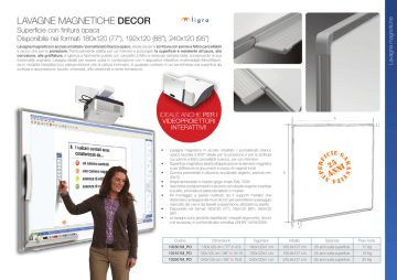 Lavagne magnetiche LAVAGNE MAGNETICHE DECOR Superficie con finitura opaca Disponibile nei formati 180x120 (77”), 192x120 (88”), 240x120 (95”) Lavagna magnetica in acciaio smaltato / porcellanato bianco opaco, ideale sia per la scrittura con penne a feltro cancellabili a secco che per la proiezione. Particolarmente adatta per usi intensivi e prolungati; la superficie è resistente all’usura, alla corrosione, alle graffiature, è igienica e facilmente pulibile con cancellini a feltro e resta per sempre bella, conservando la sua funzionalità originaria. Lavagna ideale per essere usata in combinazione con il dispositivo interattivo multimediale MimioTeach, sia in modalità interattiva (con videoproiettore) che di cattura inchiostro, in qualsiasi contesto in cui sia richiesta una superficie da scrittura e da proiezione: scuole, università, uffici direzionali e centri formazione. IDEALE ANCHE PER I VIDEOPROIETTORI INTERATTIVI! • • • • • E RF UP B 1 Codice IC IE G 25 NI AN ANT • Lavagna magnetica in acciaio smaltato / porcellanato bianco opaco lavorata a 800° ideale per la proiezione e per la scrittura con penne a feltro cancellabili a secco, per uso intensivo Superficie magnetica adatta all’applicazione di elementi magnetici e per l’affissione di documenti a mezzo di magneti tondi Cornice perimetrale in alluminio anodizzato argento, sezione mm 20x10 Angoli arrotondati in moplen grigio chiaro RAL 7035 Vaschetta portapennarelli in alluminio anodizzato argento inseribile a scatto, provvista di paracolpi laterali in moplen Kit montaggio a parete costituito da 4 supporti metallici che distanziano la lavagna dal muro di 2cm per permettere il passaggio nascosto dei cavi e da tasselli a espansione utilizzabili su parete Disponibile nei formati 180x120 (77”), 192x120 (88”), 240x120 (95”) Le lavagne sono prodotte rispettando i requisiti ergonomici, tecnici e di sicurezza, in conformità alla normativa UNI EN 14434/2005 AR • 2 IT A S • A 4 Dimensionii Ingombro Imballo Garanzia Peso lordo 102301M_PO 180x120 cm / 77” in 4:3 182x122x1 cm 165,6x127 cm 25 anni sulla superficie 17 Kg 103101M_PO 192x120 cm / 88” in 16:10 192x122x1 cm 195,6x127 cm 25 anni sulla superficie 19 Kg 103501M_PO 240x120 cm / 95” in 16:9 242x122x1 cm 245,6x127 cm 25 anni sulla superficie 25 Kg