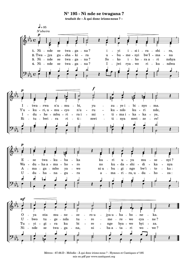 N° 195 - Ni nde se twagana ? traduit de « À qui donc irions-nous ? » = 85 N'ubwira p 1. 2. 3. 4. Ni Twa Ni Ni p I Y'u I Ri p E Wa A U mf O U Tu Ni nde jya nde nde se gu se se twa sha twa twa ga ki ga ga twa ku du tu rwa ri, u he bwi n'u mu mbu ra mu cyo ri ri bi, n'u ra i ti : se du ma du twa ha a ga ha ku ma mbo na ba ho ya gu ka ro we ra na ? ra na ? na ? i u So I yi bu ko jwi i me i rya si i nyi ho we ra bw'I ra a ri shi ma ri ku ra, na nshya ndwa f yu ru mi mwi zu ku ti ti ye i ndo ma i nya bi ku ka mwi nyo ri ka ze ma. nde, ye, re! ku no ni u a ri ku bu ma u da gi ri yu shi ngo ra, u mu di bw'i du se ka te ho nyi ? nya ka : za : ya bwo yi nde nta tu gi se mu ge ra twa ne nda ku ga ze tu bi na, ro u re re ni jya u me nge ba a ha re bya ta bo we we ri ne cya byi wo ka. ne ? za. we ? Mètres : 67.66.D - Mélodie : À qui donc irions-nous ? - Hymnes et Cantiques n°195 mis en pdf par www.cantiquest.org