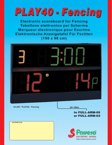 PLAY40 - Fencing Electronic scoreboard for Fencing Tabellone elettronico per Scherma Marqueur électronique pour Escrime Elektronische Anzeigetafel Für Fechten (150 x 98 cm) Art.847 PLAY40 - Fencing till 100m to FULL-ARM-05 or FULL-ARM-03 DISTRIBUTOR R ELECTRONIC DESIGN http://www.favero.com ENGLISH PLAY40 - FENCING Art. 847 FUNCTIONING PLAY40 - FENCING ITALIANO Art. 847 FUNZIONAMENTO It is used in the fencing matchs, it repeats the FULL-ARM-03 or FULL-ARM-05 mains indications to allow their visibility to a longer distance; it is connected to a serial output of them by telephonic cable in endowment, long 15m but extensible till 100m. Utilizzato negli incontri di scherma, ripete le principali indicazioni del FULL-ARM-05 o del FULL-ARM-03 per consentirne la visibilità ad una maggiore distanza; viene collegato all’uscita seriale di questi mediante il cavo telefonico fornito in dotazione, lungo 15m ma allungabile fino a 100m. VISUALISATIONS VISUALIZZAZIONI SCORER: YELLOW TAG: PRIORITY: CHRONOMETER: MATCH NUMBER: from 0 to 99 each side. 30cm of digits height, visible up to 90m and beyond. yellow bright dot on both sides. ‘P’ letter on each side, 20cm height and visible up to 60m and above. maximum time of 9 minutes and 59 seconds. 30cm of digits height, visibility up to 90m and above. The color of two bright points between minutes and seconds shows in a clear and immediate way the timer status: GREEN=counting, RED=stopped. from 0 to 3, or out. 20cm of digit height and legibility till 60m and beyond. INSTALLATION: Very simple because, after to have inserted the power plug and connected the FULL-ARM-03 or FULL-ARM-05, the scoreboard is ready to use. It is supplied with suitable thin chains that allow, not only an easy fixing to wall or at ceiling, but also the possibility to change the inclination to the best possible visibility. CABINET: Strong metal container, black dust painted. Transparent and antireflex front panel. DIMENSIONS: width 150cm, height 98cm, depth 7cm. WEIGHT: 34,5kg. SERIAL CABLE LENGTH: 15m. POWER SUPPLY: 230V, 120VA max. It is also available the 115V version. WARRANTY: two years. PLAY40 - FENCING FONCTIONNEMENT Art. 847 C’est employé dans les compétitions d’escrime, il répéte les majeurs indications du FULL-ARM-03 or FULL-ARM-05 pour permettre la visibilité au plus longue distance; il est joint au sortie sérielle de ceux au moyen d’un câble téléphonique inclus, d’une longeur de 15m mais allongeable jusqu’à 100m. VISUALISATIONS COMPTE-TOUCHES: CARTON JAUNE: PRIORITÉ : CHRONOMÈ TRE: NOMBRE DE MATCH: CARTELLINO GIALLO: PRIORITA’: CRONOMETRO: NUMERO MATCH: da 0 a 99 per lato. Altezza delle cifre di 30cm e leggibilità fino a 90m ed oltre punto luminoso giallo su entrambi i lati. lettera ‘P’ su ogni lato, di altezza 20cm e leggibile fino a 60m ed oltre. tempo massimo di 9 minuti e 59 secondi. Altezza delle cifre di 30cm e leggibilità fino a 90m ed oltre. Il colore dei due punti luminosi tra minuti e secondi indica in modo c h i a r o e d immediato lo stato del cronometro: VERDE=conteggio, ROSSO=stop. cifra da 0 a 3, oppure spenta. Altezza della cifra di 20cm e leggibilità fino a 60m ed oltre. CARATTERISTICHE CHARACTERISTICS FRANÇAIS CONTASTOCCATE: de 0 à 99 par côté. Hauteur des chiffres 30cm, lisibles jusqu’à 90m et au-delà. point lumineux jaune sur les deux côtés. une lettre ‘P’ par côté, de hauteur 20cm et lisible jusqu’à 60m et au-delà. au maximum de 9 minutes et 59 secondes. Hauteur des chiffres de 30cm et lisibilité jusqu’à 90m et au-delà. La couleur des deux points lumineux situés entre les minutes et les secondes indique de façon claire et immédiate l’état du choronomètre: VERT=comptage, ROUGE=stop. de 0 à 3, ou éteint. Hauteur du chiffre de 20cm et lisibilité jusqu’à 60m et outre. INSTALLAZIONE: Molto semplice in quanto, dopo aver inserito la spina di alimentazione e collegato il FULL-ARM-05 o il FULL-ARM-03, il tabellone è già pronto. Viene fornito di apposite catenelle di sostegno, che permettono non solo un facile fissaggio a parete o a soffitto, ma anche la possibilità di regolarne facilmente l’inclinazione per ottenere una visibilità ideale. CONTENITORE: Robusto contenitore in metallo, verniciato a polvere nera. Lastra frontale trasparente antiriflesso. DIMENSIONI: larghezza 150cm, altezza 98cm, spessore 7cm. PESO: 34,5kg. LUNGHEZZA CAVO SERIALE: 15m. ALIMENTAZIONE: 230V, 120VA max. Disponibile anche la versione per 115V. GARANZIA: due anni. INSTALLATION: Très simple parce que, après avoir branché la fiche d’alimentation et unis le FULL-ARM-03 ou le FULL-ARM-05, le tableau d’affichage est dejà en fonction. Il est fourni avec des chaînes d’accrochage, qui permettent non seulement una facile fixation aux parois ou au plafond, mais qui aussi donnent la possibilité de régler aisément son inclinaison pour obtenir une vision idéale. BOÎ TIER: Robuste en métal, coloré avec de la peinture en poudre noir. Panneau frontal transparent et antireflet. DIMENSIONS: largeur 150cm, hauteur 98cm, épaisseur 7cm. POIDS: 34,5kg. LONGUEUR DU CÂ BLE SÉ RIEL: 15m. ALIMENTATION: 230V, 120VA max. Disponible aussi dans la version 115V. GARANTIE: deux ans. Art. 847 BETRIEB Bei Gebrauch bei Fechtkämpfen werden die wichtigsten Angaben von FULL-ARM-05 oder von FULL-ARM-03 wiederholt, um eine Sichtbarkeit auf eine weitere Distanz zu erlauben; das Gerät wird an deren seriellen Ausgang angeschlossen, und zwar mittels des mitgelieferten, 15 m langen Telefonkabels, das bis auf 100 m verlängert werden kann. SICHTBARMACHEN TREFFERANZEIGE: GELBE KARTE: PRIORITÄ T: STOPPUHR: MATCH-ZÄ HLER: CARACTERISTIQUES PLAY40 - FENCING DEUTSCH von 0 bis 99 pro Seite. Höhe der Ziffern 30cm, lesbar bis zu 90m und mehr. Gelbe Leuchtpunkt auf der Seite der betreffenden Mannschaft, oder ausgeschaltet. Eine Letter ‘P’ pro Seite. Höhe 20cm, lesbar bis zu 60m und mehr. Maximal 9 Minuten und 59 Sekunden. Ziffernhö