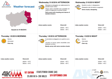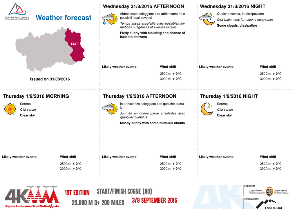 Wednesday 31/8/2016 AFTERNOON Weather forecast Abbastanza soleggiato con addensamenti e possibili locali rovesci Temps assez ensoleillé avec possibles formations nuageuses et averses locales Wednesday 31/8/2016 NIGHT Qualche nuvola, in dissipazione Dissipation des formations nuageuses Some clouds, dissipating Fairly sunny with clouding and chance of isolated showers Likely weather events: Sereno Thursday 1/9/2016 AFTERNOON In prevalenza soleggiato con qualche cumulo Ciel serein Journée en bonne partie ensoleillée avec quelques cumulus Clear sky Likely weather events: 2500m: > 0◦ C 3000m: > 0◦ C Issued on 31/08/2016 Thursday 1/9/2016 MORNING Wind-chill Wind-chill 2500m: > 0◦ C 3000m: > 0◦ C Thursday 1/9/2016 NIGHT Sereno Ciel serein Clear sky Mostly sunny with some cumulus clouds Likely weather events: Wind-chill 2500m: > 0◦ C 3000m: > 0◦ C Likely weather events: Wind-chill 2500m: > 0◦ C 3000m: > 0◦ C Likely weather events: Wind-chill 2500m: > 0◦ C 3000m: > 0◦ C