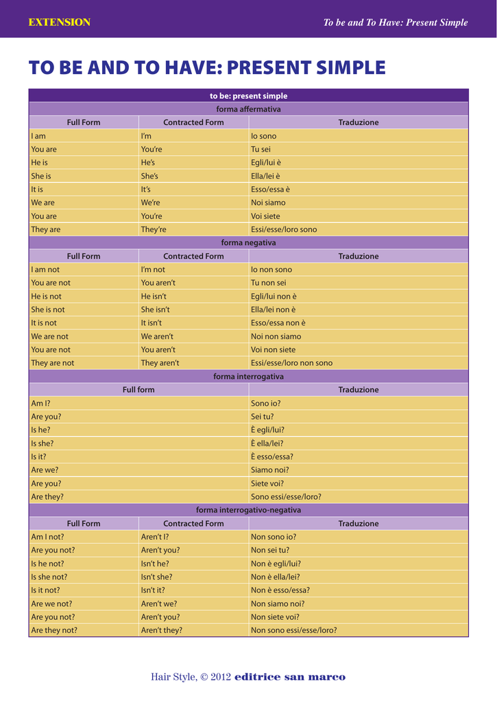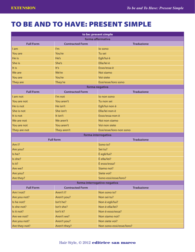 EXTENSION To be and To Have: Present Simple to be and to have: present simple to be: present simple forma affermativa Full Form Contracted Form Traduzione I am I’m Io sono You are You’re Tu sei He is He’s Egli/lui è She is She’s Ella/lei è It is It’s Esso/essa è We are We’re Noi siamo You are You’re Voi siete They are They’re Essi/esse/loro sono forma negativa Full Form Contracted Form Traduzione I am not I’m not Io non sono You are not You aren’t Tu non sei He is not He isn’t Egli/lui non è She is not She isn’t Ella/lei non è It is not It isn’t Esso/essa non è We are not We aren’t Noi non siamo You are not You aren’t Voi non siete They are not They aren’t Essi/esse/loro non sono forma interrogativa Full form Traduzione Am I? Sono io? Are you? Sei tu? Is he? È egli/lui? Is she? È ella/lei? Is it? È esso/essa? Are we? Siamo noi? Are you? Siete voi? Are they? Sono essi/esse/loro? forma interrogativo-negativa Full Form Contracted Form Traduzione Am I not? Aren’t I? Non sono io? Are you not? Aren’t you? Non sei tu? Is he not? Isn’t he? Non è egli/lui? Is she not? Isn’t she? Non è ella/lei? Is it not? Isn’t it? Non è esso/essa? Are we not? Aren’t we? Non siamo noi? Are you not? Aren’t you? Non siete voi? Are they not? Aren’t they? Non sono essi/esse/loro? Hair Style, © 2012 editrice san marco EXTENSION To be and To Have: Present Simple to have: present simple forma affermativa Full Form Contracted Form Italiano I have (got) I’ve (got) Io ho You have (got) You’ve (got) Tu hai He has (got) He’s got Egli/lui ha She has (got) She’s got Ella/lei ha It has (got) It’s got Esso/essa ha We have (got) We’ve (got) Noi abbiamo You have (got) You’ve (got) Voi avete They have (got) They’ve (got) Essi/esse/loro hanno forma negativa Full Form Contracted Form Italiano I have not (got) I haven’t (got) Io non ho You have not (got) You haven’t (got) Tu non hai He has not (got) He hasn’t (got) Egli/lui non ha She has not (got) She hasn’t (got) Ella/lei non ha It has not (got) It hasn’t (got) Esso/essa non ha We have not (got) We haven’t (got) Noi non abbiamo You have not (got) You haven’t (got) Voi non avete They have not (got) They haven’t (got) Essi/esse/loro non hanno forma interrogativa Full form Italiano Have I (got)? Ho io? Have you (got)? Hai tu? Has he (got)? Ha egli/lui? Has she (got)? Ha ella/lei? Has it (got)? Ha esso/essa? Have we (got)? Abbiamo noi? Have you (got)? Avete voi? Have they (got)? Hanno essi/esse/loro? forma interrogativo-negativa Full Form Contracted Form Italiano Have I not (got)? Haven’t I (got)? Non ho io? Have you not (got)? Haven’t you (got)? Non hai tu? Has he not (got)? Hasn’t he (got)? Non ha egli/lui? Has she not (got)? Hasn’t she (got)? Non ha ella/lei? Has it not (got)? Hasn’t it (got)? Non ha esso/essa? Have we not (got)? Haven’t we (got)? Non abbiamo noi? Have you not (got)? Haven’t you (got)? Non avete voi? Have they not (got)? Haven’t they (got)? Non hanno essi/esse/loro? Hair Style, © 2012 editrice san marco